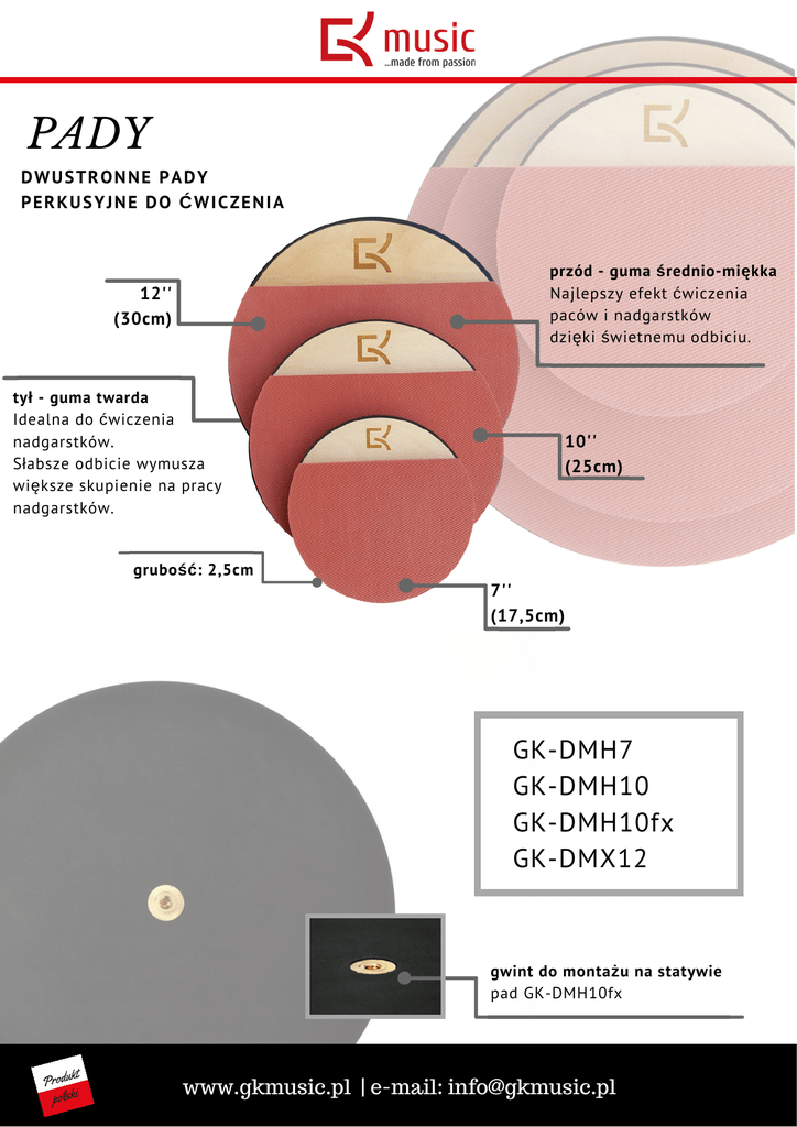 PADY DWUSTRONNE PADY PERKUSYJNE DO ĆWICZENIA przód - guma średnio-miękka Najlepszy efekt ćwiczenia paców i nadgarstków dzięki świetnemu odbiciu. 12'' (30cm) tył - guma twarda Idealna do ćwiczenia nadgarstków. Słabsze odbicie wymusza większe skupienie na pracy nadgarstków. grubość: 2,5cm 10'' (25cm) 7'' (17,5cm) GK-DMH7 GK-DMH10 GK-DMH10fx GK-DMX12 gwint do montażu na statywie pad GK-DMH10fx www.gkmusic.pl | e-mail: [email protected] RÓZGI WYKONANE RĘCZNIE ZE SPECJALNIE SELEKCJONOWANEGO BAMBUSA Gumki do regulacji twardości końcówki pałki, a zarazem głośności grania. Dodatkowe wzmocnienie rim-shot zapewnia dłuższą żywotność pałek. Elastyczne wykończenie uchwytu zapewnia lepsze trzymanie pałki i zapobiega jej wyślizgnięciu z ręki. nazwa modelu BEAT - GK-B CONTROL - GK-C długość: 410mm średnica pałki: 12mm średnica uchwytu: 16mm uchwyt: aluminium waga: 60g IMPACT - GK-I długość: 410mm średnica pałki: 13mm średnica uchwytu: 17mm uchwyt: aluminium waga: 65g LONG IMPACT - GK-LI długość: 410mm średnica pałki: 13mm średnica uchwytu: 17mm uchwyt: aluminium waga: 65g długość: 410mm średnica pałki: 13mm średnica uchwytu: 17mm uchwyt: aluminium waga: 70g www.gkmusic.pl | e-mail: [email protected] WALLOP - GK-W LONG WALLOP - GK-LW długość: 420mm średnica pałki: 14mm średnica uchwytu: 17mm uchwyt: pcv waga: 55g długość: 420mm średnica pałki: 14mm średnica uchwytu: 17mm uchwyt: pcv waga: 60g STRIKE - GK-S długość: 410mm średnica pałki: 12mm średnica uchwytu: 16mm uchwyt: aluminium waga: 55g Signature SŁAWOMIR BERNY RÓZGI SYGNOWANE GK-SSB1B GK-SSB4B długość: 410mm średnica pałki: 17mm średnica uchwytu: 18,5mm uchwyt: pcv waga: 65g długość: 410mm średnica pałki: 17mm średnica uchwytu: 18,5mm uchwyt: pcv waga: 70g www.gkmusic.pl | e-mail: [email protected] SHAKERY GK-SRS brzmienie: "medium high sound" długość: 16cm średnica: 5cm WYKONANE Z MOSIĄDZU I ALUMINIUM GK-SPS brzmienie: "high warm tone" długość: 16cm średnica: 4cm GK-SPSalu brzmienie: jasne, bardzo selektywne długość: 16cm średnica: 4cm CYMBAL SKULL NAKRĘTKI NA STATYWY PERKUSYJNE DWA METALIZOWANE KOLORY: SILVER I BRONZE GK-CS2S GK-CS3S GK-CS2B GK-CS3B gwint: 8mm www.gkmusic.pl | e-mail: [email protected] PODUSZKI PODUSZKI TŁUMIĄCE DO BĘBNA BASOWEGO 4 rzepy do swobodnego przyczepienia poduszki do wewnętrznego korpusu bębna 8 rzepów do zmiany kształtu i wielkości poduszki tkanina zewnętrzna: bawełna wypełnienie: sztuczne 2 rzepy do przyklejenia do wewnętrznego korpusu bębna Zaprojektowana i uszyta w Polsce. DRUM PILLOW ART GK-DP DRUM PILLOW BLACK GK-DPB www.gkmusic.pl | e-mail: [email protected]