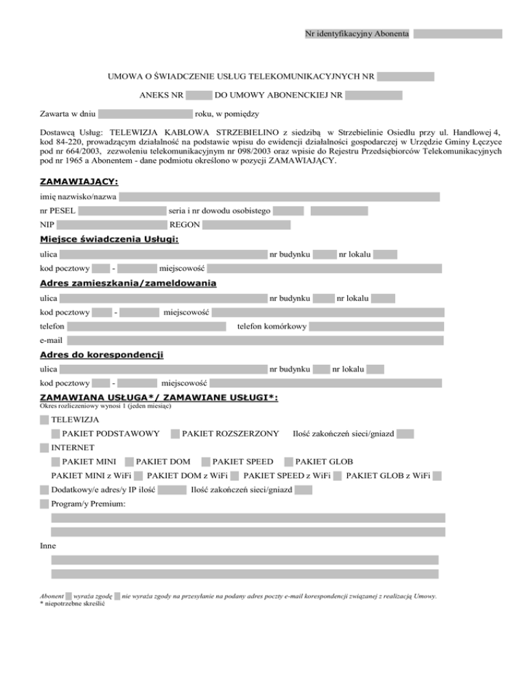 Nr identyfikacyjny Abonenta ………………………… UMOWA O ŚWIADCZENIE USŁUG TELEKOMUNIKACYJNYCH NR …………..…… ANEKS NR ……… DO UMOWY ABONENCKIEJ NR …………..…… Zawarta w dniu …………..…………….… roku, w pomiędzy Dostawcą Usług: TELEWIZJA KABLOWA STRZEBIELINO z siedzibą w Strzebielinie Osiedlu przy ul. Handlowej 4, kod 84-220, prowadzącym działalność na podstawie wpisu do ewidencji działalności gospodarczej w Urzędzie Gminy Łęczyce pod nr 664/2003, zezwoleniu telekomunikacyjnym nr 098/2003 oraz wpisie do Rejestru Przedsiębiorców Telekomunikacyjnych pod nr 1965 a Abonentem - dane podmiotu określono w pozycji ZAMAWIAJĄCY. ZAMAWIAJĄCY: imię nazwisko/nazwa …………………………………………………………………………………… …… …. nr PESEL ………………………… seria i nr dowodu osobistego ……… NIP ……………………… …………..…… … REGON ………………………… Miejsce świadczenia Usługi: ulica ………………………………………………………..…… nr budynku … … nr lokalu … … kod pocztowy … -… … miejscowość … ……………… . … Adres zamieszkania/zameldowania ulica ………………………………………………………..…… nr budynku …..… nr lokalu …,,,… kod pocztowy … -… … miejscowość … ………………………………………… ………………...…… telefon ……………………………………………… telefon komórkowy … ……………………………… … .. e-mail ….………………………………………………… …..… … Adres do korespondencji ulica ………………………………………………………..…… nr budynku …… nr lokalu …… kod pocztowy … -… … miejscowość ……………………………………………… ……………...… … ZAMAWIANA USŁUGA*/ ZAMAWIANE USŁUGI*: Okres rozliczeniowy wynosi 1 (jeden miesiąc) … TELEWIZJA … PAKIET PODSTAWOWY … PAKIET ROZSZERZONY Ilość zakończeń sieci/gniazd …… … INTERNET … PAKIET MINI … PAKIET DOM … PAKIET SPEED … PAKIET GLOB PAKIET MINI z WiFi … PAKIET DOM z WiFi … PAKIET SPEED z WiFi … PAKIET GLOB z WiFi … … Dodatkowy/e adres/y IP ilość … … Ilość zakończeń sieci/gniazd …… … Program/y Premium: ………………………………………………………….…………………………………………………….…… ………………………………………………………….…………………………………………………..…… Inne ………………………………………………………….…………………………………………………..…… ………………………………………………………….…………………………………………………..…… Abonent … wyraża zgodę … nie wyraża zgody na przesyłanie na podany adres poczty e-mail korespondencji związanej z realizacją Umowy. * niepotrzebne skreślić §1 Na czas trwania niniejszej Umowy DOSTAWCA USŁUG oddaje do używania Abonentowi, na zasadach określonych w Regulaminie, /modem kablowy/ dekoder – STB, dekoder Programu Premium, Kartę Dostępu Warunkowego / lub inne urządzenie abonenckie o numerze seryjnym wymienionym w Protokole Przekazania Sprzętu, stanowiącym integralną część Umowy. §2 Abonent oświadcza, że przy zawarciu niniejszej Umowy doręczony mu został Regulamin Świadczenia Usług Telekomunikacyjnych przez TELEWIZJĘ KABLOWĄ STRZEBIELINO i zobowiązuje się przestrzegać zasad w nim określonych, a Strony uzgadniają, że wymieniony Regulamin stanowi integralną część niniejszej Umowy. Abonent również oświadcza, że został mu doręczony aktualny Cennik Świadczenia Usług. Aktualny Cennik można ponadto otrzymać w Biurze Obsługi Abonenta. Dodatkowo Abonent otrzymuje Protokół Przekazania Sprzętu oraz stosowny Regulamin Promocji. §3 Zawierając niniejszą Umowę Abonent oświadcza, że posiada tytuł prawny do Lokalu (w rozumieniu zapisów Regulaminu), w którym usługi określone w niniejszej Umowie mają być świadczone, przy czym w przypadku utraty tytułu prawnego do Lokalu, Abonent jest zobowiązany niezwłocznie powiadomić o tym DOSTAWCĘ USŁUG. W przypadku niedotrzymania tego obowiązku wszelką korespondencję wysłaną pod wskazany adres uważa się za doręczoną. §4 Przedstawiciele DOSTAWCY USŁUG dokonujący przyłączeń lub przedstawiciele handlowi DOSTAWCY USŁUG nie są uprawnieni do pobierania od Abonenta jakichkolwiek opłat w imieniu DOSTAWCY USŁUG. §5 1. Umowa została zawarta na okres 24 m-cy, z możliwością jej rozwiązania przez każdą ze stron z uprzednim trzymiesięcznym okresem wypowiedzenia, ze skutkiem na koniec miesiąca kalendarzowego, przy czym wypowiedzenie umowy przez DOSTAWCĘ USŁUG może nastąpić wyłącznie z ważnych przyczyn określonych w wypowiedzeniu. 2. Po upływie terminu wskazanym w pkt. 1 okres obowiązywania niniejszej umowy zostaje przedłużony o kolejne 24 miesiące chyba, że którakolwiek ze Stron przed upływem trzech miesięcy przed terminem wskazanym w pkt. 1 złoży drugiej Stronie oświadczenie o nie przedłużaniu umowy. W takim przypadku umowa ulegnie rozwiązaniu w terminie wskazanym w pkt. 1 3. Abonentowi przysługuje prawo do zmiany warunków świadczenia usług/i. Wniosek należy złożyć pisemnie w Biurze Obsługi Abonenta. Powiadomienie Abonenta o zmianie warunków świadczenia Usług nastąpi pocztą elektroniczną bądź drogą pisemną o ile nie stoją temu na przeszkodzie możliwości techniczne. Zmiana warunków świadczenia Usług/i następuje z chwilą rozpoczęcia świadczenia Usług/i w zmienionym zakresie. §6 Zakres obsługi serwisowej obejmuje instalację, aktywację, zmiany pakietów, konfigurację Urządzeń Abonenckich udostępnianych Ab