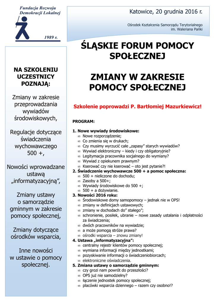 20 grudnia 2016 r. RozwiązaniaKatowice, informatyczne Ośrodek Kształcenia Samorządu Terytorialnego im. Waleriana Pańki ŚLĄSKIE FORUM POMOCY SPOŁECZNEJ NA SZKOLENIU UCZESTNICY POZNAJĄ: Zmiany w zakresie przeprowadzania wywiadów środowiskowych, Regulacje dotyczące świadczenia wychowawczego 500 +, Nowości wprowadzane ustawą „informatyzacyjną”, Zmiany ustawy o samorządzie gminnym w zakresie pomocy społecznej, Zmiany dotyczące ośrodków wsparcia, Inne nowości w ustawie o pomocy społecznej. ZMIANY W ZAKRESIE POMOCY SPOŁECZNEJ Szkolenie poprowadzi P. Bartłomiej Mazurkiewicz! PROGRAM: 1. Nowe wywiady środowiskowe: • Nowe rozporządzenie; • Co zmienia się w drukach; • Czy musimy wyrzucić całe „zapasy” starych wywiadów? • Wywiad elektroniczny – kiedy i czy obligatoryjnie? • Legitymacja pracownika socjalnego do wymiany? • Wywiad z opiekunem prawnym? • Kserować czy nie kserować – oto jest pytanie?! 2. Świadczenie wychowawcze 500 + a pomoc społeczna: • 500 + nieliczone do dochodu; • Zasoby a 500+; • Wywiady środowiskowe do 500 +; • 500 + a dożywianie. 3. Nowości 2016 roku: • Środowiskowe domy samopomocy – jednak nie w OPS! • zmiany w definicjach ustawowych; • zmiany w dochodach do” stałego”; • schronienie, posiłek, ubranie – nowe zasady ustalania i odpłatności za świadczenia; • dwóch pracowników na wywiadzie; • a może pomogą stróże prawa? • ośrodki wsparcia – znowu zmiany! 4. Ustawa „informatyzacyjna”: • centralny rejestr klientów pomocy społecznej; • wymiana informacji między jednostkami; • pozyskiwanie informacji o świadczeniobiorcach; • elektroniczne oświadczenia. 5. Zmiana ustawy o samorządzie gminnym: • czy grozi nam powrót do przeszłości? • OPS już nie samodzielny? • łączenie jednostek pomocy społecznej; • placówki wsparcia dziennego – razem czy osobno!? ADRESACI SZKOLE NIA: członkowie Śląskiego Forum Pomocy Społecznej, kierownicy i pracownicy jednostek organizacyjnych pomocy społecznej, wszystkie osoby realizujące zadania w zakresie pomocy społecznej. DANE DO KONTAKTU: Ośrodek Kształcenia Samorządu Terytorialnego im. Waleriana Pańki 40-014 Katowice ul. Mariacka 1 NIP: 522-000-18-95 Tel 32 259 86 73, 32 253 84 09 Fax. 32 259 86 73 w. 22, 26 e-mail: [email protected] www.okst.pl OSOBA DO KONTAKTU: Barbara Tekień tel. 32 206 80 39, 32 206 98 43 w. 25 [email protected] KOD SZKOLENIA MIEJSCE SZKOLENIA: Katowice, siedziba Ośrodka, ul. Mariacka 1, II piętro. Mapkę dojazdu do miejsca szkolenia znajdą na www.okst.pl/dojazd TERMIN SZKOLENIA: 20 grudnia 2016 r., godz. 10.00 – 15.00 CENA: 339 zł netto/os. Udział w szkoleniu zwolniony z VAT w przypadku finansowania szkolenia ze środków publicznych. Cena zawiera materiały szkoleniowe, zaświadczenie o ukończeniu szkolenia, poczęstunek i serwis kawowy. RABAT 50% dla członków Śląskiego Forum Pomocy Społecznej ZGŁOSZENIA: Wypełnioną kartę zgłoszenia należy przesłać mailem lub faksem lub poprzez formularz na www.okst.pl do 12 grudnia 2016 r. Katowice 1287/16/T Nazwa nabywcy (dane do faktury) Adres nabywcy (ulica, nr domu, kod pocztowy, miejscowość) NIP Państwo Telefon Email 1. Imię i nazwisko uczestnika, stanowisko 2. Imię i nazwisko uczestnika, stanowisko 3. Imię i nazwisko uczestnika, stanowisko Oświadczam, że szkolenie dla ww. pracowników jest kształceniem zawodowym finansowanym w całości lub co najmniej 70% ze środków publicznych (proszę zaznaczyć właściwe) Członek FORUM (proszę zaznaczyć właściwe) UWAGA Ilość miejsc ograniczona. O udziale w szkoleniu decyduje kolejność zgłoszeń. Zgłoszenie na szkolenie musi zostać potwierdzone przesłaniem do Ośrodka karty zgłoszenia (mail, fax lub formularz na www.okst.pl). Brak pisemnej rezygnacji ze szkolenia najpóźniej na trzy dni robocze przed terminem będzie równoznaczny z obciążeniem Państwa należnością za to szkolenie niezależnie od przyczyn rezygnacji. Płatność należy uregulować przelewem przed lub po szkoleniu (na przelewie prosimy podać nazwę szkolenia lub jego kod). NR RACHUNKU: BPH: 68-10600076-0000321000197618 TAK ☐ NIE ☐ TAK ☐ NIE ☐ PODPIS