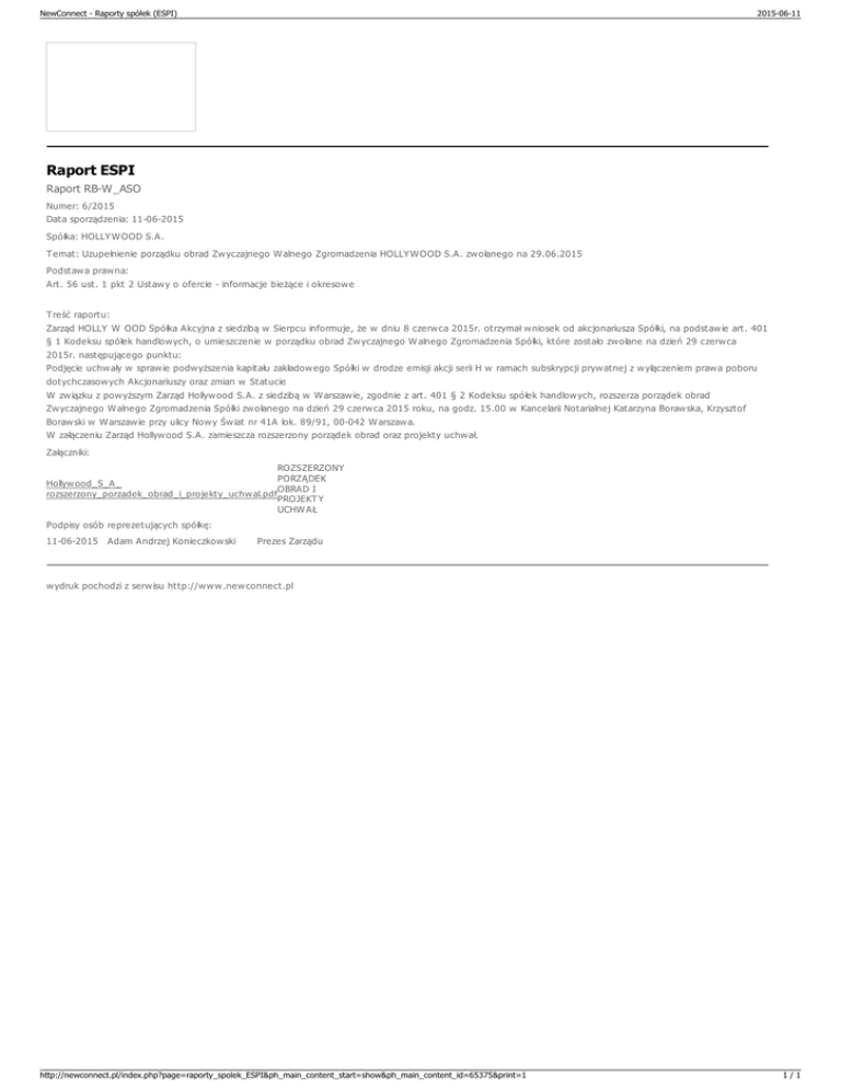 NewConnect - Raporty spółek (ESPI) 2015-06-11 Raport ESPI Raport RB-W_ASO Numer: 6/2015 Data sporządzenia: 11-06-2015 Spółka: HOLLYW OOD S.A. Temat: Uzupełnienie porządku obrad Zw yczajnego W alnego Zgromadzenia HOLLYW OOD S.A. zw ołanego na 29.06.2015 Podstaw a praw na: Art. 56 ust. 1 pkt 2 Ustaw y o ofercie - informacje bieżące i okresow e Treść raportu: Zarząd HOLLY W OOD Spółka Akcyjna z siedzibą w Sierpcu informuje, że w dniu 8 czerw ca 2015r. otrzymał w niosek od akcjonariusza Spółki, na podstaw ie art. 401 § 1 Kodeksu spółek handlow ych, o umieszczenie w porządku obrad Zw yczajnego W alnego Zgromadzenia Spółki, które zostało zw ołane na dzień 29 czerw ca 2015r. następującego punktu: Podjęcie uchw ały w spraw ie podw yższenia kapitału zakładow ego Spółki w drodze emisji akcji serii H w ramach subskrypcji pryw atnej z w yłączeniem praw a poboru dotychczasow ych Akcjonariuszy oraz zmian w Statucie W zw iązku z pow yższym Zarząd Hollyw ood S.A. z siedzibą w W arszaw ie, zgodnie z art. 401 § 2 Kodeksu spółek handlow ych, rozszerza porządek obrad Zw yczajnego W alnego Zgromadzenia Spółki zw ołanego na dzień 29 czerw ca 2015 roku, na godz. 15.00 w Kancelarii Notarialnej Katarzyna Boraw ska, Krzysztof Boraw ski w W arszaw ie przy ulicy Now y Św iat nr 41A lok. 89/91, 00-042 W arszaw a. W załączeniu Zarząd Hollyw ood S.A. zamieszcza rozszerzony porządek obrad oraz projekty uchw ał. Załączniki: ROZSZERZONY PORZĄDEK Hollyw ood_S_A_ I rozszerzony_porzadek_obrad_i_projekty_uchw al.pdfOBRAD PROJEKTY UCHW AŁ Podpisy osób reprezetujących spółkę: 11-06-2015 Adam Andrzej Konieczkow ski Prezes Zarządu w ydruk pochodzi z serw isu http://w w w .new connect.pl http://newconnect.pl/index.php?page=raporty_spolek_ESPI&ph_main_content_start=show&ph_main_content_id=65375&print=1 1/1