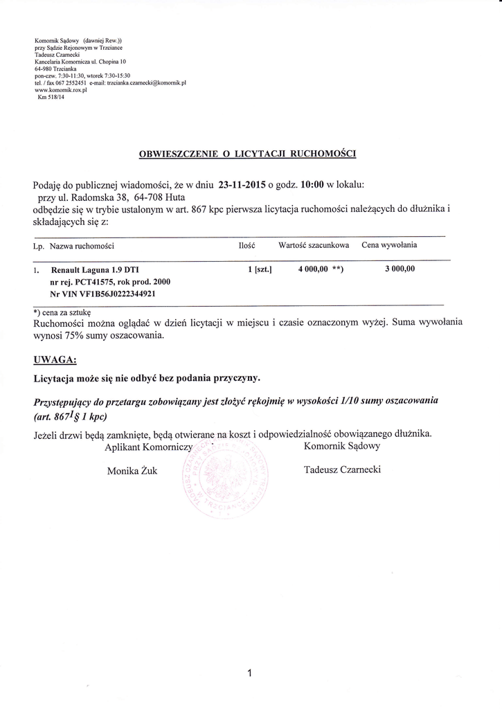 Komomik Sądowy (dawniej Rew')) przy Sądzie Rejonow1m w Trzciance Tadeusz Czamecki Kancelaria Komomica ul. Chopina 10 64-980 Trzcianka pon-cil. 7:30-1 I :30, wtorek 7:30-15:30 tel. I fax 067 255245 w.komomik.rox.pl Km I e-mail: [email protected] 5lsil4 OBWIESZCZENIE O LICYTACJI RUCHOMOSCI Podaję do publicznej wiadomości, Że w dniu 23-l1-20ls o godz.10:00 w lokalu: przy vl. Radomska 38, 64-708 Huta odbędzie się w trybie ustalonym w art. 867 kpc pięrwsza licytacja ruchomości należących do dłużnikai składających się z: Ilość Lp. Nazrva ruchomości 1. Renault Laguna 1.9 DTI nr rej. PCT41575, rok prod. 2000 1 Wartośćszacunkowa Cena wywołania [szt.] 4 000,00 **) 3 000'00 Nr VIN VF1B56J0222344921 *) cena za srtukę Ruchomościmożna oglądać w dzień licytacji w miejscu wynosi 7 5%o sumy oszacowania. i czasie oznaczonym wyŻej. Suma wywołania UWAGA: Licytacja może się nie odbyć bez podaniaprryczyny. Przystępujqcy do przetargu zobowiqzany jest złożyćrękojmię w wysokości1/10 Sumy oszacowania (art.86715 1 kpc) Jezeli drzwi będą zamknięte, będą otwierane na koszt i odpowiedzialnośÓ obowiązanego dłuŹnika. KomornikSądowy AplikantKomorniczy '': Monika Zuk .'':' Tadeusz Czamecki