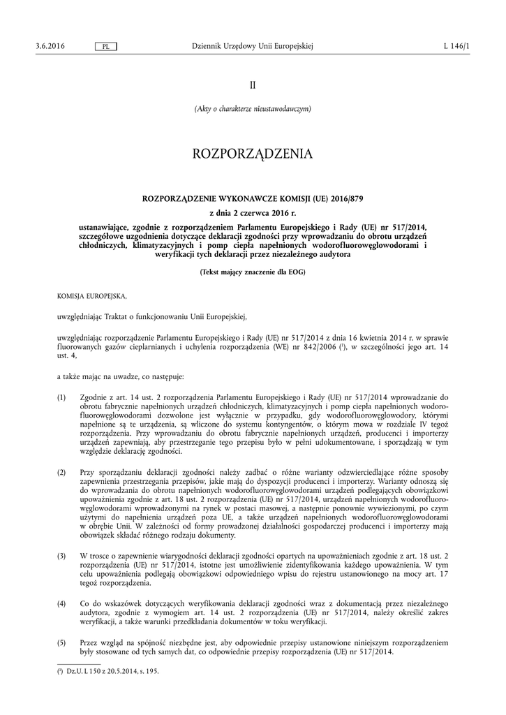3.6.2016 Dziennik Urzędowy Unii Europejskiej PL L 146/1 II (Akty o charakterze nieustawodawczym) ROZPORZĄDZENIA ROZPORZĄDZENIE WYKONAWCZE KOMISJI (UE) 2016/879 z dnia 2 czerwca 2016 r. ustanawiające, zgodnie z rozporządzeniem Parlamentu Europejskiego i Rady (UE) nr 517/2014, szczegółowe uzgodnienia dotyczące deklaracji zgodności przy wprowadzaniu do obrotu urządzeń chłodniczych, klimatyzacyjnych i pomp ciepła napełnionych wodorofluorowęglowodorami i weryfikacji tych deklaracji przez niezależnego audytora (Tekst mający znaczenie dla EOG) KOMISJA EUROPEJSKA, uwzględniając Traktat o funkcjonowaniu Unii Europejskiej, uwzględniając rozporządzenie Parlamentu Europejskiego i Rady (UE) nr 517/2014 z dnia 16 kwietnia 2014 r. w sprawie fluorowanych gazów cieplarnianych i uchylenia rozporządzenia (WE) nr 842/2006 (1), w szczególności jego art. 14 ust. 4, a także mając na uwadze, co następuje: (1) Zgodnie z art. 14 ust. 2 rozporządzenia Parlamentu Europejskiego i Rady (UE) nr 517/2014 wprowadzanie do obrotu fabrycznie napełnionych urządzeń chłodniczych, klimatyzacyjnych i pomp ciepła napełnionych wodoro fluorowęglowodorami dozwolone jest wyłącznie w przypadku, gdy wodorofluorowęglowodory, którymi napełnione są te urządzenia, są wliczone do systemu kontyngentów, o którym mowa w rozdziale IV tegoż rozporządzenia. Przy wprowadzaniu do obrotu fabrycznie napełnionych urządzeń, producenci i importerzy urządzeń zapewniają, aby przestrzeganie tego przepisu było w pełni udokumentowane, i sporządzają w tym względzie deklarację zgodności. (2) Przy sporządzaniu deklaracji zgodności należy zadbać o różne warianty odzwierciedlające różne sposoby zapewnienia przestrzegania przepisów, jakie mają do dyspozycji producenci i importerzy. Warianty odnoszą się do wprowadzania do obrotu napełnionych wodorofluorowęglowodorami urządzeń podlegających obowiązkowi upoważnienia zgodnie z art. 18 ust. 2 rozporządzenia (UE) nr 517/2014, urządzeń napełnionych wodorofluoro węglowodorami wprowadzonymi na rynek w postaci masowej, a następnie ponownie wywiezionymi, po czym użytymi do napełnienia urządzeń poza UE, a także urządzeń napełnionych wodorofluorowęglowodorami w obrębie Unii. W zależności od formy prowadzonej działalności gospodarczej producenci i importerzy mają obowiązek składać różnego rodzaju dokumenty. (3) W trosce o zapewnienie wiarygodności deklaracji zgodności opartych na upoważnieniach zgodnie z art. 18 ust. 2 rozporządzenia (UE) nr 517/2014, istotne jest umożliwienie zidentyfikowania każdego upoważnienia. W tym celu upoważnienia podlegają obowiązkowi odpowiedniego wpisu do rejestru ustanowionego na mocy art. 17 tegoż rozporządzenia. (4) Co do wskazówek dotyczących weryfikowania deklaracji zgodności wraz z dokumentacją przez niezależnego audytora, zgodnie z wymogiem art. 14 ust. 2 rozporządzenia (UE) nr 517/2014, należy określić zakres weryfikacji, a także warunki przedkładania dokumentów w toku weryfikacji. (5) Przez wzgląd na spójność niezbędne jest, aby odpowiednie przepisy ustanowione niniejszym rozporządzeniem były stosowane od tych samych dat, co odpowiednie przepisy rozporządzenia (UE) nr 517/2014. (1) Dz.U. L 150 z 20.5.2014, s. 195. L 146/2 PL (6) Dziennik Urzędowy Unii Europejskiej 3.6.2016 Środki przewidziane w niniejszym rozporządzeniu są zgodne z opinią komitetu ustanowionego na podstawie art. 24 rozporządzenia (UE) nr 517/2014, PRZYJMUJE NINIEJSZE ROZPORZĄDZENIE: Artykuł 1 Deklaracja zgodności 1. Importerzy i producenci urządzeń chłodniczych, klimatyzacyjnych i pomp ciepła napełnionych wodorofluorowęg lowodorami („urządzenia”) sporządzają deklaracje zgodności, o których mowa w art. 14 rozporządzenia (UE) nr 517/2014 przy użyciu wzoru określonego w załączniku I do niniejszego rozporządzenia. Deklarację zgodności podpisuje przedstawiciel prawny producenta lub importera urządzeń. 2. W przypadku przywozu urządzeń, o których mowa w art. 1, importer gwarantuje udostępnienie kopii deklaracji zgodności organom celnym z chwilą przedłożenia im zgłoszenia celnego związanego z dopuszczeniem do swobodnego obrotu w Unii. 3. Deklaracja zgodności może się odnosić do upoważnienia, o którym mowa w art. 18 rozporządzenia (UE) nr 517/2014, o ile upoważnienie zostało należycie wpisane do rejestru ustanowionego na mocy art. 17 tegoż rozporzą dzenia. Artykuł 2 Dokumentacja 1. W każdym przypadku wprowadzania do obrotu w Unii napełnionych wodorofluorowęglowodorami urządzeń producent sporządza następującą dokumentację przewidzianą w art. 14 rozporządzenia (UE) nr 517/2014: a) deklarację zgodności; b) pełną listę urządzeń wraz z łączną ilością w kg każdego typu wodorofluorowęglowodorów zawartych w urządzeniach; lista nie jest wymagana w przypadku, gdy producent może wykazać, że wodorofluorowęglowodory zawarte w urządzeniach zostały wprowadzone do obrotu w Unii, zanim napełniono nimi urządzenia; c) w przypadku wodorofluorowęglowodorów dostarczonych przez inne przedsiębiorstwo w Unii, fakturę lub potwier dzenie dostawy wodorofluorowęglowodorów uprzednio wprowadzonych do obrotu w Unii; d) w przypadku zawartych w urządzeniach wodorofluorowęglowodorów przywiezionych i dopuszczonych do swobodnego obrotu na terenie Unii przez producenta urządzeń przed ich napełnieniem, odpowiednie dokumenty celne wykazujące, że zawarte w urządzeniach ilości wodorofluorowęglowodorów zostały dopuszczone do swobodnego obrotu w Unii; e) w przypadku zawartych w urządzeniach wodorofluorowęglowodorów przywiezionych przez producenta, lecz nie dopuszczonych do swobodnego obrotu na terenie Unii przed napełnieniem nimi urządzeń, dowód dopełnienia wymaganych procedur celnych w celu dopuszczenia przedmiotowych ilości wodorofluorowęglowodorów do swobodnego obrotu w Unii w momencie wprowadzania urządzeń do ob