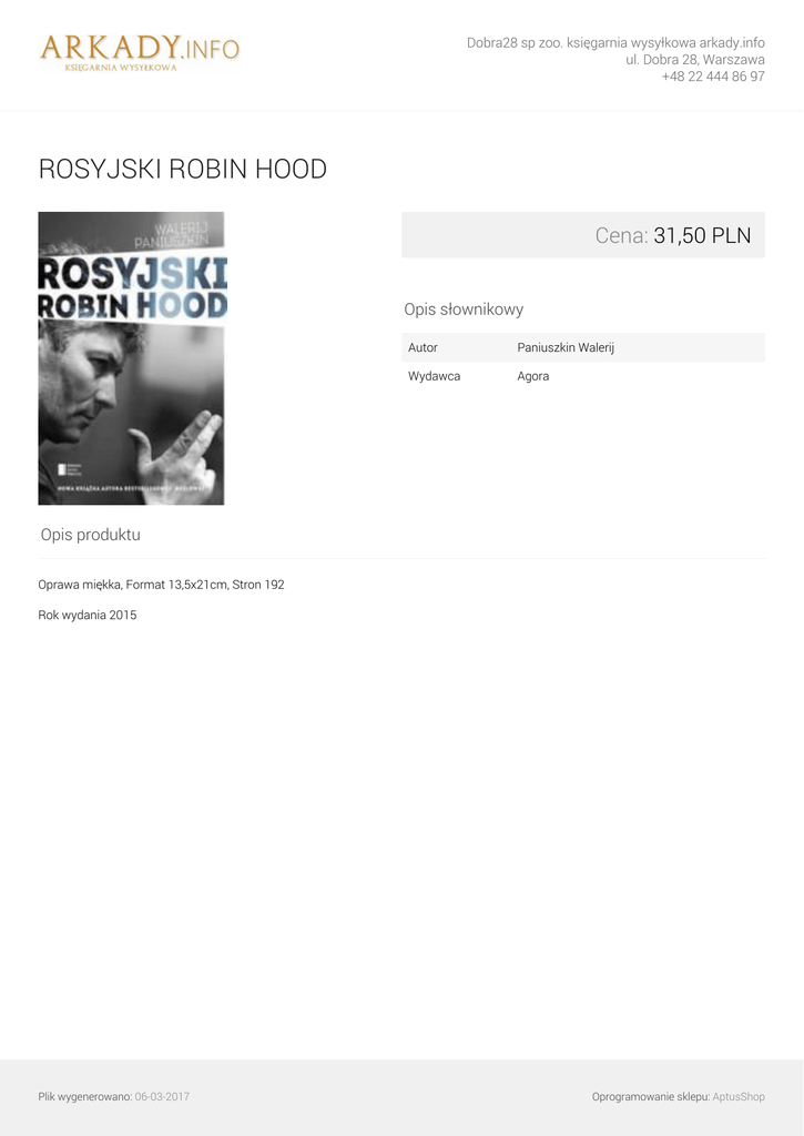 Dobra28 sp zoo. księgarnia wysyłkowa arkady.info ul. Dobra 28, Warszawa +48 22 444 86 97 ROSYJSKI ROBIN HOOD Cena: 31,50 PLN Opis słownikowy Autor Paniuszkin Walerij Wydawca Agora Opis produktu Oprawa miękka, Format 13,5x21cm, Stron 192 Rok wydania 2015 Plik wygenerowano: 06-03-2017 Powered by TCPDF (www.tcpdf.org) Oprogramowanie sklepu: AptusShop