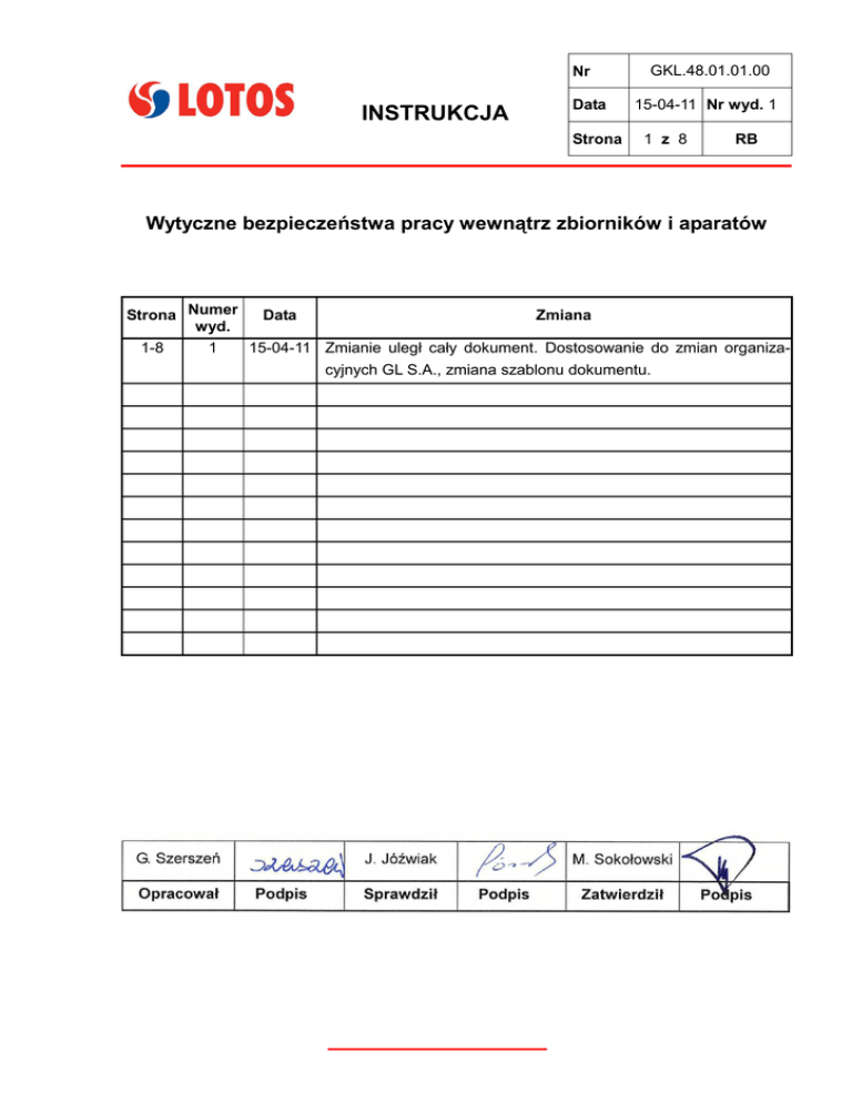 Nr INSTRUKCJA Data Strona GKL.48.01.01.00 15-04-11 Nr wyd. 1 1 z 8 RB Wytyczne bezpieczeństwa pracy wewnątrz zbiorników i aparatów Data Zmiana Strona Numer wyd. 1-8 1 15-04-11 Zmianie uległ cały dokument. Dostosowanie do zmian organizacyjnych GL S.A., zmiana szablonu dokumentu. Nr GKL.48.01.01.00 Wytyczne bezpieczeństwa pracy Data 15-04-11 Nr wyd. 1 wewnątrz zbiorników i aparatów Strona 2 z 8 RB 1. CEL Celem niniejszej instrukcji jest zapewnienie takiej organizacji, przygotowania i prowadzenia prac wewnątrz zbiorników i aparatów, aby wykonywana praca była bezpieczna. 2. ZAKRES STOSOWANIA Instrukcja odnosi się do wszystkich prac wymagających wejścia do wszelkiego rodzaju zbiorników, rurociągów i aparatów, zwanych dalej zbiornikami i aparatami. Instrukcja ma zastosowanie do prac wykonywanych na terenie: a) Grupy LOTOS S.A. w Gdańsku – tj. przy ul. Elbląskiej 135 oraz na terenie ujęcia wody w Przejazdowie, przy ul. Benzynowej, b) spółki LOTOS Kolej sp. z o.o., przy ul. Michałki 25 w Gdańsku, c) instalacji Grupy LOTOS S.A. zlokalizowanych poza Gdańskiem. 3. DOKUMENTY ZWIĄZANE Procedura nr GKL.48.01.00.00 Instrukcja nr GKL.48.01.03.00 Zasady postępowania przy wykonywaniu prac w oparciu o pisemne zezwolenia Analiza Bezpieczeństwa Pracy Rozporządzenie Ministra Gospodarki Przestrzennej i Budownictwa z 01.10.1993r. w sprawie bezpieczeństwa i higieny pracy przy eksploatacji, remontach i konserwacji sieci kanalizacyjnych (Dz. U. Nr 96, poz. 437 z 1993r.) 4. DEFINICJE Prace wewnątrz zbiorników i aparatów 5. prace w zbiornikach, kanałach, studniach, studzienkach kanalizacyjnych, wnętrzach urządzeń technicznych i w innych zamkniętych przestrzeniach, do których wejście odbywa się przez włazy lub otwory o niewielkich rozmiarach lub jest w inny sposób utrudnione. ODPOWIEDZIALNOŚĆ Wystawiający zezwolenie, jest odpowiedzialny za: • przygotowanie zbiornika lub aparatu do wykonania w nim pracy, • wystawienie zezwolenia, • wyznaczenie osoby nadzorującej prace. Wykonawca prac jest odpowiedzialny za: • uzyskanie zezwolenia, • nadzorowanie prac wewnątrz zbiorników i aparatów wykonywanych przez pracowników, Nr GKL.48.01.01.00 Wytyczne bezpieczeństwa pracy Data 15-04-11 Nr wyd. 1 wewnątrz zbiorników i aparatów Strona 3 z 8 RB • opracowanie Analizy Bezpieczeństwa Pracy wymaganej procedurą nr GKL.48.01.00.00 Zasady postepowania przy wykonywaniu prac w oparciu o pisemne zezwolenia. • przeprowadzenie instruktaŜu pracowników wykonujących prace w zbiorniku/aparacie, • wyznaczenie pracowników asekurujących. Pracownik nadzorujący jest odpowiedzialny za: • okresowe (zgodne z treścią zezwolenia) sprawdzanie sposobu wykonywania prac oraz miejsca wykonywania prac, • sprawdzenie stanu zabezpieczeń, za wykonanie których odpowiedzialny jest wystawiający zezwolenie. Pracownik asekurujący jest odpowiedzialny za: • stały kontakt z pracownikami przebywającymi w zbiorniku lub aparacie, • udzielanie, w razie potrzeby, pomocy osobom przebywającym wewnątrz zbiornika lub aparatu. 6. OPIS POSTĘPOWANIA 6.1 Informacje ogólne 6.1.1 6.1.2 W czasie wykonywania prac w kanalizacji stosuje się zapisy Rozporządzenia Ministra Gospodarki Przestrzennej i Budownictwa z 01.10.1993r. w sprawie bezpieczeństwa i higieny pracy przy eksploatacji, remontach i konserwacji sieci kanalizacyjnych (Dz. U. Nr 96, poz. 437 z 1993r.). W sytuacjach nieregulowanych rozporządzeniem zastosowanie mają zapisy instrukcji. Prace wewnątrz zbiorników i aparatów naleŜy wykonywać przy okresowym nadzorze przez wyznaczonego pracownika ze strony wystawiającego zezwolenie i przy stałym nadzorze mistrza lub brygadzisty ze strony Wykonawcy, zaleŜnie od stopnia zagroŜe- 6.1.3 6.1.4 6.1.5 nia i złoŜoności pracy. W Analizie Bezpieczeństwa Pracy lub w wystawionym, zgodnie z procedurą nr GKL.48.01.00.00, pisemnym zezwoleniu na pracę musi być określone, kto – wystawiający zezwolenie czy wykonawca – jest odpowiedzialny za wykonanie konkretnych zabezpieczeń. Pracownik lub pracownicy wykonujący pracę wewnątrz zbiornika powinni być asekurowani co najmniej przez jedną osobę znajdującą się na zewnątrz. Osoba asekurująca powinna być w stałym kontakcie z pracownikami znajdującymi się wewnątrz zbiornika oraz mieć moŜliwość niezwłocznego powiadomienia innych osób mogących, w razie potrzeby, niezwłocznie udzielić pomocy. JeŜeli zachodzi konieczność pracy w sprzęcie ochrony dróg oddechowych (aparat butlowy ze spręŜonym powietrzem, maska z doprowadzeniem świeŜego powietrza), pra- Nr GKL.48.01.01.00 Wytyczne bezpieczeństwa pracy Data 15-04-11 Nr wyd. 1 wewnątrz zbiorników i aparatów Strona 4 z 8 RB 6.1.6 6.1.7 cownicy powinni posiadać aktualne zezwolenie lekarza na prace w takim sprzęcie oraz być przeszkoleni z jego obsługi. Do pracy w zbiornikach i aparatach nie mogą być dopuszczeni pracownicy młodociani, staŜyści i praktykanci. Przebywanie w zbiorniku i aparacie, a takŜe przy włazach osobom niezwiązanym z wykonywaną pracą i jej kontrolą jest zabronione. 6.2 Techniczne i organizacyjne przygotowanie prac wewnątrz zbiorników i aparatów 6.2.1 Pracownicy wyznaczeni do wejścia i prowadzenia prac wewnątrz zbiorników i aparatów muszą być szczegółowo pouczeni o zakresie i sposobie wykonania wyznaczonej pracy oraz o zastosowanych środkach bezpieczeństwa. Mistrz Wykonawcy (lub kompetentny pracownik wyznaczony przez Wykonawcę) przeprowadza instruktaŜ, który obejmuje następujące elementy: 6.2.2 6.2.3 • zakres prac do wykonania, • zapisy zawarte w Analizie Bezpieczeństwa Pracy, • sposób sygnalizacji pomiędzy pracującymi wewnątrz zbiornika, a asekurującymi ich na zewnątrz zbiornika, • postępowanie w razie wystąpienia zagroŜenia. Zapoznanie pracowników powyŜszymi wymaganiami musi być potwierdzone na piśmie. Zbiorniki i aparaty, w których mogą występować gazy, pary, ciecze i ciała stałe o w