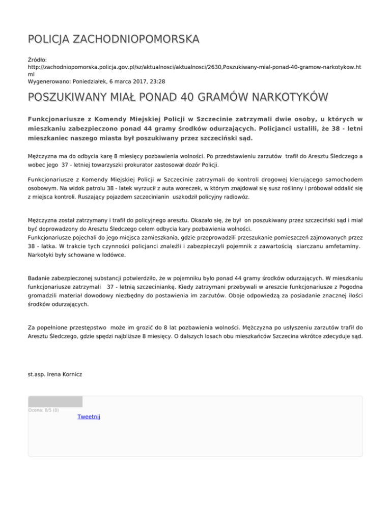 POLICJA ZACHODNIOPOMORSKA Źródło: http://zachodniopomorska.policja.gov.pl/sz/aktualnosci/aktualnosci/2630,Poszukiwany-mial-ponad-40-gramow-narkotykow.ht ml Wygenerowano: Poniedziałek, 6 marca 2017, 23:28 POSZUKIWANY MIAŁ PONAD 40 GRAMÓW NARKOTYKÓW Funkcjonariusze z Komendy Miejskiej Policji w Szczecinie zatrzymali dwie osoby, u których w mieszkaniu zabezpieczono ponad 44 gramy środków odurzających. Policjanci ustalili, że 38 - letni mieszkaniec naszego miasta był poszukiwany przez szczeciński sąd. Mężczyzna ma do odbycia karę 8 miesięcy pozbawienia wolności. Po przedstawieniu zarzutów trafił do Aresztu Śledczego a wobec jego 37 - letniej towarzyszki prokurator zastosował dozór Policji. Funkcjonariusze z Komendy Miejskiej Policji w Szczecinie zatrzymali do kontroli drogowej kierującego samochodem osobowym. Na widok patrolu 38 - latek wyrzucił z auta woreczek, w którym znajdował się susz roślinny i próbował oddalić się z miejsca kontroli. Ruszający pojazdem szczecinianin uszkodził policyjny radiowóz. Mężczyzna został zatrzymany i trafił do policyjnego aresztu. Okazało się, że był on poszukiwany przez szczeciński sąd i miał być doprowadzony do Aresztu Śledczego celem odbycia kary pozbawienia wolności. Funkcjonariusze pojechali do jego miejsca zamieszkania, gdzie przeprowadzili przeszukanie pomieszczeń zajmowanych przez 38 - latka. W trakcie tych czynności policjanci znaleźli i zabezpieczyli pojemnik z zawartością siarczanu amfetaminy. Narkotyki były schowane w lodówce. Badanie zabezpieczonej substancji potwierdziło, że w pojemniku było ponad 44 gramy środków odurzających. W mieszkaniu funkcjonariusze zatrzymali 37 - letnią szczeciniankę. Kiedy zatrzymani przebywali w areszcie funkcjonariusze z Pogodna gromadzili materiał dowodowy niezbędny do postawienia im zarzutów. Oboje odpowiedzą za posiadanie znacznej ilości środków odurzających. Za popełnione przestępstwo może im grozić do 8 lat pozbawienia wolności. Mężczyzna po usłyszeniu zarzutów trafił do Aresztu Śledczego, gdzie spędzi najbliższe 8 miesięcy. O dalszych losach obu mieszkańców Szczecina wkrótce zdecyduje sąd. st.asp. Irena Kornicz Ocena: 0/5 (0) Tweetnij