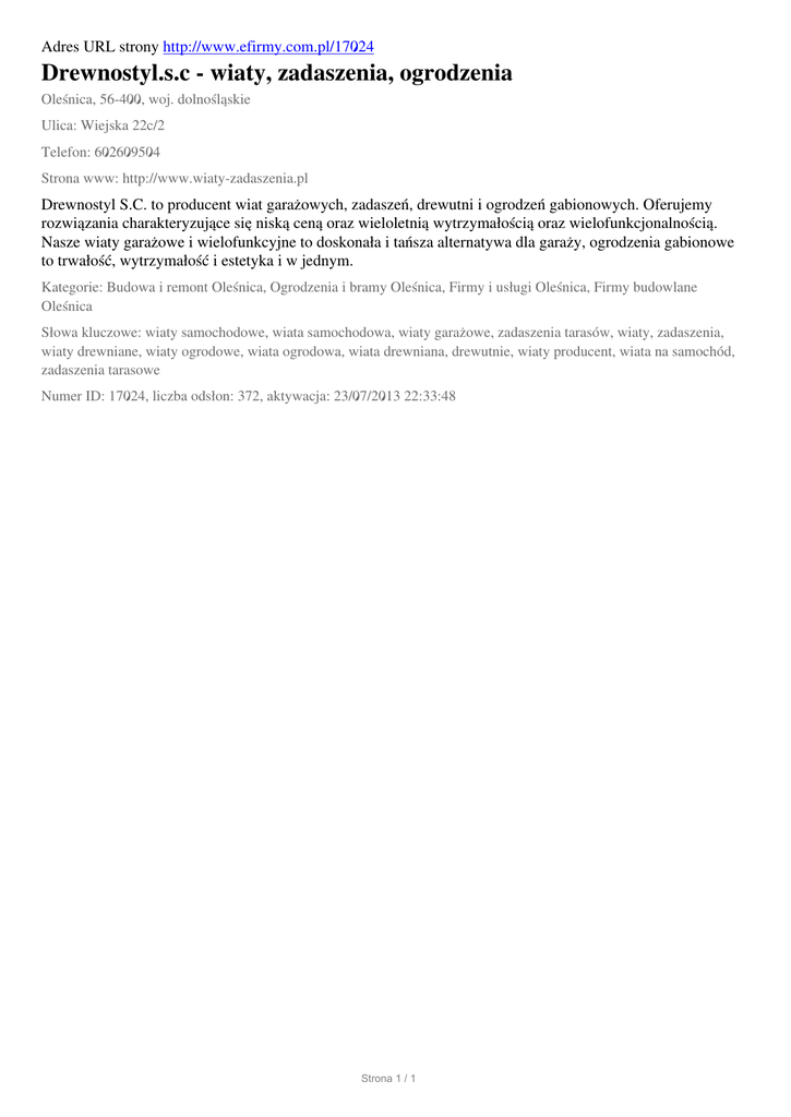 Adres URL strony http://www.efirmy.com.pl/17024 Drewnostyl.s.c - wiaty, zadaszenia, ogrodzenia Oleśnica, 56-400, woj. dolnośląskie Ulica: Wiejska 22c/2 Telefon: 602609504 Strona www: http://www.wiaty-zadaszenia.pl Drewnostyl S.C. to producent wiat garażowych, zadaszeń, drewutni i ogrodzeń gabionowych. Oferujemy rozwiązania charakteryzujące się niską ceną oraz wieloletnią wytrzymałością oraz wielofunkcjonalnością. Nasze wiaty garażowe i wielofunkcyjne to doskonała i tańsza alternatywa dla garaży, ogrodzenia gabionowe to trwałość, wytrzymałość i estetyka i w jednym. Kategorie: Budowa i remont Oleśnica, Ogrodzenia i bramy Oleśnica, Firmy i usługi Oleśnica, Firmy budowlane Oleśnica Słowa kluczowe: wiaty samochodowe, wiata samochodowa, wiaty garażowe, zadaszenia tarasów, wiaty, zadaszenia, wiaty drewniane, wiaty ogrodowe, wiata ogrodowa, wiata drewniana, drewutnie, wiaty producent, wiata na samochód, zadaszenia tarasowe Numer ID: 17024, liczba odsłon: 372, aktywacja: 23/07/2013 22:33:48 Strona 1 / 1