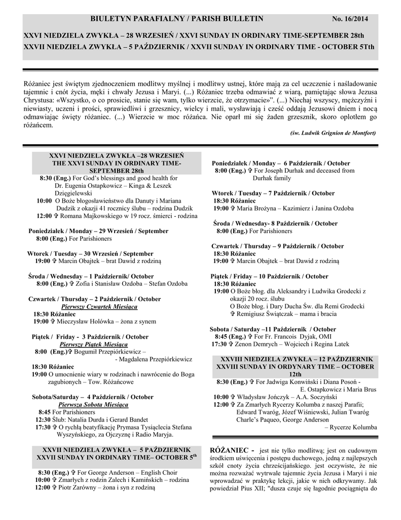 BIULETYN PARAFIALNY / PARISH BULLETIN No. 16/2014 XXVI NIEDZIELA ZWYKŁA – 28 WRZESIEŃ / XXVI SUNDAY IN ORDINARY TIME-SEPTEMBER 28th XXVII NIEDZIELA ZWYKŁA – 5 PAŹDZIERNIK / XXVII SUNDAY IN ORDINARY TIME - OCTOBER 5Tth Różaniec jest świętym zjednoczeniem modlitwy myślnej i modlitwy ustnej, które mają za cel uczczenie i naśladowanie tajemnic i cnót życia, męki i chwały Jezusa i Maryi. (...) Różaniec trzeba odmawiać z wiarą, pamiętając słowa Jezusa Chrystusa: «Wszystko, o co prosicie, stanie się wam, tylko wierzcie, że otrzymacie»”. (...) Niechaj wszyscy, mężczyźni i niewiasty, uczeni i prości, sprawiedliwi i grzesznicy, wielcy i mali, wysławiają i cześć oddają Jezusowi dniem i nocą odmawiając święty różaniec. (...) Wierzcie w moc różańca. Nie oparł mi się żaden grzesznik, skoro oplotłem go różańcem. (św. Ludwik Grignion de Montfort) XXVI NIEDZIELA ZWYKŁA –28 WRZESIEŃ THE XXVI SUNDAY IN ORDINARY TIMESEPTEMBER 28th 8:30 (Eng.) For God’s blessings and good health for Dr. Eugenia Ostapkowicz – Kinga & Leszek Dzięgielewski 10:00 O Boże błogosławieństwo dla Danuty i Mariana Dudzik z okazji 41 rocznicy ślubu – rodzina Dudzik 12:00 Romana Majkowskiego w 19 rocz. śmierci - rodzina Poniedziałek / Monday – 29 Wrzesień / September 8:00 (Eng.) For Parishioners Wtorek / Tuesday – 30 Wrzesień / September 19:00 Marcin Obajtek – brat Dawid z rodziną Środa / Wednesday – 1 Październik/ October 8:00 (Eng.) Zofia i Stanisław Ozdoba – Stefan Ozdoba Czwartek / Thursday – 2 Październik / October Pierwszy Czwartek Miesiąca 18:30 Różaniec 19:00 Mieczysław Holówka – żona z synem Piątek / Friday - 3 Październik / October Pierwszy Piątek Miesiąca 8:00 (Eng.) Bogumił Przepiórkiewicz – - Magdalena Przepiórkiewicz 18:30 Różaniec 19:00 O umocnienie wiary w rodzinach i nawrócenie do Boga zagubionych – Tow. Różańcowe Sobota/Saturday – 4 Październik / October Pierwsza Sobota Miesiąca 8:45 For Parishioners 12:30 Ślub: Natalia Durda i Gerard Bandet 17:30 O rychłą beatyfikację Prymasa Tysiąclecia Stefana Wyszyńskiego, za Ojczyznę i Radio Maryja. XXVII NIEDZIELA ZWYKŁA – 5 PAŹDZIERNIK XXVII SUNDAY IN ORDINARY TIME– OCTOBER 5th 8:30 (Eng.) For George Anderson – English Choir 10:00 Zmarłych z rodzin Zalech i Kamińskich – rodzina 12:00 Piotr Zarówny – żona i syn z rodziną Poniedziałek / Monday – 6 Październik / October 8:00 (Eng.) For Joseph Durhak and deceased from Durhak family Wtorek / Tuesday – 7 Październik / October 18:30 Różaniec 19:00 Maria Brożyna – Kazimierz i Janina Ozdoba Środa / Wednesday- 8 Październik / October 8:00 (Eng.) For Parishioners Czwartek / Thursday – 9 Październik / October 18:30 Różaniec 19:00 Marcin Obajtek – brat Dawid z rodziną Piątek / Friday – 10 Październik / October 18:30 Różaniec 19:00 O Boże błog. dla Aleksandry i Ludwika Grodecki z okazji 20 rocz. ślubu O Boże błog. i Dary Ducha Św. dla Remi Grodecki Remigiusz Świątczak – mama i bracia Sobota / Saturday –11 Październik / October 8:45 (Eng.) For Fr. Francois Dyjak, OMI 17:30 Zenon Demrych – Wojciech i Regina Latek XXVIII NIEDZIELA ZWYKŁA – 12 PAŹDZIERNIK XXVIII SUNDAY IN ORDYNARY TIME – OCTOBER 12th 8:30 (Eng.) For Jadwiga Konwiński i Diana Posoń E. Ostapkowicz i Maria Brus 10:00 Władysław Jończyk – A.A. Soczyński 12:00 Za Zmarłych Rycerzy Kolumba z naszej Parafii; Edward Twaróg, Józef Wiśniewski, Julian Twaróg Charle’s Paqueo, George Anderson – Rycerze Kolumba RÓŻANIEC - jest nie tylko modlitwą; jest on cudownym środkiem uświęcenia i postępu duchowego, jedną z najlepszych szkół cnoty życia chrześcijańskiego. jest oczywiste, że nie można rozważać wytrwale tajemnic życia Jezusa i Maryi i nie wprowadzać w praktykę lekcji, jakie w nich odkrywamy. Jak powiedział Pius XII; "dusza czuje się łagodnie pociągnięta do postępowania drogą wytyczoną przez Chrystusa i Jego Matkę". Maryja, tak godna miłości i podziwu, zbliża się ku nam, bierze nas za rękę i uczy żyć tak, jak Ona sama żyła na ziemi przy boku swego Syna, według Ewangelii. Oto urok Różańca i tajemnica jego skuteczności: on "wprowadza nas w żywą łaczność z Jezusem poprzez Serce Jego Matki" (Jan Paweł II). DRUGA SKŁADKA – Dziś zebrana będzie druga składka na potrzeby Kościoła w Kanadzie. OGŁOSZENIA DUSZPASTERSKIE KONGRES POLONII KANADYJSKIEJ zaprasza na koncert ROZRYWKOWY WIECZÓR Z NASZYMI GWIAZDAMI w niedzielę 5 października, 2014 o godz. 17:00 w Evergreen Cultural Center 1205 Pinetree Way, Coquitlam, BC. Bilety w cenie $25.00 można nabyć przy wejściu lub rezerwując telefonicznie: Grażyna - 604-689-3493. W miesiącu październiku zapraszamy wszystkich czcicieli Maryi na wspólną modlitwę różańcową do naszego kościoła we wtorki, czwartki i piątki o godz.18:30. PIERWSZY CZWARTEK, PIĄTEK I SOBOTA MIESIĄCA - Pamiętajmy, że z daru Bożego miłosierdzia możemy korzystać zwłaszcza przez ręce kapłanów. Dlatego w czwartek prosimy o liczne i święte powołania do kapłaństwa, o wytrwanie dla tych, którzy zostali już powołani do pracy w Winnicy Pańskiej. A w pierwszy piątek miesiąca wprost doświadczajmy Miłosiernej Miłości, płynącej z przebitego Jezusowego Serca, odnawiając naszą komunię z Bogiem i braćmi. Okazja do spowiedzi świętej pierwszopiątkowej. Pierwsza sobota miesiąca – dzień poświęcony Niepokalanemu Sercu Maryi. MSZA ŚW. Z UDZIAŁEM DZIECI – W każda pierwszą niedzielę miesiąca o godz. 10:00 celebrować będziemy Mszę św. z udziałem dzieci. Zapraszamy wszystkie dzieci do licznego udziału. POLSKA SZKOŁA – w sobotę 4 października o godz.9:30 w sali pod kościołem odbędzie sie spotkanie dla rodziców. MINISTRANCI – Dnia 5 października (niedziela) o godz. 11:00 w szkole odbędzie się spotkanie Ministrantów i Rodziców. Bardzo proszę wszystkich o obecność. C
