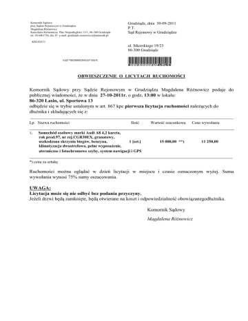 Komornik Sądowy przy Sądzie Rejonowym w Grudziądzu Magdalena Różnowicz Kancelaria Komornicza Plac Niepodległości 13/1, 86-300 Grudziądz tel. 56 6461736, fax 35 e-mail: [email protected] Grudziądz, dnia 30-09-2011 P.T. Sąd Rejonowy w Grudziądzu KM 824/11 ul. Sikorskiego 19/23 86-300 Grudziądz #AD *0020000204526*/0419/ *0020000204526* OBWIESZCZENIE O LICYTACJI RUCHOMOŚCI Komornik Sądowy przy Sądzie Rejonowym w Grudziądzu Magdalena Różnowicz podaje do publicznej wiadomości, że w dniu 27-10-2011r. o godz. 13:00 w lokalu: 86-320 Łasin, ul. Sportowa 13 odbędzie się w trybie ustalonym w art. 867 kpc pierwsza licytacja ruchomości należących do dłużnika i składających się z: _______________________________________________________________________________________________________________________ Lp. Nazwa ruchomości Ilość Wartość szacunkowa Cena wywołania ________________________________________________________________________________________________________________________ 1. Samochód osobowy marki Audi A8 4,2 kareta, rok prod.97, nr rej.CGR30EX, granatowy, uszkodzona skrzynia biegów, benzyna, 1 [szt.] klimatyzacja dwustrefowa, pełne wyposażenie, atermiczne i fotochromowe szyby, system nawigacji i GPS 15 000,00 **) 11 250,00 _______________________________________________________________________________________________________________________ *) cena za sztukę Ruchomości można oglądać w dzień licytacji w miejscu i czasie oznaczonym wyżej. Suma wywołania wynosi 75% sumy oszacowania. UWAGA: Licytacja może się nie odbyć bez podania przyczyny. Jeżeli drzwi będą zamknięte, będą otwierane na koszt i odpowiedzialność obowiązanegodłużnika. Komornik Sądowy Magdalena Różnowicz
