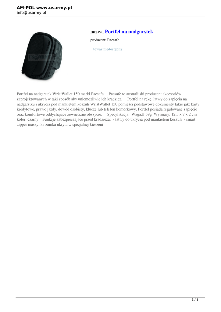 AM-POL www.usarmy.pl [email protected] nazwa Portfel na nadgarstek producent: Pacsafe towar niedostępny Portfel na nadgarstek WristWallet 150 marki Pacsafe. Pacsafe to australijski producent akcesoriów zaprojektowanych w taki sposób aby uniemożliwić ich kradzież. Portfel na rękę, łatwy do zapięcia na nadgarstku i ukrycia pod mankietem koszuli WristWallet 150 pomieści podstawowe dokumenty takie jak: karty kredytowe, prawo jazdy, dowód osobisty, klucze lub telefon komórkowy. Portfel posiada regulowane zapięcie oraz komfortowe oddychające zewnętrzne obszycie. Specyfikacja: Waga: 59g Wymiary: 12,5 x 7 x 2 cm kolor: czarny Funkcje zabezpieczające przed kradzieżą: - łatwy do ukrycia pod mankietem koszuli - smart zipper maszynka zamka ukryta w specjalnej kieszeni 1/1
