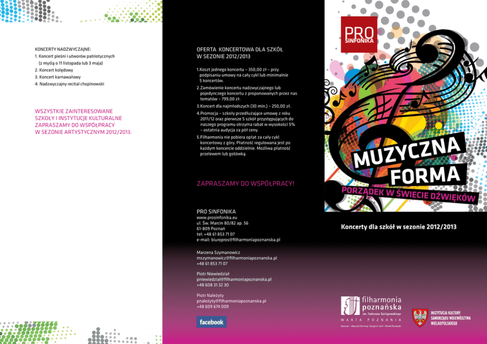 PRO SINFONIKA KONCERTY NADZWYCZAJNE: 1. K oncert pieśni i utworów patriotycznych (z myślą o 11 listopada lub 3 maja) 2. Koncert kolędowy 3. Koncert karnawałowy 4. Nadzwyczajny recital chopinowski WSZYSTKIE ZAINTERESOWANE SZKOŁY I INSTYTUCJE KULTURALNE ZAPRASZAMY DO WSPÓŁPRACY W SEZONIE ARTYSTYCZNYM 2012/2013. OFERTA KONCERTOWA DLA SZKÓŁ W SEZONIE 2012/2013 1.Koszt jednego koncertu – 350,00 zł – przy podpisaniu umowy na cały cykl lub minimalnie 5 koncertów. 2.Zamówienie koncertu nadzwyczajnego lub pojedynczego koncertu z proponowanych przez nas tematów – 799,00 zł. 3.Koncert dla najmłodszych (30 min.) – 250,00 zł. 4.Promocja – szkoły przedłużające umowę z roku 2011/12 oraz pierwsze 5 szkół przystępujących do naszego programu otrzyma rabat w wysokości 5% – ostatnia audycja za pół ceny. 5.Filharmonia nie pobiera opłat za cały cykl koncertowy z góry. Płatność regulowana jest po każdym koncercie oddzielnie. Możliwa płatność przelewem lub gotówką. ZAPRASZAMY DO WSPÓŁPRACY! A N Z C Y MUZ A M R O F PORZĄDEK W ŚWIECIE DŹWIĘK ÓW PRO SINFONIKA www.prosinfonika.eu ul. Św. Marcin 80/82 ap. 56 61-809 Poznań tel: +48 61 853 71 07 e-mail: [email protected] Marzena Szymanowicz [email protected] +48 61 853 71 07 Piotr Niewiedział [email protected] +48 608 31 32 30 Piotr Należyty pnależ[email protected] +48 609 674 009 Koncerty dla szkół w sezonie 2012/2013 MUZYCZNA FORMA 5. PORZĄDEK W ŚWIECIE DŹWIĘKÓW „YOU CAN DANCE!” – OCZYWIŚCIE, ALE CZY POTRAFISZ? Formy taneczne: walc, tango, tańce latynoamerykańskie. Tematy koncertów w sezonie 2012 / 2013 6. 1. ŚPIEWAĆ KAŻDY MOŻE, ALE NIE KAŻDY POWINIEN... MUZYCZNE „MAŁE CO NIECO” – UTWORY NAJKRÓTSZE Miniatura: etiuda, kaprys, preludium, nokturn. Pieśń, piosenka, aria, ballada. 7. 2. O KOMPOZYTORZE, KTÓREMU INWENCJA TWÓRCZA ORAZ ZNAJOMOŚĆ KANONU WIEDZY MUZYCZNEJ POZWOLIŁA NA TWORZENIE FUG I TOCCAT, CZYLI SPOTKANIE Z JANEM SEBASTIANEM Kanon, fuga, inwencja, toccata. WARIACJA TO ODMIANA, PRZEKSZTAŁCENIE, MODYFIKACJA, PRZERÓBKA, ALE TAKŻE OBŁĄKANIE, SZALEŃSTWO, WYBRYK, GŁUPSTWO. A GDZIE TU MUZYKA? Wariacje. 8. JEDEN POMYSŁ – WIELE ZASTOSOWAŃ Sonata – koncert – symfonia. 3. NA LUDOWO, NARODOWO, NA SWOJSKĄ NUTĘ… Formy taneczne: polonez, oberek, kujawiak, mazur. 9. MUZYKA + OBRAZ + SŁOWO = ??? Balet, opera, musical. 4. TANIEC W PERUCE I KRYNOLINIE – JAK SIĘ DO TEGO ZABRAĆ? Formy taneczne: gawot, menuet, pawana, sarabanda. 10. WIELKIE PODSUMOWANIE, CZYLI CO NAM Z TEGO WYSZŁO? W roku szkolnym 2012/2013 Pro Sinfonika proponuje nowy cykl koncertów przeznaczonych dla młodzieży szkolnej. Niniejsza oferta koncertowa jest kontynuacją trzyletniego programu, mającego na celu przywrócenie sztuce należnego miejsca w systemie edukacji oraz rozwój kreatywnego myślenia wśród młodzieży. Formuła i czas spotkań muzycznych dostosowane są do wieku słuchaczy. Dla najstarszych odbiorców (licea, gimnazja) proponujemy 50-minutowe, a dla najmłodszych (klasy 1-3) 30-minutowe koncerty. W spotkaniach tych ważną rolę odgrywa również wkład twórczy słuchaczy oraz ich aktywność we współtworzeniu koncertów, co wymaga wcześniejszego przygotowania. Dlatego też, oprócz koncertów, Pro Sinfonika oferuje warsztaty umuzykalniające (dla klas 4-6 oraz gimnazjów), połączone z konkursem dla uczestników warsztatów / koncertów.
