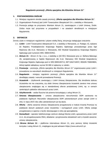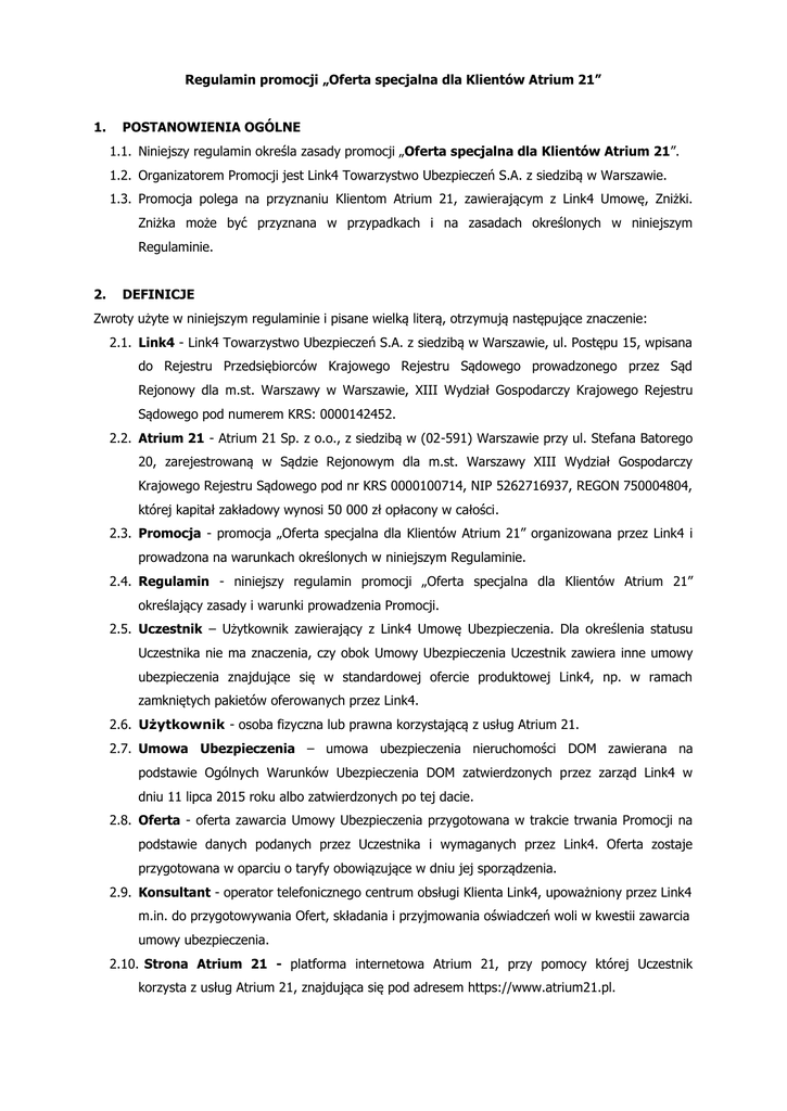 Regulamin promocji „Oferta specjalna dla Klientów Atrium 21” 1. POSTANOWIENIA OGÓLNE 1.1. Niniejszy regulamin określa zasady promocji „Oferta specjalna dla Klientów Atrium 21”. 1.2. Organizatorem Promocji jest Link4 Towarzystwo Ubezpieczeń S.A. z siedzibą w Warszawie. 1.3. Promocja polega na przyznaniu Klientom Atrium 21, zawierającym z Link4 Umowę, Zniżki. Zniżka może być przyznana w przypadkach i na zasadach określonych w niniejszym Regulaminie. 2. DEFINICJE Zwroty użyte w niniejszym regulaminie i pisane wielką literą, otrzymują następujące znaczenie: 2.1. Link4 - Link4 Towarzystwo Ubezpieczeń S.A. z siedzibą w Warszawie, ul. Postępu 15, wpisana do Rejestru Przedsiębiorców Krajowego Rejestru Sądowego prowadzonego przez Sąd Rejonowy dla m.st. Warszawy w Warszawie, XIII Wydział Gospodarczy Krajowego Rejestru Sądowego pod numerem KRS: 0000142452. 2.2. Atrium 21 - Atrium 21 Sp. z o.o., z siedzibą w (02-591) Warszawie przy ul. Stefana Batorego 20, zarejestrowaną w Sądzie Rejonowym dla m.st. Warszawy XIII Wydział Gospodarczy Krajowego Rejestru Sądowego pod nr KRS 0000100714, NIP 5262716937, REGON 750004804, której kapitał zakładowy wynosi 50 000 zł opłacony w całości. 2.3. Promocja - promocja „Oferta specjalna dla Klientów Atrium 21” organizowana przez Link4 i prowadzona na warunkach określonych w niniejszym Regulaminie. 2.4. Regulamin - niniejszy regulamin promocji „Oferta specjalna dla Klientów Atrium 21” określający zasady i warunki prowadzenia Promocji. 2.5. Uczestnik – Użytkownik zawierający z Link4 Umowę Ubezpieczenia. Dla określenia statusu Uczestnika nie ma znaczenia, czy obok Umowy Ubezpieczenia Uczestnik zawiera inne umowy ubezpieczenia znajdujące się w standardowej ofercie produktowej Link4, np. w ramach zamkniętych pakietów oferowanych przez Link4. 2.6. Użytkownik - osoba fizyczna lub prawna korzystającą z usług Atrium 21. 2.7. Umowa Ubezpieczenia – umowa ubezpieczenia nieruchomości DOM zawierana na podstawie Ogólnych Warunków Ubezpieczenia DOM zatwierdzonych przez zarząd Link4 w dniu 11 lipca 2015 roku albo zatwierdzonych po tej dacie. 2.8. Oferta - oferta zawarcia Umowy Ubezpieczenia przygotowana w trakcie trwania Promocji na podstawie danych podanych przez Uczestnika i wymaganych przez Link4. Oferta zostaje przygotowana w oparciu o taryfy obowiązujące w dniu jej sporządzenia. 2.9. Konsultant - operator telefonicznego centrum obsługi Klienta Link4, upoważniony przez Link4 m.in. do przygotowywania Ofert, składania i przyjmowania oświadczeń woli w kwestii zawarcia umowy ubezpieczenia. 2.10. Strona Atrium 21 - platforma internetowa Atrium 21, przy pomocy której Uczestnik korzysta z usług Atrium 21, znajdująca się pod adresem https://www.atrium21.pl. 2.11. Portal Ubezpieczeniowy - platforma internetowa Link4, służąca do wykonywania czynności przygotowawczych przed zawarciem Umowy Ubezpieczenia, podawania przez Uczestników danych i informacji, zawierania online Umów Ubezpieczenia z Link4. Portal Ubezpieczeniowy zawiera również narzędzia i informacje umożliwiające kontakt telefoniczny z Link4 (aplikacja CallBack i informacja o dedykowanym numerze telefonu). 2.12. Zniżka - rabat w wysokości określonej w pkt 4.1., przyznawany Uczestnikowi przez Link4 z tytułu zawarcia Umowy Ubezpieczenia. 2.13. Składka – roczna składka należna Link4 z tytułu zawarcia Umowy Ubezpieczenia. Jeżeli Uczestnik posiada zniżki za bezszkodowość, uwzględniane przez Link4 na mocy stosownego regulaminu, przez Składkę rozumie się składkę roczną obniżoną o procent zniżki za bezszkodowość należną danemu Uczestnikowi. 2.14. Kod Rabatowy – kod uprawniający do otrzymania Zniżki zamieszczony na Stronie Atrium 21. 3. WARUNKI UCZESTNICTWA W PROMOCJI I OTRZYMANIA ZNIŻEK W Promocji bierze udział każdy Uczestnik, który spełni łącznie następujące warunki: 3.1. w okresie trwania Promocji skontaktuje się z Link4 w celu uzyskania Oferty. Przez kontakt z Link4 w rozumieniu niniejszego Regulaminu uznaje się: 3.1.1. kontakt telefoniczny z centrum obsługi klienta (nr tel. (22) 444 67 03), 3.1.2. wypełnienie formularza wniosku o zawarcie umowy ubezpieczenia za pośrednictwem Portalu Ubezpieczeniowego, 3.1.3. zamówienie kontaktu telefonicznego ze strony Konsultanta Link4 za pośrednictwem Internetu lub w inny udostępniony przez Link4 sposób; 3.2. w trakcie przedstawiania Oferty poda Kod Rabatowy; 3.3. na dzień sporządzenia Oferty nie posiada obowiązującej Umowy Ubezpieczenia zawartej z Link4, w której jest ubezpieczającym, chyba że umowy te dotyczą innej nieruchomości niż Oferta, 3.4. po otrzymaniu Oferty, ale przed zakończeniem Promocji, zaakceptuje Ofertę i złoży oświadczenie woli o zawarciu Umowy Ubezpieczenia z Link4 przy pomocy Portalu Ubezpieczeniowego lub Konsultantowi, 3.5. w terminie wskazanym w Umowie Ubezpieczenia opłaci całą należną Link4 Składkę lub jej pierwszą ratę, stosownie do ustaleń poczynionych w trakcie zawierania Umowy Ubezpieczenia. Dla stwierdzenia uprawnienia Uczestnika do Zniżki nie jest istotny termin rozpoczęcia ochrony ubezpieczeniowej Link4, a jedynie data zawarcia Umowy Ubezpieczenia i tym samym zapłacenia Składki lub jej pierwszej raty. 4. ZNIŻKA 4.1. Uczestnik, poprzez udział w Promocji, jest uprawniony do nabycia, na zasadach określonych w Regulaminie, prawa do Zniżki w wysokości: a. 10 % wartości Składki z tytułu zawartej Umowy Ubezpieczenia, o ile Uczestnik zawrze Umowę Ubezpieczenia za pośrednictwem Portalu Ubezpieczeniowego; albo b. 20 % wartości Składki z tytułu zawartej Umowy Ubezpieczenia, o ile Uczestnik zawrze Umowę Ubezpieczenia za pośrednictwem Konsultanta; 4.2. Procent Zniżki, określony w pkt 4.1 powyżej, odejmowany jest od Składki należnej z tytułu Umowy Ubezpieczenia, a jeżeli Składka płatna ma być w ratach, Zniżka rozkładana jest proporcjonalnie na każdą ratę obniżając wysokoś