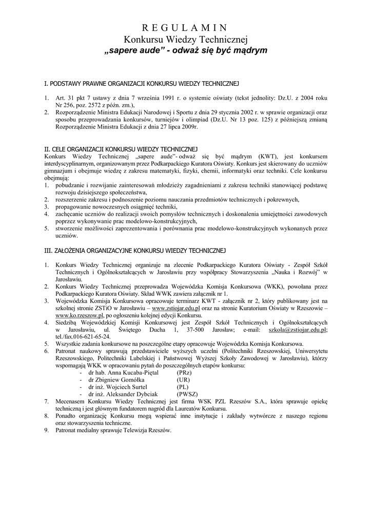 REGULAMIN Konkursu Wiedzy Technicznej „sapere aude” - odważ się być mądrym I. PODSTAWY PRAWNE ORGANIZACJI KONKURSU WIEDZY TECHNICZNEJ 1. 2. Art. 31 pkt 7 ustawy z dnia 7 września 1991 r. o systemie oświaty (tekst jednolity: Dz.U. z 2004 roku Nr 256, poz. 2572 z późn. zm.), Rozporządzenie Ministra Edukacji Narodowej i Sportu z dnia 29 stycznia 2002 r. w sprawie organizacji oraz sposobu przeprowadzania konkursów, turniejów i olimpiad (Dz.U. Nr 13 poz. 125) z późniejszą zmianą Rozporządzenie Ministra Edukacji z dnia 27 lipca 2009r. II. CELE ORGANIZACJI KONKURSU WIEDZY TECHNICZNEJ Konkurs Wiedzy Technicznej „sapere aude”- odważ się być mądrym (KWT), jest konkursem interdyscyplinarnym, organizowanym przez Podkarpackiego Kuratora Oświaty. Konkurs jest skierowany do uczniów gimnazjum i obejmuje wiedzę z zakresu matematyki, fizyki, chemii, informatyki oraz techniki. Cele konkursu obejmują: 1. pobudzanie i rozwijanie zainteresowań młodzieży zagadnieniami z zakresu techniki stanowiącej podstawę rozwoju dzisiejszego społeczeństwa, 2. rozszerzenie zakresu i podnoszenie poziomu nauczania przedmiotów technicznych i pokrewnych, 3. propagowanie nowoczesnych osiągnięć techniki, 4. zachęcanie uczniów do realizacji swoich pomysłów technicznych i doskonalenia umiejętności zawodowych poprzez wykonywanie prac modelowo-konstrukcyjnych, 5. stworzenie możliwości zaprezentowania i porównania prac modelowo-konstrukcyjnych wykonanych przez uczniów. III. ZAŁOŻENIA ORGANIZACYJNE KONKURSU WIEDZY TECHNICZNEJ 1. 2. 3. 4. 5. 6. 7. 8. 9. Konkurs Wiedzy Technicznej organizuje na zlecenie Podkarpackiego Kuratora Oświaty - Zespół Szkół Technicznych i Ogólnokształcących w Jarosławiu przy współpracy Stowarzyszenia „Nauka i Rozwój” w Jarosławiu. Konkurs Wiedzy Technicznej przeprowadza Wojewódzka Komisja Konkursowa (WKK), powołana przez Podkarpackiego Kuratora Oświaty. Skład WWK zawiera załącznik nr 1. Wojewódzka Komisja Konkursowa opracowuje terminarz KWT - załącznik nr 2, który publikowany jest na szkolnej stronie ZSTiO w Jarosławiu – www.zstiojar.edu.pl oraz na stronie Kuratorium Oświaty w Rzeszowie – www.ko.rzeszow.pl, po ogłoszeniu kolejnej edycji Konkursu. Siedzibą Wojewódzkiej Komisji Konkursowej jest Zespół Szkół Technicznych i Ogólnokształcących w Jarosławiu, ul. Świętego Ducha 1, 37-500 Jarosław; e-mail: [email protected]; tel./fax.016-621-65-24. Wszystkie zadania konkursowe na poszczególne etapy opracowuje Wojewódzka Komisja Konkursowa. Patronat naukowy sprawują przedstawiciele wyższych uczelni (Politechniki Rzeszowskiej, Uniwersytetu Rzeszowskiego, Politechniki Lubelskiej i Państwowej Wyższej Szkoły Zawodowej w Jarosławiu), którzy wspomagają WKK w opracowaniu pytań do poszczególnych etapów konkursu: - dr hab. Anna Kucaba-Piętal (PRz) - dr Zbigniew Gomółka (UR) - dr inż. Wojciech Surtel (PL) - dr inż. Aleksander Dybciak (PWSZ) Mecenasem Konkursu Wiedzy Technicznej jest firma WSK PZL Rzeszów S.A., która sprawuje opiekę techniczną i jest głównym fundatorem nagród dla Laureatów Konkursu. Ponadto organizację Konkursu mogą wspierać inne instytucje i zakłady wytwórcze z naszego regionu oraz stowarzyszenia techniczne. Patronat medialny sprawuje Telewizja Rzeszów. III. UCZESTNICY I ZAKRES TEMATYCZNY KONKURSU WIEDZY TECHNICZNEJ 1. 2. 3. 4. 5. 6. 7. 8. 9. 10. 11. 12. 13. 14. W Konkursie Wiedzy Technicznej może wziąć udział każdy uczeń uczęszczający do gimnazjum na terenie województwa podkarpackiego. Uczestnik Konkursu winien posiadać przy sobie aktualną legitymację szkolną. Zakres tematyczny Konkursu Wiedzy Technicznej obejmuje treści ujęte w obowiązującej „Podstawie programowej kształcenia ogólnego dla gimnazjum” pięciu przedmiotów gimnazjalnych: matematyki, fizyki, chemii, informatyki i techniki. Szczegółową tematykę określa „Zakres wymaganych wiadomości i umiejętności” konkursów przedmiotowych z matematyki, fizyki, chemii i informatyki, organizowanych przez Podkarpackiego Kuratora Oświaty. Szczegółowa tematyka z techniki uwzględnia historię wynalazków z zakresu matematyki, fizyki, informatyki oraz zastosowania nowoczesnych technologii w zakresie elektroniki i telekomunikacji, ekologii, przemysłu maszynowego i samochodowego. Konkurs Wiedzy Technicznej jest organizowany w dwóch kategoriach: kategoria I - konkurs interdyscyplinarny, kategoria II - konkurs prac modelowo-konstrukcyjnych. Uczestnictwo w kategorii I – interdyscyplinarnej Konkursu Wiedzy Technicznej nie wyklucza i nie stanowi warunku uczestnictwa w kategorii II - prac modelowo- konstrukcyjnych i na odwrót. Konkurs Wiedzy Technicznej w kategorii I (interdyscyplinarnej) odbywa się w trzech etapach: - I etap – eliminacje szkolne w gimnazjach, które zgłosiły swój udział WKK, - II i III etap (finał) – w siedzibie Zespołu Szkół Technicznych i Ogólnokształcących w Jarosławiu. Konkurs Wiedzy Technicznej w kategorii II (prac modelowo-konstrukcyjnych) odbywa się w trzech etapach: - I etap – eliminacje szkolne w gimnazjach, które zgłosiły swój udział WKK, - II i III etap (finał) – w siedzibie Zespołu Szkół Technicznych i Ogólnokształcących w Jarosławiu. Do II etapu Konkursu w obu kategoriach mogą przystąpić tylko uczniowie zakwalifikowani przez Komisję Szkolną KWT i zgłoszeni WKK. Opiekę nad uczniami, biorącymi udział w kolejnych etapach Konkursu, sprawują nauczyciele oddelegowani przez dyrektora gimnazjum. Prace uczniów na etapie szkolnym i wojewódzkim Konkursu w obu kategoriach są kodowane. Rozkodowanie następuje dopiero po dokonaniu oceny prac. Organizację i sposób kodowania oraz rozkodowywania prac ustala komisja odpowiedniego etapu Konkursu. Podczas wszystkich etapów Konkursu uczestnicy mogą dokonywać obliczeń „na brudno” na załączonych arkuszach papieru, jednak nie będą one podlegać ocenie i nie będą mieć wpływu na wynik ko