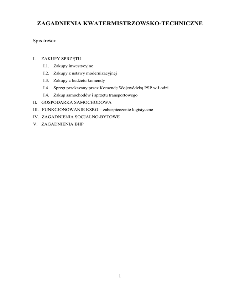 ZAGADNIENIA KWATERMISTRZOWSKO-TECHNICZNE Spis treści: I. ZAKUPY SPRZĘTU I.1. Zakupy inwestycyjne I.2. Zakupy z ustawy modernizacyjnej I.3. Zakupy z budŜetu komendy I.4. Sprzęt przekazany przez Komendę Wojewódzką PSP w Łodzi I.4. Zakup samochodów i sprzętu transportowego II. GOSPODARKA SAMOCHODOWA III. FUNKCJONOWANIE KSRG – zabezpieczenie logistyczne IV. ZAGADNIENIA SOCJALNO-BYTOWE V. ZAGADNIENIA BHP 1 I. ZAKUPY SPRZĘTU. I.1. Zakupy inwestycyjne: W 2009 r. zostały rozpoczęte prace nad budową CPR. Prowadzono prace przygotowawcze nad dostosowaniem pomieszczeń pod względem socjalnym i technicznym. Na ten cel wydatkowaliśmy 84 000 zł. I.2. Zakupy z ustawy modernizacyjnej: W 2009 r. planowany był zakup samochodu specjalnego drabiny SD-37, w ramach ustawy modernizacyjnej. Ze względu na oszczędności w budŜecie państwa środki finansowe na ten cel, zostały czasowo wstrzymane. I.3. Zakupy z budŜetu komendy: Nazwę, typ Ze środków budŜetowych Ilość Wartość Ubranie UPS 6 5 800,45 Ubranie koszarowe 28 5 943,85 Butu specjalne skórzane 9 2 835,50 Butu specjalne gumowe 6 1 215,52 Radiotelefon 1 1 535,45 Razem: 17 330,77 I.4. Sprzęt przekazany przez Komendę Wojewódzką PSP w Łodzi: Kwota Rodzaj sprzętu Lampa ostrzegawcza LED Silnik zaburtowy do pontonu Drabina nasadkowa Urządzenie ewakuacyjne Rollglis Pilarka do drewna Stihl Piła do betonu i stali Stihl Najaśnica z masztem Zestaw medyczny PSP R-1 Deska ratownica 2 Ilość 8 szt. Wartość 400,00 1 szt. 1 kpl. 1 kpl. 4 szt. 2 szt. 2 kpl. 1 kpl. 1 kpl. 4 911,30 1 048,60 2 279,10 12 626,00 6 313,00 1 348,20 3 798,50 1 498,00 Pompa szlamowa WT30 Pompa poŜarnicza M16/8 Pompa szlamowa WT40 Ubranie ochronne UPS Rejestrator rozmów WąŜ W-52 WąŜ W-75 1 szt. 1 szt. 1 szt. 2 szt. 1 kpl. 5 szt. 5 szt. Razem: 5 564,00 27 151,25 9 628,93 3 300,00 18 671,50 600,00 950,00 100 088,38 I.5. Zakup samochodów i sprzętu transportowego: W 2009 r. dzięki zaangaŜowaniu władz samorządowych komenda zakupiła nowy samochód SLRr na podwoziu Ford Ranger za kwotę 79 700 zł., przyczepę ratownictwa wodnego za kwotę 6 200 zł oraz sanie lodowe wraz z wyposaŜeniem na kwotę 8 485,10 zł. Finansowanie tych zakupów przedstawia się następująco: • Starostwo Powiatowe kwota 19 385,10 zł, • Urzędy Gmin z powiatu pabianickiego kwota 75 000 zł. 3 II. GOSPODARKA SAMOCHODOWA: Po przeanalizowaniu okresów eksploatacji samochodów znajdujących się na wyposaŜeniu Komendy Powiatowej PSP w Pabianicach, trzeba stwierdzić, Ŝe wyposaŜenie w sprzęt transportowy 6 z 13 samochodów przekracza normę eksploatacji zgodnie z Zarządzeniem Nr 8 Komendanta Głównego PSP z dnia 10 kwietnia 2008 r. w sprawie gospodarki transportowe w jednostkach organizacyjnych PSP. Dotyczy to wszystkich kategorii pojazdów. Pokazuje to poniŜsza tabela: L P 1. 2. 3. Kategorie Samochody osobowe - SOp Toyota - SOp Polonez Samochody cięŜarowe do 3,5 t - SKw Volkswagen Samochody ratowniczo – gaśnicze 4 Norma eksploatacji w latach Okres eksploatacji w latach 10 10 6 11 12 16 4. 5. - GBA Volvo - GCBA Scania - GCBA Jelcz - GCBA Berta Podnośniki i drabiny mechaniczne - SH-18 Star - SD-30 Magirus Samochody specjalne i inne - SLRr Ducato - SLRt Iveco - SKw Star - SLRr Ford Ranger 10 12 12 12 1 1 8 24 20 20 23 38 12 10 15 12 5 6 25 nowy Kolorem czerwonym zaznaczono wiek samochodów, które wykonały lub przekroczyły normę eksploatacji zgodnie z zarządzeniem Komendanta Głównego PSP. III. FUNKCJONOWANIE KSRG – zabezpieczenie logistyczne. W 2009 r. w ramach dotacji z budŜetu państwa jednostki OSP z powiatu pabianickiego włączone do KSRG, otrzymały kwotę w wysokości 179 900 zł. Ze względu wyjazdowość do zdarzeń jednostki OSP włączone do KSRG otrzymały nw. kwoty dotacji: 1. OSP Lutomiersk 9 500 zł. 2. OSP Konstantynów Łódzki 9 500 zł. 3. OSP Dobroń 4 900 zł. 4. OSP Dłutów 7 000 zł. 5. OSP Piątkowisko 4 900 zł. 6. OSP Górka Pabianicka 4 900 zł, 7. OSP Rydzyny 4 900 zł. 8. OSP Pawlikowie 4 900 zł. 9. OSP Kudrowice 4 900 zł. 10.OSP Szydłów 4 900 zł. 11.OSP Kazimierz 4 900 zł. 12.OSP Chechło 4 900 zł. 5 13.OSP Wola Zaradzyńska 4 900 zł. 14.OSP Pabianice 104 900 zł. (100 tys. na zakup samoch.). Dotacje zostały rozliczone zgodnie z obowiązującymi przepisami. Jednostki wydatkowały całe kwoty dotacji. PoniŜszy wykres przedstawia strukturę wydatków ze względu na ich rodzaj. Struktura wydatków finansowych w ramach dotacji budŜetowej jednostek OSP z KSRG materiały pędne 0,12% inne 7,32% środki gaśnicze 0,00% naprawa sprzętu 1,24% remont straŜnic 16,80% odzieŜ ochronna 15,87% zakup pojazdów 0,00% sprzęt ochrony osobistej 7,72% szkolenie specjalistyczne 0,00% urządzenia i sprzęt ppoŜ. 50,93% Sprzęt przekazany do OSP: Na podstawie decyzji Komendanta Wojewódzkiego: 1. Samochód GBA Mercedes przekazano do OSP Konstantynów Łódzki. 2. Samochód GCBA Tatra przekazano do OSP Gorzkowice powiat piotrkowski. 3. Samochód SOn śuk oraz przyczepę cięŜarową przekazano do OSP Górka Pabianicka powiat pabianicki. 4. Samochód SW 2000 Star przekazano do OSP Tarnówka powiat zduńskowolski. 6 Na podstawie decyzji Komendanta Powiatowego: 1. Przyczepa do przewozu wody lekkiej przekazano do OSP Tarnówka powiat zduńskowolski. 2. Agregat prądotwórczy na przyczepie przekazano do OSP Ślądkowice powiat pabianicki. 3. Przyczepa do motopompy wraz z motopompą przekazano do OSP Tarnówka powiat zduńskowolski. 4. Przyczepa do agregatu oddymiającego wraz z agregatem przekazano do OSP Ozorków powiat zgierski. V. ZAGADNIENIA SOCJALNO-BYTOWE W ramach prac przez załogi, udało się poprawić warunki socjalne pełnienia słuŜby poprzez: • poprawę oraz odnowienie estetyki pomieszczeń (wykonanie tynków w pomieszczeniu szatni, korytarza), • częściowa wymiana oświetlenia, • zaadaptowanie pomieszczenia na siłownię (remont), wykonanie części sprzętu). Do siłowni zakupiono sprzęt do ćwiczeń na kwotę ok. 2 