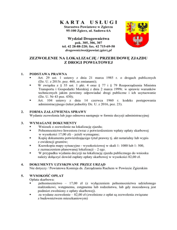 KARTA USŁUGI Starostwo Powiatowe w Zgierzu 95-100 Zgierz, ul. Sadowa 6A Wydział Drogownictwa pok. 305, 306, 307 tel. 42 28-88-220; fax. 42 715-69-50 [email protected] ZEZWOLENIE NA LOKALIZACJĘ / PRZEBUDOWĘ ZJAZDU Z DROGI POWIATOWEJ 1. PODSTAWA PRAWNA Art. 29 ust. 1 ustawy z dnia 21 marca 1985 r. o drogach publicznych (Dz. U. z 2015r. poz. 460, ze zmianami); W związku z § 55 ust. 1 pkt. 4 oraz § 77 i § 79 Rozporządzenia Ministra Transportu i Gospodarki Morskiej z dnia 2 marca 1999r. w sprawie warunków technicznych jakim powinny odpowiadać drogi publiczne i ich usytuowanie (Dz. U. Nr 43 poz. 430); Art. 104 ustawy z dnia 14 czerwca 1960 r. kodeks postępowania administracyjnego (tekst jednolity Dz. U. z 2016, poz. 23). 2. FORMA ZAŁATWIENIA SPRAWY Wydanie zezwolenia lub jego odmowa następuje w formie decyzji administracyjnej 3. WYMAGANE DOKUMENTY Wniosek o zezwolenie na lokalizację zjazdu; Pełnomocnictwo Inwestora (wraz z potwierdzeniem wpłaty opłaty skarbowej w wysokości 17,00 zł) – jeżeli wymagane; Kopię dokumentu potwierdzającego tytuł prawny tj. akt notarialny lub wypis z ewidencji gruntów; Kserokopia mapy sytuacyjno - wysokościowej w skali 1: 1000 lub 1: 500, z zaznaczeniem planowanej lokalizacji – 2 egz. W przypadku wydania decyzji na lokalizację zjazdu publicznego do wniosku należy dołączyć dowód zapłaty opłaty skarbowej w wysokości 82,00 zł. 4. DOKUMENTY UZYSKIWANE PRZEZ URZĄD Nie dotyczy / Powiatowa Komisja ds. Zarządzania Ruchem w Powiecie Zgierskim 5. WYSOKOŚĆ OPŁAT Opłata skarbowa: pełnomocnictwo – 17,00 zł (z wyłączeniem pełnomocnictwa udzielonego małżonkowi, wstępnemu, zstępnemu lub rodzeństwu, lub gdy mocodawcą jest podmiot zwolniony z opłaty skarbowej). za wydane zezwolenie – 82,00 zł (zwolnione z opłat są zezwolenia związane z budownictwem mieszkaniowym) Opłatę skarbową należy uiścić na konto: Urzędu Miasta Zgierza nr 15 8783 0004 0017 2303 2000 0103 6. TERMIN ODPOWIEDZI Do 30 dni, a w przypadku sprawy szczególnie skomplikowanej do 60 dni. 7. KOMÓRKA ODPOWIEDZIALNA Wydział Drogownictwa 8. TRYB ODWOŁAWCZY Od decyzji służy odwołanie do Samorządowego Kolegium Odwoławczego w Łodzi, ul. Piotrkowska 86, w terminie 14 dni od dnia doręczenia niniejszej decyzji za pośrednictwem Zarządu Powiatu Zgierskiego. 9. SPOSÓB ODEBRANIA DOKUMENTÓW Osobiście w Wydziale lub drogą pocztową 10. DODATKOWE INFORMACJE Uzyskana decyzja zezwalająca na lokalizację /przebudowę zjazdu nie upoważnia do rozpoczęcia robót budowlanych. Stanowi ona dokument niezbędny do uzyskania pozwolenia na budowę lub dokonania zgłoszenia (w rozumieniu ustawy Prawo budowlane). Przebudowa zjazdu wymaga wydania przez Zarząd Powiatu Zgierskiego zezwolenia na prowadzenie robót w pasie drogowym. W przypadku zajęcia pasa drogowego bez zezwolenia, zarządca drogi orzeka o przywróceniu pasa drogowego do stanu poprzedniego i pobiera opłaty karne w wysokości dziesięciokrotnej należnej opłaty. W przypadku braków formalnych wnioskodawca zostanie wezwany do złożenia uzupełnienia.