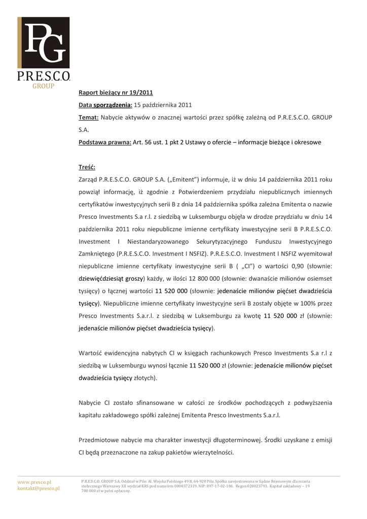 Raport bieżący nr 19/2011 Data sporządzenia: 15 października 2011 Temat: Nabycie aktywów o znacznej wartości przez spółkę zależną od P.R.E.S.C.O. GROUP S.A. Podstawa prawna: Art. 56 ust. 1 pkt 2 Ustawy o ofercie – informacje bieżące i okresowe Treść: Zarząd P.R.E.S.C.O. GROUP S.A. („Emitent”) informuje, iż w dniu 14 października 2011 roku powziął informację, iż zgodnie z Potwierdzeniem przydziału niepublicznych imiennych certyfikatów inwestycyjnych serii B z dnia 14 października spółka zależna Emitenta o nazwie Presco Investments S.a r.l. z siedzibą w Luksemburgu objęła w drodze przydziału w dniu 14 października 2011 roku niepubliczne imienne certyfikaty inwestycyjne serii B P.R.E.S.C.O. Investment I Niestandaryzowanego Sekurytyzacyjnego Funduszu Inwestycyjnego Zamkniętego (P.R.E.S.C.O. Investment I NSFIZ). P.R.E.S.C.O. Investment I NSFIZ wyemitował niepubliczne imienne certyfikaty inwestycyjne serii B ( „CI”) o wartości 0,90 (słownie: dziewięćdziesiąt groszy) każdy, w ilości 12 800 000 (słownie: dwanaście milionów osiemset tysięcy) o łącznej wartości 11 520 000 (słownie: jedenaście milionów pięćset dwadzieścia tysięcy). Niepubliczne imienne certyfikaty inwestycyjne serii B zostały objęte w 100% przez Presco Investments S.a.r.l. z siedzibą w Luksemburgu za kwotę 11 520 000 zł (słownie: jedenaście milionów pięćset dwadzieścia tysięcy). Wartość ewidencyjna nabytych CI w księgach rachunkowych Presco Investments S.a r.l z siedzibą w Luksemburgu wynosi łącznie 11 520 000 zł (słownie: jedenaście milionów pięćset dwadzieścia tysięcy złotych). Nabycie CI zostało sfinansowane w całości ze środków pochodzących z podwyższenia kapitału zakładowego spółki zależnej Emitenta Presco Investments S.a.r.l. Przedmiotowe nabycie ma charakter inwestycji długoterminowej. Środki uzyskane z emisji CI będą przeznaczone na zakup pakietów wierzytelności. www.presco.pl [email protected] P.R.E.S.C.O. GROUP S.A. Oddział w Pile: Al. Wojska Polskiego 49 B, 64-920 Piła. Spółka zarejestrowana w Sądzie Rejonowym dla miasta stołecznego Warszawy XII wydział KRS pod numerem 0000372319. NIP: 897-17-02-186. Regon 020023793. Kapitał zakładowy – 19 700 000 zł w pełni opłacony. Emitent posiada 100% udziałów w spółce zależnej o nazwie Presco Investments S.a.r.l z siedzibą w Luksemburgu. Presco Investments S.a.r.l posiada 100% certyfikatów inwestycyjnych w P.R.E.S.C.O. Investment I NSFIZ oraz 100% głosów na Zgromadzeniu Inwestorów Funduszu. Jedyne powiązania osobowe Emitenta i jednostki od niego zależnej polegają na tym, że dwaj Członkowie Zarządu Emitenta są jednocześnie Członkami Zarządu Spółki Presco Investments S.a.r.l z siedzibą w Luksemburgu. Kryterium stanowiącym podstawę uznania nabytych aktywów za aktywa o znacznej wartości jest wartość nabytych certyfikatów, która przekracza 10% kapitałów własnych Emitenta. Podstawa prawna: § 5 ust. 1 pkt 1 Rozporządzenia Ministra Finansów z dnia 19 lutego 2009 r. w sprawie informacji bieżących i okresowych […] -2-