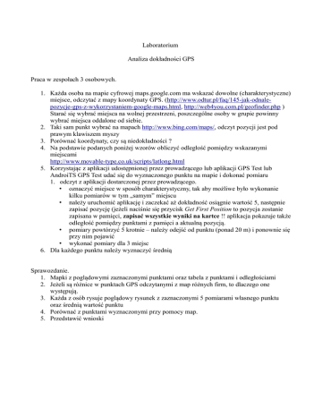 Laboratorium Analiza dokładności GPS Praca w zespołach 3 osobowych. 1. Każda osoba na mapie cyfrowej maps.google.com ma wskazać dowolne (charakterystyczne) miejsce, odczytać z mapy koordynaty GPS. (http://www.odtur.pl/faq/145-jak-odnalepozycje-gps-z-wykorzystaniem-google-maps.html, http://web4you.com.pl/geofinder.php ) Starać się wybrać miejsca na wolnej przestrzeni, poszczególne osoby w grupie powinny wybrać miejsca oddalone od siebie. 2. Taki sam punkt wybrać na mapach http://www.bing.com/maps/, odczyt pozycji jest pod prawym klawiszem myszy 3. Porównać koordynaty, czy są niedokładności ? 4. Na podstawie podanych poniżej wzorów obliczyć odległość pomiędzy wskazanymi miejscami http://www.movable-type.co.uk/scripts/latlong.html 5. Korzystając z aplikacji udostępnionej przez prowadzącego lub aplikacji GPS Test lub AndroiTS GPS Test udać się do wyznaczonego punktu na mapie i dokonać pomiaru 1. odczyt z aplikacji dostarczonej przez prowadzącego. • oznaczyć miejsce w sposób charakterystyczny, tak aby możliwe było wykonanie kilku pomiarów w tym „samym” miejscu • należy uruchomić aplikację i zaczekać aż dokładność osiągnie wartość 5, następnie zapisać pozycję (jeżeli naciśnie się przycisk Get First Position to pozycja zostanie zapisana w pamięci, zapisać wszystkie wyniki na kartce !! aplikacja pokazuje także odległość pomiędzy punktami z pamięci a aktualną pozycją. • pomiary powtórzyć 5 krotnie – należy odejść od punktu (ponad 20 m) i ponownie się przy nim pojawić • wykonać pomiary dla 3 miejsc 6. Dla każdego punktu należy wyznaczyć średnią Sprawozdanie. 1. Mapki z poglądowymi zaznaczonymi punktami oraz tabela z punktami i odległościami 2. Jeżeli są różnice w punktach GPS odczytanymi z map różnych firm, to dlaczego one występują. 3. Każda z osób rysuje poglądowy rysunek z zaznaczonymi 5 pomiarami własnego punktu oraz średnią wartość punktu 4. Porównać z punktami wyznaczonymi przy pomocy map. 5. Przedstawić wnioski