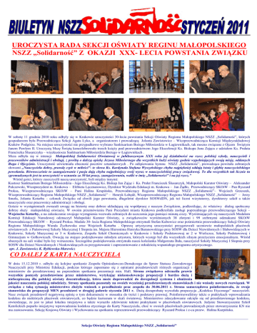 UROCZYSTA RADA SEKCJI OŚWIATY REGINU MAŁOPOLSKIEGO NSZZ „Solidarność” Z OKAZJI XXX- LECIA POWSTANIA ZWIĄZKU W sobotę 11 grudnia 2010 roku odbyły się w Krakowie uroczystości 30-lecia powstania Sekcji Oświaty Regionu Małopolskiego NSZZ „Solidarność”, których gospodarzem była Przewodnicząca Sekcji Agata Łyko, a organizatorem i prowadzącą Jolanta Zawistowicz – Wiceprzewodnicząca Komisji Międzyzakładowej Kraków Podgórze. Na miejsce uroczystości nie przypadkowo wybrano Sanktuarium Bożego Miłosierdzia w Łagiewnikach, tak mocno związane z Ojcem Świętym Janem Pawłem II. Uroczystą Mszę Świętą koncelebrowało trzech księży pod przewodnictwem Jego Ekscelencji Ks. Biskupa Jana Zająca z udziałem Ks. Prałata Franciszka Ślusarczyka – wicekustosza Sanktuarium Miłosierdzia Bożego w Łagiewnikach . Msza odbyła się w intencji Małopolskiej Solidarności Oświatowej w jubileuszowym XXX roku jej działalności na rzecz polskiej szkoły, nauczycieli i pracowników administracji i obsługi, z prośbą o dalszą opiekę Jezusa Miłosiernego dla wszystkich ludzi oświaty godnie wypełniających swoją misję, oddanych Bogu i Ojczyźnie. Uroczystość uświetniała obecność pocztów sztandarowych . Po odśpiewaniu hymnu NSZZ „Solidarność”, prowadząca powitała zebranych słowami „Nauczycielu dobry, prawdę czyń w miłości”- te słowa Ks. Kardynała Stefana Wyszyńskiego chyba najpiękniej oddają istotę i głębię nauczycielskiego powołania. Równocześnie to zaangażowanie i pasja dają chyba najpełniejszy swój wyraz w nauczycielskiej pracy związkowej. To dla wszystkich tak licznie tu zgromadzonych jest ta uroczystość w uznaniu za 30 lat pracy, zaangażowania, walki w imię „Solidarności” i na jej rzecz.” Wśród gości, którzy zaszczycili naszą uroczystość, byli między innymi: Kustosz Sanktuarium Bożego Miłosierdzia - Jego Ekscelencję Ks. Biskup Jan Zając i Ks. Prałat Franciszek Ślusarczyk, Małopolski Kurator Oświaty – Aleksander Palczewski, Wiceprezydent m. Krakowa – Elżbieta Lęcznarowicz, Dyrektor Wydziału Edukacji m. Krakowa – Jan Żądło, Przewodniczący SKOiW – Pan Ryszard Proksa, Wiceprzewodnicząca SKOiW – Pani Halina Krupińska, Przewodniczący Regionu Małopolskiego NSZZ „Solidarność”– Wojciech Grzeszek, Wiceprzewodniczący Regionu Małopolskiego NSZZ „Solidarność” – Henryk Łabędź, Wiceprzewodniczący Regionu Małopolskiego NSZZ „Solidarność” – Jerzy Smoła, Jolanta Kotarba – członek Związku od chwili jego powstania, długoletni dyrektor SOSWdDN, jak też liczni wizytatorzy, dyrektorzy szkół a także nauczyciele oraz pracownicy administracji i obsługi. Goście w wystąpieniach zwracali uwagę na historię oraz dobrze układającą się współpracę z naszym Związkiem, podkreślając, że właściwy dialog społeczny dobrze służy małopolskiej oświacie. W swoim przemówieniu Pani Prezydent miasta Krakowa podkreślała zasługi poprzedniego przewodniczącego Sekcji – Wojciecha Kotarby, a na zakończenie swojego wystąpienia wezwała zebranych do uczczenia jego pamięci minutą ciszy. Wyróżniających się nauczycieli Medalem Komisji Edukacji Narodowej odznaczył Małopolski Kurator Oświaty, a związkowców wyróżnionych 38 złotymi i 99 srebrnymi odznakami SKOiW Przewodniczący SKOiW – Ryszard Proksa. Medale 30- lecia Regionu Małopolskiego otrzymali Stefan Kubowicz oraz pośmiertnie przewodniczący Sekcji Oświaty Regionu Małopolskiego Wanda Żychowska oraz Wojciech Kotarba . Oprawę artystyczną uroczystości przygotowali uczniowie małopolskich placówek oświatowych z Państwowej Szkoły Muzycznej I Stopnia im. Majora Hieronima Henryka Baranowskiego przy SOSW dla Dzieci Niewidomych i Słabowidzących w Krakowie, Szkoły Muzycznej nr 3 w Krakowie, Zespołu Szkół Chemicznych w Krakowie i Szkoły Podstawowej nr 2 w Wieliczce, Szkoły Podstawowej i Gimnazjum w Gołkowicach. Owacją na stojąco podziękowano młodym artystom, których występ był dla wszystkich silnym przeżyciem emocjonalnym. Wśród obecnych na sali widać było łzy wzruszenia. Szczególne podziękowania otrzymała nasza koleżanka Małgorzata Bała, nauczyciel Szkoły Muzycznej I Stopnia przy SOSW dla Dzieci Niewidomych i Niedowidzących za przygotowanie i zaprezentowanie z młodzieżą wspaniałego programu artystycznego. opr. J. Zawistowicz K. Ryblewska-Marewicz CO DALEJ Z KARTĄ NAUCZYCIELA W dniu 15.12.2010 r. odbyło się kolejne spotkanie Zespołu Opiniodawczo-Doradczego do Spraw Statusu Zawodowego Nauczycieli przy Ministrze Edukacji, podczas którego zapoznano się z opiniami przedstawicieli różnych organizacji i ministerstw do przedstawionej na poprzednim spotkaniu prezentacji min. Hall. Strona związkowa odrzuciła prawie wszystkie pomysły przedstawione przez ministerstwo, wytykając niekonsekwencje propozycji i bardzo dużą i niebezpieczną dla polskiej oświaty decentralizację, która może doprowadzić do deregulacji systemu i obniżenia jakości nauczania polskiej młodzieży. Strony spotkania pozostały na swoich wcześniej przedstawionych stanowiskach i nie wniosły nowych rozwiązań. W związku z taką sytuacją ministerstwo złożyło wniosek o przedłużenie prac zespołu do 30.06.2011 r. Strona samorządowa poinformowała, że swoje stanowisko do propozycji MEN przedstawi w drugiej połowie stycznia 2011 r. Dużą dezaprobatę wywołała propozycja „Kodeksu Etycznego” nauczycieli. Nasz związek przedstawił negatywną opinię o tym dokumencie w stosunku do treści i podstawy prawnej. Poinformowaliśmy także o praktykach wprowadzania kodeksu do niektórych placówek oświatowych, co będzie kuriozum w skali światowej. Ministerstwo zdecydowanie odcięło się od przedstawionego kodeksu, stwierdzając, że jest to jakaś lokalna inicjatywa a także wyraziło zdziwienie takimi praktykami w placówkach oświatowych. Jedynie Stowarzyszenie Szkół 