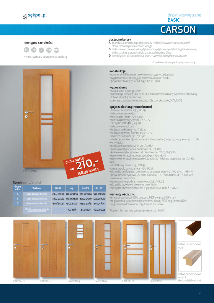 sękpol.pl drzwi wewnętrzne BASIC CARSON dostępne kolory dostępne szerokości 60 70 80 A: biały, buk, calvados, dąb, dąb bielony, mahoń (do wyczerpania zapasów), olcha, olcha klepkowa, orzech, wenge B: białe drewno, buk naturalny, dąb antyczny, dąb orange, dąb złoty, jabłoń ciemna, olcha struktura, orzech struktura, orzech ciemny, śliwa D: buk belgijski, olcha bawarska, orzech sycylijski, wenge bieszczadzkie 90 100 • inne rozmiary dostępne za dopłatą Charakterystyka grup kolorystycznych: str. 3 konstrukcja • ramiak z MDF (ramiak drewniany dostępny za dopłatą) • wypełnienie: stabilizująca warstwa „plaster miodu” • powierzchnia z płyty HDF o grubości 3mm wyposażenie • szyba satin deco, gr. 4mm • zamek wpuszczany 50x72 na klucz (możliwość zmiany na zamek z blokadą lub na wkładkę patentową) • zawiasy czopowe wkręcane, 2szt (3szt w skrzydle „90” i „100”) opcje za dopłatą (netto/brutto) 210,etto cena n od CARSON 04 tto 0 bru 258,3 Cennik (netto/ brutto) Grupa kolor. 01 i 02 Szklenie 03 04 i 05 06 i 07 A Satin deco lub chinchila 210,-/ 258,30 210,-/ 258,30 220,-/ 270,60 300,-/369,00 B Satin deco lub chinchila 410,-/ 504,30 410,-/ 504,30 420,-/ 516,60 500,-/615,00 D Satin deco lub chinchila 250,-/ 307,50 250,-/ 307,50 255,-/ 313,65 340,-/418,20 Dopłata za zmianę szklenia: lacomat lub satin lines - 16,-/ 19,68 49,-/ 60,27 124,-/152,52 • ramiak drewniany: 23,-/ 28,29 nietypowa szerokość: • różnica do 5mm: 35,-/ 43,05 • różnica powyżej 5mm: 65,-/ 79,95 • skrzydło „110”: 40,-/ 49,20 nietypowa wysokość: • krótsze do 60mm: 30,-/ 36,90 • krótsze powyżej 60mm: 45,-/ 55,35 • dłuższe do 15mm: 30,-/ 36,90 • dłuższe powyżej 15mm: wycena indywidualna (dotyczy grupy koloryst. B i D) wentylacja: • podcięcie wentylacyjne: 20,-/24,60 • kratka wentylacyjna z tworzywa: 35,-/43,05 • kratka wentylacyjna ze stali nierdzewnej: 200,-/246,00 • tuleje wentylacyjne z tworzywa (kpl): 15,-/ 18,45 • tuleje wentylacyjne metalowe, w kolorze nikiel lub brąz (szt): 20,-/24,60 inne: • dodatkowy zawias: 15,-/ 18,45 • zmiana położenia zamka: 45,-/ 55,35 • skrzydło bezfelcowe do systemu przesuwnego: 45,-/ 55,35 (str. 46-47) • drzwi dwuskrzydłowe: 2x cena skrzydła + 70,-/ 86,10 (str. 45) + dopłata za ramiak drewniany • wzmocnienie pod samozamykacz: 35,-/ 43,05 • skrzydło drzwiowe dwukolorowe: 50% • skrzydło drzwiowe z felcem o głębokości 20mm: 67,-/82,41 warianty ościeżnic • stała: drewniana, MDF standard, MDF owalna, MDF slant • regulowana: zabudowa ościeżnicy stalowej ZOS, regulowana DIN, regulowana drewniana, regulowana exclusive. Więcej informacji na temat ościeżnic: str. 50-57. listwa przyszybowa wzór 1 CARSON 01 CARSON 02 CARSON 03 CARSON 05 CARSON 06 CARSON 07 listwa przyszybowa wzór 2 (kolor: dąb bielony) 23 sękpol.pl biały Grupa kolorystyczna B białe drewno akacja Grupa kolorystyczna D buk calvados dąb dąb bielony mahoń* olcha olcha orzech klepkowa wenge Znakomita propozycja dla klientów chcących połączyć jakość z atrakcyjna ceną. Produkty wykonane z tej gamy kolorystycznej są trwałe, eleganckie, zapewniają długoletnie użytkowanie i zadowolenie klienta. Łączą w sobie cechy dobrego produktu w przystępnej cenie. Szeroka gama kolorystyczna pozwoli zaspokoić gusta każdego klienta. Skrzydła drzwiowe wykończone HDF lakierowanym charakteryzują się podwyższoną odpornością powierzchni poprzez wykończenie jej bezbarwnym lakierem UV, posiadają klasyczny rysunek drewna, są łatwe w utrzymaniu czystości i pielęgnacji. Ościeżnice drzwiowe wykończone okleiną dobraną kolorystycznie do skrzydła drzwiowego. Grupa kolorystyczna C Grupa kolorystyczna A KOLORYSTYKA buk dąb naturalny antyczny dąb orange dąb złoty jabłoń ciemna olcha struktura orzech struktura orzech ciemny śliwa Drzwi foliowane znajdują zastosowanie zarówno w budynkach mieszkalnych, jak i w biurach, hotelach oraz obiektach użyteczności publicznej. Grupa kolorystyczna zapewniająca niepowtarzalny charakter oraz niezmienną funkcjonalność. Skrzydła drzwiowe i ościeżnice wykończone folią PCV o grubości 0,3mm - 0,35mm posiadają, oprócz rysunku drewna, wyczuwalną strukturę, dzięki czemu do złudzenia imitują naturalne drewno. Drzwi charakteryzują się odpornością na ścieranie, zarysowania, na światło, nie odbarwiają się i nie plamią, są również wytrzymałe na uszkodzenia mechaniczne. biały mat dąb dąb hiszpański miodowy dąb stary heban modrzew bielony modrzew czarny modrzew szary Wykończenie skrzydeł drzwiowych i ościeżnic wysokiej jakości fornirem syntetycznym łączy w sobie funkcjonalność z elegancją i prostotą. To sprawia, że wybierane są nie tylko do mieszkań, ale i biur czy hoteli. Niepowtarzalne kolory nadają wnętrzu wyjątkowy charakter. Laminat CLPL o grubości 0,1mm 0,2mm złożony jest z dekoru pokrytego melaminowo - akrylowo - poliuretanową żywicą. Drzwi wykończone fornirem syntetycznych do złudzenia imitują naturalny fornir, jednocześnie charakteryzując się odpornością na ścieranie, zarysowania, na światło, na gorąco w próbie na sucho, na gorąco w próbie na mokro, nie odbarwiają się i nie plamią. buk belgijski olcha bawarska orzech sycylijski wenge bieszczadzkie Produkty z grupy kolorystycznej D to propozycja dla klientów szukających efektownych rozwiązań w przystępnej cenie. Zarówno skrzydła drzwiowe jak i ościeżnice wykończone są odporną na ścieranie folią finish, posiadającą klasyczny rysunek drewna. Staranne wykonanie nadaje wnętrzu niepowtarzalny charakter. Produkty charakteryzuje się łatwością w utrzymaniu i pielęgnacji. *kolor mahoń do wyczerpania zapasów SZYBY kora biała chinchila satin deco satin lines lacomat satin macadi - szkło hartowane satin sapporo - szkło hartowane