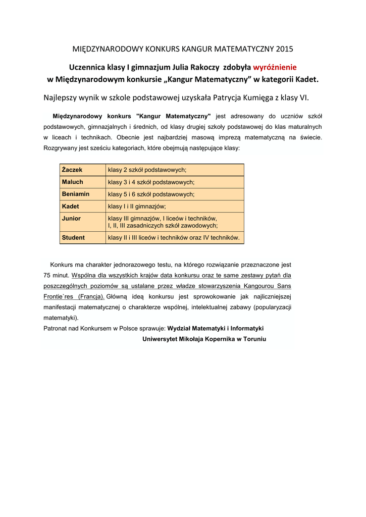 MIĘDZYNARODOWY KONKURS KANGUR MATEMATYCZNY 2015 Uczennica klasy I gimnazjum Julia Rakoczy zdobyła wyróżnienie w Międzynarodowym konkursie „Kangur Matematyczny” w kategorii Kadet. Najlepszy wynik w szkole podstawowej uzyskała Patrycja Kumięga z klasy VI. Międzynarodowy konkurs "Kangur Matematyczny" jest adresowany do uczniów szkół podstawowych, gimnazjalnych i średnich, od klasy drugiej szkoły podstawowej do klas maturalnych w liceach i technikach. Obecnie jest najbardziej masową imprezą matematyczną na świecie. Rozgrywany jest sześciu kategoriach, które obejmują następujące klasy: Żaczek klasy 2 szkół podstawowych; Maluch klasy 3 i 4 szkół podstawowych; Beniamin klasy 5 i 6 szkół podstawowych; Kadet klasy I i II gimnazjów; Junior klasy III gimnazjów, I liceów i techników, I, II, III zasadniczych szkół zawodowych; Student klasy II i III liceów i techników oraz IV techników. Konkurs ma charakter jednorazowego testu, na którego rozwiązanie przeznaczone jest 75 minut. Wspólna dla wszystkich krajów data konkursu oraz te same zestawy pytań dla poszczególnych poziomów są ustalane przez władze stowarzyszenia Kangourou Sans Frontie`res (Francja). Główną ideą konkursu jest sprowokowanie jak najliczniejszej manifestacji matematycznej o charakterze wspólnej, intelektualnej zabawy (popularyzacji matematyki). Patronat nad Konkursem w Polsce sprawuje: Wydział Matematyki i Informatyki Uniwersytet Mikołaja Kopernika w Toruniu
