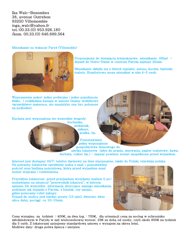 Ika Walc-Bezombes 38, avenue Outrebon 93250 Villemomble [email protected] tel.:00.33.(0) 953.926.180 /kom. 00.33.(0) 646.689.564 Mieszkanie na wakacje Paryż (Villemoble) Proponujemy do wynajęcia trzypokojowe mieszkanie (60m) dojazd do Notre-Dame w centrum Paryża zajmuje 25min. Mieszkanie składa się z dwóch sypialni, salonu, kuchni, łazienki, toalety. Komfortowo moze mieszkać w nim 4-5 osob. Wyposazenie pokoi: jedno podwojne i jedno pojedyncze łózko, i rozkładana kanapa w salonie (mamy dodatkowe «prawdziwe» materace, ale musialyby one byc polozone na podlodze). Kuchnia jest wyposażona we wszystkie wygody: kuchenka, piekarnik, mikser, pralka, itp. Pozostawiamy pełne wyposażenie gospodarstwa domowego do użytku lokatorów (płyn do prania, zmywania, papier toaletowy, kawa, herbata, cukier itp.) - zapasy powinny zostać uzupełnione przed wyjazdem. Internet jest dostępny 24/7; telefon darmowy na linie stacjonarne, także do Polski, telewizja polska. Na potrzeby lokatorów opróżnimy jedna z szaf, i pozostawimy pościel oraz bieliznę pościelowa, która przed wyjazdem musi zostać wyprana i rozwieszona. Przyszłym lokatorom przed przyjazdem wysyłamy mailem (i pozostawiamy na miejscu) “przewodnik lokatora”, w którym spisane SA wszystkie informacje dotyczące samego mieszkania, podobnie jak dojazdu z Paryża, z lotnisk, czy miejsc, gdzie polecamy robić zakupy. Dojazd do stolicy jest bardzo prosty (15 min), dworzec dwie ulice dalej, pociągi co 10-15min. Cena wynajmu za tydzień : 400€, za dwa tyg. : 700€, dla orientacji cena za nocleg w schronisku młodzieżowym w Paryżu w sali wieloosobowej wynosi 23€ za dobę od osoby, czyli około 800€ na tydzień dla 5 osób. Z lokatorami spisujemy standardowa umowę o wynajem na okres letni. Możliwe daty: druga polwa lipieca i sierpien