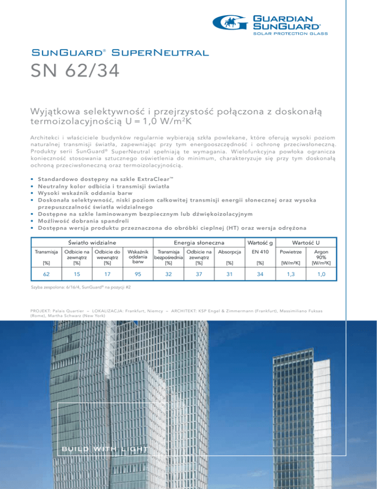 SunGuard SuperNeutral ® SN 62/34 Wyjątkowa selektywność i przejrzystość połączona z doskonałą termoizolacyjnością U = 1,0 W/m 2K Architekci i właściciele budynków regularnie wybierają szkła powlekane, które oferują wysoki poziom naturalnej transmisji światła, zapewniając przy tym energooszczędność i ochronę przeciwsłoneczną. Produkty serii SunGuard ® SuperNeutral spełniają te wymagania. Wielofunkcyjna powłoka ogranicza konieczność stosowania sztucznego oświetlenia do minimum, charakteryzuje się przy tym doskonałą ochroną przeciwsłoneczną oraz termoizolacyjnością. • • • • Standardowo dostępny na szkle ExtraClear ™ Neutralny kolor odbicia i transmisji światła Wysoki wskaźnik oddania barw D oskonała selektywność, niski poziom całkowitej transmisji energii słonecznej oraz wysoka przepuszczalność światła widzialnego • Dostępne na szkle laminowanym bezpiecznym lub dźwiękoizolacyjnym • Możliwość dobrania spandreli • Dostępna wersja produktu przeznaczona do obróbki cieplnej (HT) oraz wersja odrężona Światło widzialne Transmisja Energia słoneczna [%] Odbicie na zewnątrz [%] Odbicie do wewnątrz [%] Wskaźnik oddania barw 62 15 17 95 Transmisja Odbicie na bezpośrednia zewnątrz [%] [%] 32 37 Wartość g Wartość U Absorpcja EN 410 Powietrze [%] [%] [W/m²K] Argon 90% [W/m²K] 31 34 1,3 1,0 Szyba zespolona: 6/16/4, SunGuard® na pozycji #2 PROJEKT: Palais Quartier – LOKALIZACJA: Frankfurt, Niemcy – ARCHITEKT: KSP Engel & Zimmermann (Frankfurt), Massimiliano Fuksas (Rome), Martha Schwarz (New York) Produkty serii SunGuard ® dostępne są w różnych miejscach w Europie za pośrednictwem niezależnej sieci zakładów przetwarzających szkło GUARDIANa. W celu uzyskania dodatkowych informacji, należy skontaktować się z lokalnym przedstawicielem firmy GUARDIAN. GUARDIAN Industries U.K. Ltd. GUARDIAN Luxguard I, S.A. GUARDIAN Glass España, S.L. GUARDIAN Orosháza Kft. United Kingdom Luxembourg Spain Hungary Phone: 0044 (0) 800 032 6322 Phone: 00 352 50301 Phone: 00 34 948 817255 Phone: 0036 (0) 68 887 200 e-Mail: [email protected] e-Mail: sales_bascharage@ e-Mail: [email protected] e-Mail: oroshaza_sales@ guardian.com guardian.com GUARDIAN Thalheim GmbH GUARDIAN Częstochowa Sp. z o.o. GUARDIAN Steklo Ryazan LLC Germany Poland Russia Phone: 0049 (0) 3494 361 800 Phone: 0048 (0) 34 323 9200 Phone: 007 (8) 4912 956600 e-Mail: anwendungstechnik@ e-Mail: tech_poland@ e-Mail: [email protected] guardian.com guardian.com Podane wartości są wartościami nominalnymi podlegającymi tolerancjom produkcyjnym. Podane wartości spektrofotometryczne są zgodne z EN 410; wartości współczynnika przenikania ciepła U są zgodne z EN 673. Sprzedaż produktów przedstawionych w tej publikacji podlega ogólnym warunkom sprzedaży firmy GUARDIAN, jak rownież dodatkowym obowiązującym pisemnym gwarancjom. Nabywca jest odpowiedzialny za potwierdzenie, że produkty są odpowiednie do ich zamierzonego zastosowania. W celu uzyskania wszelkich stosownych instrukcji użytkowania i obsługi, jak rownież aktualnych informacji o produkcie, prosimy o kontakt z Państwa lokalnym przedstawicielem firmy GUARDIAN. www.sunguardglass.pl GUARDIAN Europe Numer referencyjny: 6-16-4 / HS SN 62/34 / PL / 12-11 ©2011 GUARDIAN Industries Corp. Nazwa SunGuard ® jest zastrzeżonym znakiem towarowym należącym do GUARDIAN Industries Corp.