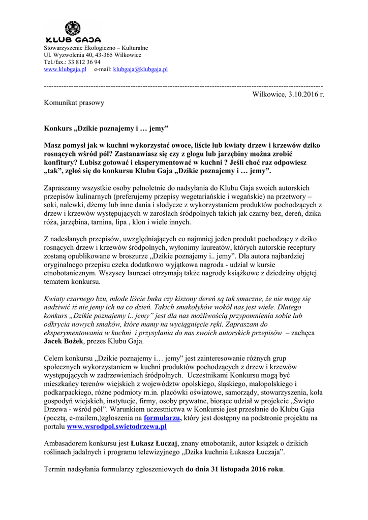 Stowarzyszenie Ekologiczno – Kulturalne Ul. Wyzwolenia 40, 43-365 Wilkowice Tel./fax.: 33 812 36 94 www.klubgaja.pl e-mail: [email protected] ----------------------------------------------------------------------------------------------------------------Wilkowice, 3.10.2016 r. Komunikat prasowy Konkurs „Dzikie poznajemy i … jemy” Masz pomysł jak w kuchni wykorzystać owoce, liście lub kwiaty drzew i krzewów dziko rosnących wśród pól? Zastanawiasz się czy z głogu lub jarzębiny można zrobić konfitury? Lubisz gotować i eksperymentować w kuchni ? Jeśli choć raz odpowiesz „tak”, zgłoś się do konkursu Klubu Gaja „Dzikie poznajemy i … jemy”. Zapraszamy wszystkie osoby pełnoletnie do nadsyłania do Klubu Gaja swoich autorskich przepisów kulinarnych (preferujemy przepisy wegetariańskie i wegańskie) na przetwory – soki, nalewki, dżemy lub inne dania i słodycze z wykorzystaniem produktów pochodzących z drzew i krzewów występujących w zaroślach śródpolnych takich jak czarny bez, dereń, dzika róża, jarzębina, tarnina, lipa , klon i wiele innych. Z nadesłanych przepisów, uwzględniających co najmniej jeden produkt pochodzący z dziko rosnących drzew i krzewów śródpolnych, wyłonimy laureatów, których autorskie receptury zostaną opublikowane w broszurze „Dzikie poznajemy i.. jemy”. Dla autora najbardziej oryginalnego przepisu czeka dodatkowo wyjątkowa nagroda - udział w kursie etnobotanicznym. Wszyscy laureaci otrzymają także nagrody książkowe z dziedziny objętej tematem konkursu. Kwiaty czarnego bzu, młode liście buka czy kiszony dereń są tak smaczne, że nie mogę się nadziwić iż nie jemy ich na co dzień. Takich smakołyków wokół nas jest wiele. Dlatego konkurs „Dzikie poznajemy i.. jemy” jest dla nas możliwością przypomnienia sobie lub odkrycia nowych smaków, które mamy na wyciągnięcie ręki. Zapraszam do eksperymentowania w kuchni i przysyłania do nas swoich autorskich przepisów – zachęca Jacek Bożek, prezes Klubu Gaja. Celem konkursu „Dzikie poznajemy i… jemy” jest zainteresowanie różnych grup społecznych wykorzystaniem w kuchni produktów pochodzących z drzew i krzewów występujących w zadrzewieniach śródpolnych. Uczestnikami Konkursu mogą być mieszkańcy terenów wiejskich z województw opolskiego, śląskiego, małopolskiego i podkarpackiego, różne podmioty m.in. placówki oświatowe, samorządy, stowarzyszenia, koła gospodyń wiejskich, instytucje, firmy, osoby prywatne, biorące udział w projekcie „Święto Drzewa - wśród pól”. Warunkiem uczestnictwa w Konkursie jest przesłanie do Klubu Gaja (pocztą, e-mailem,)zgłoszenia na formularzu, który jest dostępny na podstronie projektu na portalu www.wsrodpol.swietodrzewa.pl Ambasadorem konkursu jest Łukasz Łuczaj, znany etnobotanik, autor książek o dzikich roślinach jadalnych i programu telewizyjnego „Dzika kuchnia Łukasza Łuczaja”. Termin nadsyłania formularzy zgłoszeniowych do dnia 31 listopada 2016 roku. Regulamin konkursu >>>>> Formularz zgłoszeniowy do konkursu >>>>> Konkurs „Dzikie poznajemy i…jemy” prowadzony jest w ramach projektu Klubu Gaja „Święto Drzewa – wśród pól”, który został dofinansowany ze środków Narodowego Funduszu Ochrony Środowiska i Gospodarki Wodnej i Wojewódzkiego Funduszu Ochrony Środowiska i Gospodarki Wodnej w Katowicach. Projekt poświęcony jest zadrzewieniom i zakrzewieniom śródpolnym na terenach rolniczych, ich znaczeniu w ochronie różnorodności biologicznej i przeciwdziałaniu zmianom klimatu, a także korzyściom jakie przynoszą one dla zdrowia obywateli i rozwoju zrównoważonego. W ten sposób Klub Gaja zachęca mieszkańców terenów wiejskich do podejmowania lokalnych działań na rzecz ich sadzenia i ochrony. Występujące na obszarach rolniczych różnego typu zadrzewienia stanowią o niepowtarzalnym pięknie krajobrazu i podnoszą walory wypoczynkowe miejscowości. Są także ostoją dzikiej przyrody i wielkim sojusznikiem rolników. Więcej informacji: www.wsrodpol.swietodrzewa.pl www.swietodrzewa.pl www.klubgaja.pl Fot. Klub Gaja / M. Karetta Kontakt: Jacek Bożek – prezes Klubu Gaja – 603 636 554 Jolanta Migdał – koordynatorka programu Święto Drzewa – wśród pól – 609 495 871 Dofinansowanie: