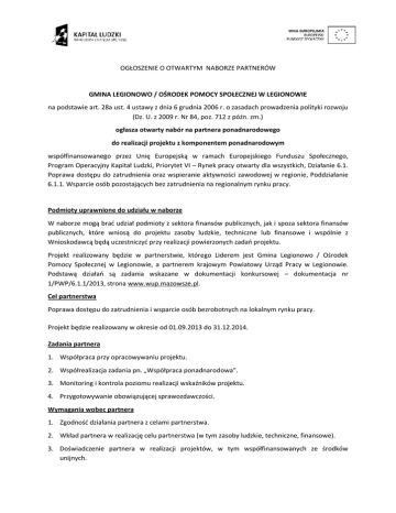 OGŁOSZENIE O OTWARTYM NABORZE PARTNERÓW GMINA LEGIONOWO / OŚRODEK POMOCY SPOŁECZNEJ W LEGIONOWIE na podstawie art. 28a ust. 4 ustawy z dnia 6 grudnia 2006 r. o zasadach prowadzenia polityki rozwoju (Dz. U. z 2009 r. Nr 84, poz. 712 z późn. zm.) ogłasza otwarty nabór na partnera ponadnarodowego do realizacji projektu z komponentem ponadnarodowym współfinansowanego przez Unię Europejską w ramach Europejskiego Funduszu Społecznego, Program Operacyjny Kapitał Ludzki, Priorytet VI – Rynek pracy otwarty dla wszystkich, Działanie 6.1. Poprawa dostępu do zatrudnienia oraz wspieranie aktywności zawodowej w regionie, Poddziałanie 6.1.1. Wsparcie osób pozostających bez zatrudnienia na regionalnym rynku pracy. Podmioty uprawnione do udziału w naborze W naborze mogą brać udział podmioty z sektora finansów publicznych, jak i spoza sektora finansów publicznych, które wniosą do projektu zasoby ludzkie, techniczne lub finansowe i wspólnie z Wnioskodawcą będą uczestniczyć przy realizacji powierzonych zadań projektu. Projekt realizowany będzie w partnerstwie, którego Liderem jest Gmina Legionowo / Ośrodek Pomocy Społecznej w Legionowie, a partnerem krajowym Powiatowy Urząd Pracy w Legionowie. Podstawą działań są zadania wskazane w dokumentacji konkursowej – dokumentacja nr 1/PWP/6.1.1/2013, strona www.wup.mazowsze.pl. Cel partnerstwa Poprawa dostępu do zatrudnienia i wsparcie osób bezrobotnych na lokalnym rynku pracy. Projekt będzie realizowany w okresie od 01.09.2013 do 31.12.2014. Zadania partnera 1. Współpraca przy opracowywaniu projektu. 2. Współrealizacja zadania pn. „Współpraca ponadnarodowa”. 3. Monitoring i kontrola poziomu realizacji wskaźników projektu. 4. Przygotowywanie obowiązującej sprawozdawczości. Wymagania wobec partnera 1. Zgodność działania partnera z celami partnerstwa. 2. Wkład partnera w realizację celu partnerstwa (w tym zasoby ludzkie, techniczne, finansowe). 3. Doświadczenie partnera w realizacji projektów, w tym współfinansowanych ze środków unijnych. 4. Doświadczenie w realizacji projektów w partnerstwie ponadnarodowym. 5. Doświadczenie merytoryczne w działaniach na rzecz aktywizacji zawodowej osób pozostających bez zatrudnienia. Przy wyborze partnera oceniane będzie: 1. Zgodność działania partnera z celem partnerstwa. 2. Oferowany wkład partnera w realizację celu partnerstwa. 3. Doświadczenie partnera w realizacji projektów, w tym współfinansowanych ze środków unijnych. Procedura wyboru partnera: 1. Podstawą przystąpienia do udziału w naborze jest złożenie oferty współpracy wypełnionej zgodnie z obowiązującym wzorem w języku polskim lub angielskim, dostępnym w Biuletynie Informacji Publicznej Ośrodka Pomocy Społecznej w Legionowie na stronie internetowej http://opslegionowo.pl/sados81/bip/index.php. 2. Oferty należy składać w zamkniętej kopercie z adnotacją: Otwarty Nabór 6.1.1. POKL 2013 (w języku polskim) lub Open Call 6.1.1. POKL 2013 (w języku angielskim). Oferty współpracy można składać osobiście, drogą pocztową lub pocztą elektroniczną na adres e-mail: [email protected]. Miejsce składania ofert współpracy: Ośrodek Pomocy Społecznej w Legionowie, ul. Aleja 3 Maja 28, 05-120 Legionowo w godzinach od. 8.00 do 16.00. 3. Termin składania ofert upływa dnia 2 maja 2013 r. o godz. 14.00. O zachowaniu terminu decyduje data wpływu oferty współpracy do sekretariatu Ośrodka Pomocy Społecznej w Legionowie. 4. Zgodnie z zapisami art. 28a ust. 4 ustawy z dnia 6 grudnia 2006 r. o zasadach prowadzenia polityki rozwoju (Dz. U. z 2009 r. Nr 84, poz. 712 z późn. zm.) oferty współpracy przyjmowane są przez okres 21 dni od dnia opublikowania ogłoszenia. Na potrzeby niniejszego naboru przyjmuje się, że wskazany okres będzie liczony w dniach kalendarzowych. Ostatnim dniem jest 21 dzień od dnia opublikowania ogłoszenia. 5. O dochowaniu terminu składania ofert decyduje data wpływu oferty do Ośrodka Pomocy Społecznej w Legionowie. 6. Oferty współpracy dostarczone w inny sposób lub po terminie nie będą rozpatrywane. 7. Osoba do kontaktu w sprawie otwartego naboru – Pani Anna Brzezińska tel. +48 22 774 08 66, e-mail: [email protected]. 8. Wyniki naboru zostaną ogłoszone w terminie 2 maja 2013 r. w Biuletynie Informacji Publicznej Ośrodka Pomocy Społecznej w Legionowie na stronie internetowej http://opslegionowo.pl/sados81/bip/index.php. 9. Partner ponadnarodowy zobowiązany jest do dołączenia podpisanego Listu intencyjnego do składanej oferty współpracy. Załączniki: 1. Wzór oferty współpracy w języku polskim i angielskim. 2. Wzór listu intencyjnego w języku polskim i angielskim. Ogłaszający zastrzega sobie prawo do odstąpienia od otwartego naboru bez podania przyczyny, swobodnego wyboru ofert oraz prawo zamknięcia naboru bez wyboru którejkolwiek z ofert, jak również zawieszenia naboru na każdym etapie. Partnerowi nie przysługują z tego tytułu jakiekolwiek roszczenia wobec Ogłaszającego. Załącznik nr 1 OFFER OF COOPERATION in an open recruitment for the transnational and national partner to implementation of the project with the transnational component, covered by the European Union, European Social Fund, Human Capital Operational Programme, Priority VI - The labour market open for all, Measure 6.1, Sub – measure 6.1.1. Date of partner: 1. Name of institution 2. Type of organization 3. Date of creation 4. Address 5. Telephone 6. Fax 7. E-mail 8. http:// Additional information: 1. Full names and functions of persons authorized to represent the principal in dealing and possessing the ability to make financial commitments on behalf of the subject (conclusion of agreements): ……………………………………………………………………………………………………………………………………………… ………………………………………………………………………
