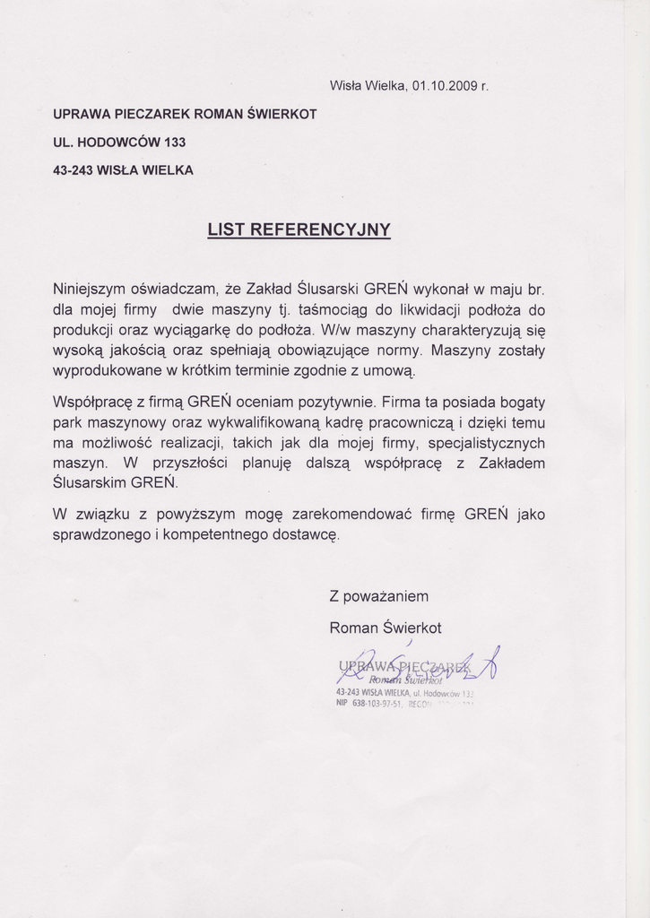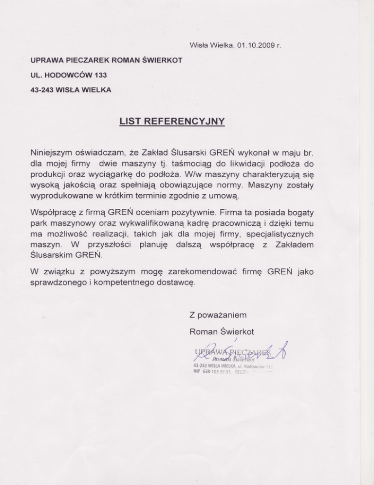 WistaWielka,01.10.2009 r. UPRAWA PIECZAREK ROMAN SWIERKOT UL. HODOWCOW133 43.243W|sŁAWIELKA LIST REFERENCYJNY oswiadczam,Ze ZakładSlusarskiGREN wykonał Ninlejszym w majubr' podłozado dla mojejfirmy dwie maszynytj taŚmociągdo |ikwidacji produkcjioraz wyciągarkędo podłoza. W/w maszynycharakteryzują się wysokąjakościąoraz spetniająobowiązujące normy.Maszyny zostały W krotkimterminiezgodniez umową. wyprodukowane zfirmąGREŃ oceniampozytywnie. Wspołpracę Firmata posiadabogaty parkmaszynowyoraz wykwalifikowaną kadrępracowniczą i dziękitemu ma moŻ|iwosc reaIizacji,takich jak dla mojejfirmy,specjalistycznych maszyn. W przyszłosci p|anuję dalszą wspotpracę z Zakładem Slusarskim GREN. W związkuz powyzszym mogę zarekomendowacfirmę GREN jako i kompetentnego dostawcę. sprawdzonego Z powaŻaniem RomanSwierkot