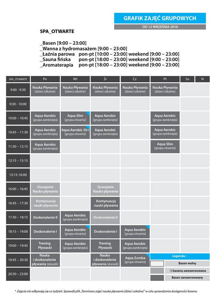 GRAFIK ZAJĘĆ GRUPOWYCH OD 12 WRZEŚNIA 2016 SPA_OTWARTE _Basen [9:00 – 23:00] _Wanna z hydromasażem [9:00 – 23:00] _Łaźnia parowa pon-pt [10:00 – 23:00] weekend [9:00 – 23:00] pon-pt [18:00 – 23:00] weekend [9:00 – 23:00] _Sauna fińska _Aromaterapia pon-pt [18:00 – 23:00] weekend [9:00 – 23:00] SPA_OTWARTE 9:00 - 9:30 Pn Wt Śr Cz Pt Nauka Pływania Nauka Pływania Nauka Pływania Nauka Pływania Nauka Pływania [dzieci szkolne] [dzieci szkolne] [dzieci szkolne] [dzieci szkolne] So N [dzieci szkolne] 9:30 - 10:00 Aqua Aerobic Aqua Slim 10:00 – 10:45 [grupa zamknięta] [grupa otwarta] 10:45 – 11:30 [grupa zamknięta] Aqua Aerobic Aqua Aerobic 50+ 11:30 – 12:15 [grupa otwarta] Aqua Aerobic Aqua Aerobic [grupa zamknięta] [grupa zamknięta] Aqua Aerobic Aqua Aerobic [grupa zamknięta] [grupa zamknięta] Aqua Slim Aqua Aerobic [grupa otwarta] [grupa zamknięta] 12:15 – 15:15 15:15-16:00 16:00 – 16:45 Oswajanie Nauka pływania Oswajanie Nauka pływania 16:45 – 17:30 Kontynuacja nauki pływania Kontynuacja nauki pływania 17:30 – 18:15 Doskonalenie II 18:15 – 19:00 Doskonalenie I 19:00 – 19:45 Trening Pływacki 19:45 – 20:30 Nauka i doskonalenie pływania [dorośli] Aqua Aerobic [grupa zamknięta] Doskonalenie II Aqua Aerobic Doskonalenie I Aqua Aerobic Trening Pływacki [grupa otwarta] [grupa zamknięta] Nauka i doskonalenie pływania [dorośli] Aqua Aerobic [grupa otwarta] Aqua Aerobic [grupa zamknięta] Legenda : Aqua Zumba [grupa otwarta] Basen wolny 1 20:30 – 23:00 2 basenu zarezerwowana Basen zarezerwowany * Zajęcia nie odbywają się co tydzień. Sprawdź plik „Terminarz zajęć nauka pływania [dzieci szkolne]” w celu sprawdzenia dostępności basenu CENNIK SPA_otwarte SPA do 18:00 (poniedziałek-piątek) SPA po 18:00 (poniedziałek-piątek) oraz weekendy + Basen + Wanna z hydromasażem + Łaźnia parowa od godz. 10:00 + Pomieszczenie do wypoczynku CENA* wejście jednorazowe + Basen + Wanna z hydromasażem + Łaźnia parowa od godz. 10:00 + Sauna fińska (sucha) + Pomieszczenie do wypoczynku CENA* wejście jednorazowe 24,00 zł za 60 min 36,00 zł za 60 min dzieci do lat 3 – GRATIS (pieluszka obowiązkowa dostępna w SPA) dzieci do lat 10 – zniżka 50% od ceny standardowej (wyłącznie pod opieką osoby dorosłej) dzieci do lat 3 – GRATIS (pieluszka obowiązkowa dostępna w SPA) dzieci do lat 10 – zniżka 50% od ceny standardowej (wyłącznie pod opieką osoby dorosłej) *naliczanie minutowe według obowiązującego cennika *naliczanie minutowe według obowiązującego cennika Do zabiegów powyżej 200 zł - SPA_otwarte - GRATIS (jedna godzina przed zabiegami) *SPA_otwarte dla gości hotelowych jest bezpłatne CENNIK KARNET SPA_open Karnet srebrny [poniedziałek-piątek 9.00-18.00] Karnet roczny Karnet roczny Karnet miesięczny Karnet złoty [open] Cena za miesiąc Cena karnetu Cena za miesiąc Cena karnetu 165 PLN 200 PLN 250 PLN 1990 PLN 2 x 1190 PLN 250 PLN 250 PLN 300 PLN 350 PLN 2990 PLN 2 x 1790 PLN 350 PLN *SPA_otwarte dla gości hotelowych jest bezpłatne CENNIK zajęć grupowych Aqua zumba [45 min] KARNET miesięczny 175 PLN 1 razowo 50 PLN 40 PLN Aqua aerobic grupy poranne [45 min] KARNET 2,5 miesięczny KARNET 5 miesięczny Aqua aerobic grupy popołudniowe [45 min] KARNET 2,5 miesięczny KARNET 5 miesięczny 300 PLN 500 PLN [10 zajęć] [20 zajęć] Kwota za jedne zajęcia - 30 pln Kwota za jedne zajęcia - 25 pln Nauka pływania [45 min] KARNET 2,5 miesięczny KARNET semestralny 350 PLN 600 PLN [10 zajęć] [20 zajęć] Kwota za jedne zajęcia - 35 pln Kwota za jedne zajęcia - 30 pln Nauka pływania lekcje indywidualne [45 min] 250 PLN 400 PLN [10 zajęć] [20 zajęć] Kwota za jedne zajęcia - 25 pln Kwota za jedne zajęcia - 20 pln 1 razowo 30 PLN 1 razowo 40 PLN 1 razowo 50 PLN 1 osoba - 80 PLN 2 osoby - 130 PLN 3 osoby - 165 PLN * Uczestnictwo w zajęciach grupowych jest zagwarantowane poprzez zapisanie się na listę uczestników oraz zakupienie karnetu.