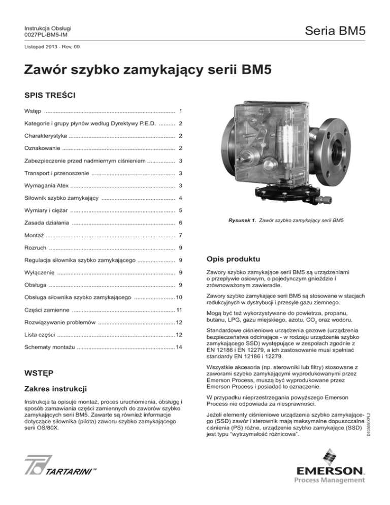 Seria BM5 Instrukcja Obsługi 0027PL-BM5-IM Listopad 2013 - Rev. 00 Zawór szybko zamykający serii BM5 SPIS TREŚCI Wstęp ................................................................................. 1 Kategorie i grupy płynów według Dyrektywy P.E.D. ........... 2 Charakterystyka ................................................................. 2 Oznakowanie . .................................................................... 2 Zabezpieczenie przed nadmiernym ciśnieniem ................. 3 Transport i przenoszenie .................................................... 3 Wymagania Atex ................................................................ 3 Siłownik szybko zamykający .............................................. 4 Wymiary i ciężar ................................................................. 5 Zasada działania ................................................................ 6 Rysunek 1. Zawór szybko zamykający serii BM5 Montaż . .............................................................................. 7 Rozruch .............................................................................. 9 Regulacja siłownika szybko zamykającego . ...................... 9 Opis produktu Wyłączenie ......................................................................... 9 Zawory szybko zamykające serii BM5 są urządzeniami o przepływie osiowym, o pojedynczym gnieździe i zrównoważonym zawieradle. Obsługa .............................................................................. 9 Obsługa siłownika szybko zamykającego ..........................10 Części zamienne ................................................................11 Rozwiązywanie problemów ................................................12 Lista części .........................................................................12 Schematy montażu . ...........................................................14 Zawory szybko zamykające serii BM5 są stosowane w stacjach redukcyjnych w dystrybucji i przesyle gazu ziemnego. Mogą być też wykorzystywane do powietrza, propanu, butanu, LPG, gazu miejskiego, azotu, CO2 oraz wodoru. Standardowe ciśnieniowe urządzenia gazowe (urządzenia bezpieczeństwa odcinające - w rodzaju urządzenia szybko zamykającego SSD) występujące w zespołach zgodnie z EN 12186 i EN 12279, a ich zastosowanie musi spełniać standardy EN 12186 i 12279. Wszystkie akcesoria (np. sterowniki lub filtry) stosowane z zaworami szybko zamykającymi wyprodukowanymi przez Emerson Process, muszą być wyprodukowane przez Emerson Process i posiadać to oznaczenie. Zakres instrukcji Instrukcja ta opisuje montaż, proces uruchomienia, obsługę i sposób zamawiania części zamiennych do zaworów szybko zamykających serii BM5. Zawarte są również informacje dotyczące siłownika (pilota) zaworu szybko zamykającego serii OS/80X. TM W przypadku nieprzestrzegania powyższego Emerson Process nie odpowiada za niesprawności. Jeżeli elementy ciśnieniowe urządzenia szybko zamykającego (SSD) zawór i sterownik mają maksymalne dopuszczalne ciśnienia (PS) różne, urządzenie szybko zamykające (SSD) jest typu “wytrzymałość różnicowa”. D103656XPL2 WSTĘP Seria BM5 KATEGORIE I GRUPY PŁYNÓW WEDŁUG DYREKTYWY PED Min./Maks. dopuszczalna temperatura (TS)(1) Zgodnie z normą EN 14382 tylko dla typu z “wytrzymałością integralną” i konfiguracją A (gdy oba zabezpieczenia - górne i dolne są ustawione), niniejszy zawór szybko zamykający może być sklasyfikowany, jako urządzenie bezpieczeństwa zgodnie z PED. Właściwości funkcjonalne Patrz tabliczka znamionowa. Minimalne PS pomiędzy elementami SSD - zaworem a sterownikiem powinno mieć wartość PS urządzenia zabezpieczającego, aby spełnić wymagania EN 14382 dotyczące typu z wytrzymałością integralną. Produkt ten w swojej konfiguracji klasy A i wytrzymałości integralnej jest urządzeniem bezpieczeństwa dla urządzeń ciśnieniowych w następujących kategoriach Dyrektywy P.E.D. 97/23/EC: Tabela 1. Kategoria P.E.D. dla zaworów szybko zamykających typu BM5 WYMIAR URZĄDZENIA KATEGORIA GRUPA PŁYNÓW IV 1 DN 25-40-50-65-80-100-150 Wbudowane urządzenia ciśnieniowe (np. siłowniki OS/80, OS/80-X) są zgodne z Artykułem 3 sekcja 3 Dyrektywy P.E.D. 97/23/EC i zostały zaprojektowane i wykonane zgodnie z uznaną praktyką inżynierską S.E.P. Według Artykułu 3 sekcja 3 urządzenia spełniające wymogi praktyki S.E.P. nie mogą być oznaczone symbolem CE. CHARAKTERYSTYKA Średnice korpusów oraz rozwiązania przyłączy DN 25 - 40 - 50 - 65 - 80 - 100 - 150 Klasa dokładności AG: ± 1% Czas reakcji ta: ≤ 1 sek. Temperatury Wersja standardowa: Robocza -10° do 60°C Wer. niskotemperaturowa: Robocza -20° do 60°C Materiały Korpus: Stal Zawieradło: Stal Pierścienie uszczelniające:Guma nitrylowa (NBR) lub FKM Uszczelka zawieradła: Guma nitrylowa (NBR) lub FKM Uchwyt uszczelnienia: Stal 1. Nie wolno dopuścić do przekroczenia podanych w niniejszej instrukcji granicznych wartości ciśnienia/temperatury ani jakichkolwiek ograniczeń wynikających z obowiązujących przepisów lub norm. 2. Dla średniej temperatury otoczenia. OZNAKOWANIE BOLOGNA ITALY TARTARINI Notified body xxxx TM APPARECCHIO TIPO / DEVICE TYPE Symbol 1 / Symbol 2 MATRICOLA / ANNO SERIAL Nr. / YEAR REAZIONE FAIL OPEN FAIL SAFE MODE NORME ARMONIZ. HARMONIZED STD. CLASSE DI PERDITA LEAKAGE CLASS CLASSE FUNZIONALE FUNCTIONAL CLASS Symbol 3 FLUIDO GRUPPO FLUID GROUP FAIL CLOSE EN TIPO TYPE TS Symbol 4 pmax °C DN2 Wds bar Wdso bar Wdsu Cg 1 DN1 PS Symbol 5 bar bar DN seat DN sede bar PSD pdo Bar PT= 1.5 bar x PS bar PN 16-25 UNI/ DIN Klasa ANSI 150 - 300 - 600 kołnierzowe ! UWAGA! Maksymalne wlotowe ciśnienie robocze(1)(2) PN 16: 16 bar PN 25: 25 bar ANSI 150: 20 bar ANSI 300: 50 bar ANSI 600: 100 bar Zakres nastaw górnych 0.03 do 80 bar Zakres nastaw dolnych 0.01 do 80 bar 2 Rysunek 2. Tabliczka znamionowa zaworów szybko z