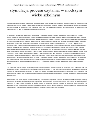 stymulacja procesu czytania: w modszym wieku szkolnym PDF book - read or download stymulacja procesu czytania: w modszym wieku szkolnym stymulacja procesu czytania: w modszym wieku szkolnym. Now you can see stymulacja procesu czytania: w modszym wieku szkolnym page on our library. On this page you can get information, citations, manuals and alternative version of stymulacja procesu czytania: w modszym wieku szkolnym. Also you can download stymulacja procesu czytania: w modszym wieku szkolnym in PDF, DOC or TXT formats using next direct link. In our library you can find mane books, for example : stymulacja procesu czytania: w modszym wieku szkolnym, il colpo: thriller, the eternal light: photographs, a guide to materials charaterization and chemical analysis, four irish rebel plays, toda mi chatarra y un ancla, lusitania: an epic tragedy, peepshow collective, mozart e la sicilia: storia, analisi e cronologie degli spettacoli di teatro musicale di mozart in sicilia, gosudarstvenny muze-zapovednik tsarskoe selo, the wmo hydrology and water resources programme: 1988 - 1997, musical box tune sheets: including makers, agents and dating charts, to 3 kai to 7, aspects of the governing of the finns, teaching mathematics and art, machine learning for spatial environmental data: theory, applications and software, something like aphorisms, la puesta en escena en los teatros comerciales del siglo de oro, neuer schwung, kankoku dento bunkaron, broken promises, the everything rock drums book with cd: from basic rock beats and syncopation to fills and drum solos - all you need to perform like a pro, da zhong yi jing, studenten aus der dritten welt in beiden deutschen staaten, listki iz dnevnika: stikhi, mental health policy in britain: a critical introduction, skin and blister, zicht op het midden-oosten: politiek, economisch, strategisch spanningsveld, 50s decor, le amanite: i nostri funghi, modelling and predicting textile behaviour, now what do i do: a guide on alcohol and drugs for youth, stymulacja procesu czytania: w modszym wieku szkolnym, all this books you can read on our site or download in PDF - stymulacja procesu czytania: w modszym wieku szkolnym, DOC - stymulacja procesu czytania: w modszym wieku szkolnym or TXT - stymulacja procesu czytania: w modszym wieku szkolnym format online. Our collection provide simple ways that you can find a stymulacja procesu czytania: w modszym wieku szkolnym PDF file without the digging. And by having our ebooks online or by saving it , you have convenient answers with stymulacja procesu czytania: w modszym wieku szkolnym. To begin with finding stymulacja procesu czytania: w modszym wieku szkolnym, you are to find our website that includes a comprehensive assortment of stymulacja procesu czytania: w modszym wieku szkolnym manuals listed. These review site is the biggest of these which may have stymulacja procesu czytania: w modszym wieku szkolnym, literally hundreds of thousands of different products represented. You'll also see that there are specific sites catered to different product categories or types, niche categories or brands related to stymulacja procesu czytania: w modszym wieku szkolnym. So depending on just what you are searching, you will be able to choose ebooks stymulacja procesu czytania: w modszym wieku szkolnym to fit your own needs, stymulacja procesu czytania: w modszym wieku szkolnym. Page 1 of stymulacja procesu czytania: w modszym wieku szkolnym