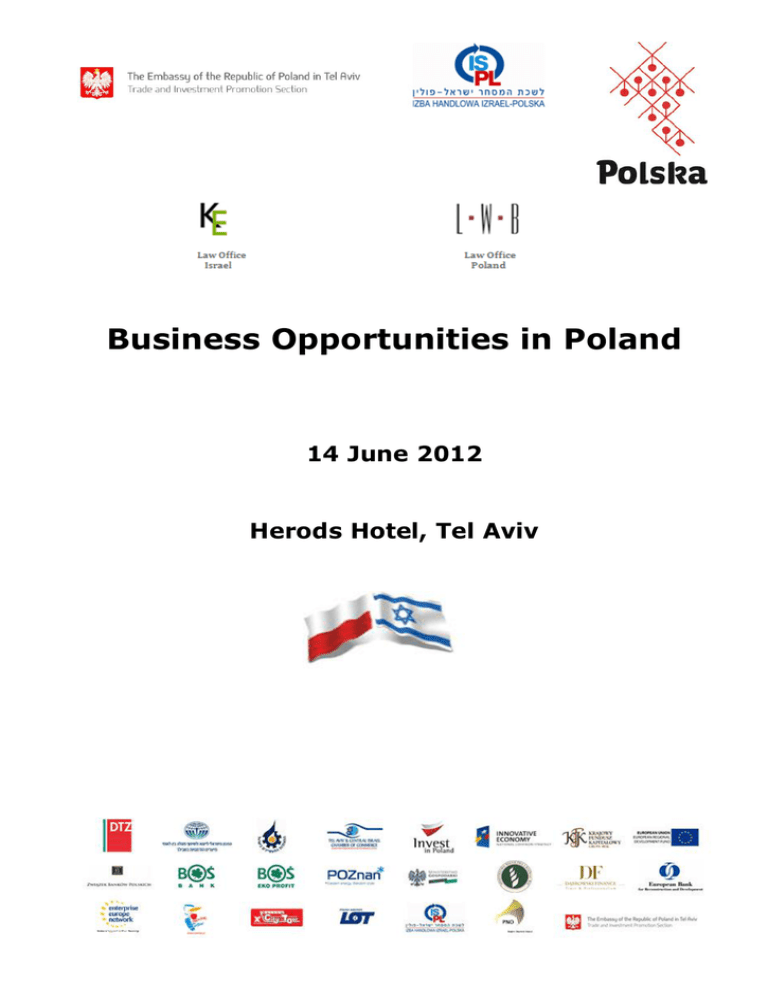 Business Opportunities in Poland 14 June 2012 Herods Hotel, Tel Aviv Date: 14 June 2012 Location: Herods Hotel Hayarkon 155 Tel-Aviv, Israel Organized by: Trade & Investment Promotion Section Embassy of the Republic of Poland in Tel Aviv In cooperation with: Israel – Poland Chamber of Commerce Partners: LWB & Partners Law Office, Warsaw Knebel & Co Law Offices, Tel-Aviv Conference’s aim: To expose to Israeli companies, entrepreneurs and investors the range of business opportunities in Poland, in order to encourage cooperation, business relations and investments in Poland, which is one of Europe's leading economies. The conference shall cover the following business activities: jointinvestments with the public sector, infrastructure, financing, high-tech, environmental protection, real-estate and agriculture. High ranked representatives of Polish authorities and business sectors in Poland shall speak at the conference, and shall give the participants practical options for business development and financing. Among the participants – the deputy minister of economy, the president of the Polish investment agency, the president of the banks association, the ambassador of Poland, etc. The second part of the conference shall be dedicated to personal meetings with the speakers, subject to prior reservation. Conference Program 08.30 – 09.00 Registration of the participants / coffee and refreshments 09.00 – 09.30 Welcoming words Moderator: Anna Lengiewicz (LWB) and Elroy Knebel (KE) 09.30 – 09.50 09.50 – 10.10 Shalom Simhon, Israeli Industry, Trade and Labor Minister Jacek Chodorowicz, Ambassador of the Republic of Poland Ilona Antoniszyn-Klik, Undersecretary of State of the Ministry of Economy of the Republic of Poland Henryk Lewiński, President of the Israeli-Polish Chamber of Commerce The current status and perspectives of the economic co-operation between Israel and Poland Ryszard Szelągowski, Economic Counselor of the Embassy of the Republic of Poland Marek Zieliński, Counselor - Head of the Section of the Trade & Investment Promotion Section of the Embassy of the Republic of Poland Investors’s support program through PAIiIZ Slawomir Majman, President of the Polish Information and Foreign Investment Agency (PAIiIZ) 10.10 – 10.30 Improvement of the credit market in Poland Krzysztof Pietraszkiewicz, President of the Association of the Polish Banks-Związek Banków Polskich 10.30 – 11.10 Success story of the Israeli company investing in Poland Egged, Aroma, Giza Polish Ventures 11.10 – 11.30 Coffee and refreshments 11.30 – 13.10 Workshop I – Infrastructure, recycling, real estate and financing Anna Lengiewicz – Moderator 11.30 – 11.50 Poznan municipality– PPP project/investment opportunities- Katia Loźina, Deputy Head of the Investor Relations Department of City of Poznan, Dominika Błaszyk, Specialist for investor relations of the Investor Relations Department of City of Poznan 11.50 – 12.10 Warsaw municipality– PPP project/investment opportunities- Paweł Pawłowski, Director of Investors Service Department of City of Warsaw 12.10 – 12.30 Waste treatment– Cezary Starczewski, Expert in the Ministry of the Envionment, Previous-Director of the Envrionmental Information Centre in the Ministry of the Envionment 12.30 – 12.50 Infrastructure financing- Agnieszka Szymczyk, Senior Banker, EBRD 12.50 – 13.10 Real estate prospects in the Polish market- Patrick Delcol, President of DTZ 11.30 – 13.10 Workshop II – agriculture, Hi-Tech and advanced technologies, financing incentive schemes Elroy Knebel, Dorota Kobylecka - Moderators 11.30 – 11.50 Development of agri-food sector in Poland- Dariusz Goszczyński, Director of the Promotion and Communication of the Ministry of Agriculture and Rural Development 11.50 – 12.10 Financing of the Hi-Tech and advanced technologies- Piotr Ćwik, Investment Director, Krajowy Fundusz Kapitałowy 12.10 – 12.30 BOS Group approach to foreign investors- Krzysztof Telega, VicePresident of Bank Ochrony Środowiska, Bartłomiej Pawlak, President of BOŚ Eko Profit S.A. 12.30 – 12.50 How to finance your investments in Poland. Banks, Stock Exchange, Bonds and other opportunities-Jarosław Dąbrowski, Dąbrowski Finance 12.50 – 13.10 Investment support systems – Polish government and European Union, Paul van Kooperen, Managing Partner PNO CEE 13.10 – 14.20 Lunch break 14.30 – 17.00 Meetings between Israeli investors and Polish representatives upon prior arrangement to be coordinated in few meetings rooms