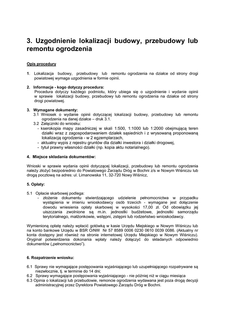 3. Uzgodnienie lokalizacji budowy, przebudowy lub remontu ogrodzenia Opis procedury 1. Lokalizacja budowy, przebudowy lub remontu ogrodzenia na działce od strony drogi powiatowej wymaga uzgodnienia w formie opinii. 2. Informacje - kogo dotyczy procedura: Procedura dotyczy każdego podmiotu, który ubiega się o uzgodnienie i wydanie opinii w sprawie lokalizacji budowy, przebudowy lub remontu ogrodzenia na działce od strony drogi powiatowej. 3. Wymagane dokumenty: 3.1 Wniosek o wydanie opinii dotyczącej lokalizacji budowy, przebudowy lub remontu ogrodzenia na danej działce – druk 3.1. 3.2 Załączniki do wniosku: - kserokopia mapy zasadniczej w skali 1:500, 1:1000 lub 1:2000 obejmującą teren działki wraz z zagospodarowaniem działek sąsiednich i z wrysowaną proponowaną lokalizacją ogrodzenia - w 2 egzemplarzach, - aktualny wypis z rejestru gruntów dla działki inwestora i działki drogowej, - tytuł prawny własności działki (np. kopia aktu notarialnego). 4. Miejsce składania dokumentów: Wnioski w sprawie wydania opinii dotyczącej lokalizacji, przebudowy lub remontu ogrodzenia należy złożyć bezpośrednio do Powiatowego Zarządu Dróg w Bochni z/s w Nowym Wiśniczu lub drogą pocztową na adres: ul. Limanowska 11, 32-720 Nowy Wiśnicz, 5. Opłaty: 5.1 Opłacie skarbowej podlega: - złożenie dokumentu stwierdzającego udzielenie pełnomocnictwa w przypadku wystąpienia w imieniu wnioskodawcy osób trzecich - wymagane jest dołączenie dowodu wniesienia opłaty skarbowej w wysokości 17,00 zł. Od obowiązku jej uiszczania zwolnione są m.in. jednostki budżetowe, jednostki samorządu terytorialnego, małżonkowie, wstępni, zstępni lub rodzeństwo wnioskodawcy. Wymienioną opłatę należy wpłacić gotówką w kasie Urzędu Miejskiego w Nowym Wiśniczu lub na konto bankowe Urzędu w BSR O/NW Nr 57 8589 0006 0230 0610 0039 0086. (Aktualny nr konta dostępny jest również na stronie internetowej Urzędu Miejskiego w Nowym Wiśniczu). Oryginał potwierdzenia dokonania wpłaty należy dołączyć do składanych odpowiednio dokumentów („pełnomocnictwo”). 6. Rozpatrzenie wniosku: 6.1 Sprawy nie wymagające postępowania wyjaśniającego lub uzupełniającego rozpatrywane są niezwłocznie, tj. w terminie do 14 dni; 6.2 Sprawy wymagające postępowania wyjaśniającego - nie później niż w ciągu miesiąca 6.3 Opinia o lokalizacji lub przebudowie, remoncie ogrodzenia wydawana jest poza drogą decyzji administracyjnej przez Dyrektora Powiatowego Zarządu Dróg w Bochni. 7. Tryb odwoławczy: Od opinii nie przysługuje odwołanie. 8. Podstawa prawna: - art. 43 ust. 1 i ust. 2, ustawy z dnia 21 marca 1985 r. o drogach publicznych (tekst jednolity: Dz. U. z 2007r. Nr 19, poz. 115, z późniejszymi zmianami), - Kodeks postępowania administracyjnego (tekst jednolity: Dz. U. z 2000r., Nr 98, poz. 1071, z późniejszymi zmianami); - Ustawa o opłacie skarbowej (tekst jednolity: Dz. U. z 2006r., Nr 225, poz. 1635, z późniejszymi zmianami) 9. Dostępność procedury: Procedura jest dostępna w siedzibie Powiatowego Zarządu Dróg w Bochni z/s w Nowym Wiśniczu, 32-720 Nowy Wiśnicz, ul. Limanowska 11 lub na stronie internetowej: www.pzd.bochnia.pl. Procedura dotyczy dróg powiatowych na terenie Powiatu Bocheńskiego