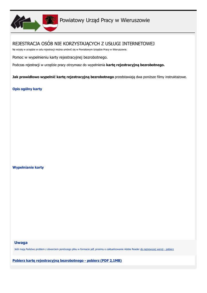 Powiatowy Urząd Pracy w Wieruszowie REJESTRACJA OSÓB NIE KORZYSTAJĄCYCH Z USŁUGI INTERNETOWEJ Na wizytę w urzędzie w celu rejestracji można umówić się w Powiatowym Urzędzie Pracy w Wieruszowie. Pomoc w wypełnieniu karty rejestracyjnej bezrobotnego. Podczas rejestracji w urzędzie pracy otrzymasz do wypełnienia kartę rejestracyjną bezrobotnego. Jak prawidłowo wypełnić kartę rejestracyjną bezrobotnego przedstawiają dwa poniższe filmy instruktażowe. Opis ogólny karty Wypełnianie karty Uwaga Jeśli mają Państwo problem z otwarciem poniższego pliku w formacie pdf, prosimy o zaktualizowanie Adobe Reader do najnowszej wersji - pobierz Pobierz kartę rejestracyjną bezrobotnego - pobierz (PDF 2,1MB)