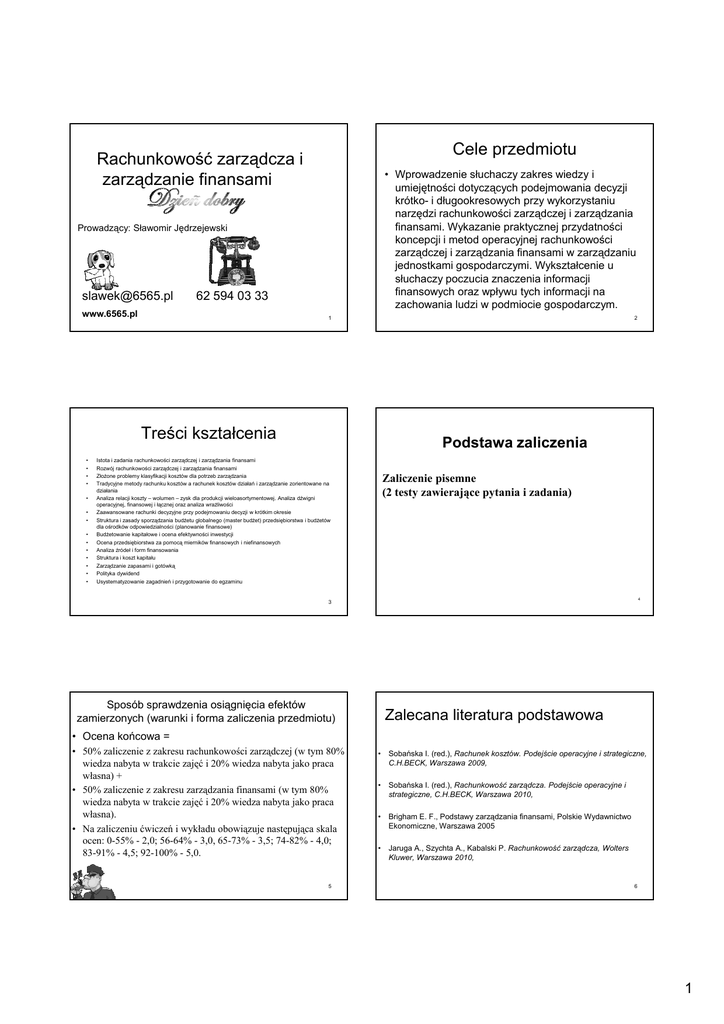 Rachunkowość zarządcza i zarządzanie finansami Cele przedmiotu