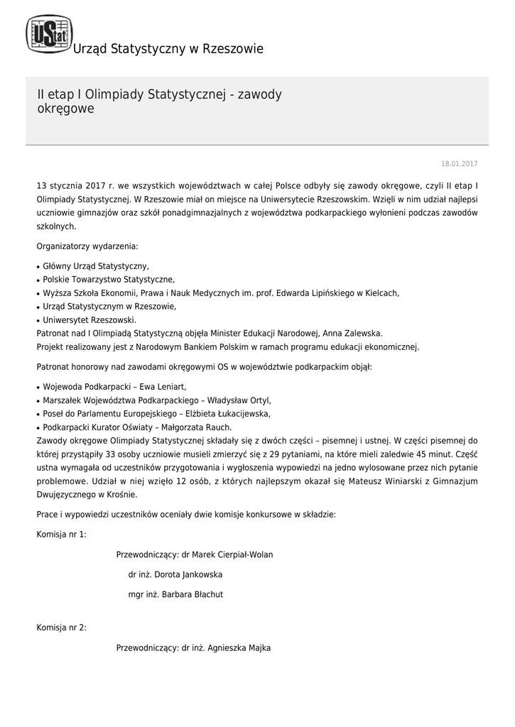 Urząd Statystyczny w Rzeszowie II etap I Olimpiady Statystycznej - zawody okręgowe 18.01.2017 13 stycznia 2017 r. we wszystkich województwach w całej Polsce odbyły się zawody okręgowe, czyli II etap I Olimpiady Statystycznej. W Rzeszowie miał on miejsce na Uniwersytecie Rzeszowskim. Wzięli w nim udział najlepsi uczniowie gimnazjów oraz szkół ponadgimnazjalnych z województwa podkarpackiego wyłonieni podczas zawodów szkolnych. Organizatorzy wydarzenia: ● Główny Urząd Statystyczny, ● Polskie Towarzystwo Statystyczne, ● Wyższa Szkoła Ekonomii, Prawa i Nauk Medycznych im. prof. Edwarda Lipińskiego w Kielcach, ● Urząd Statystycznym w Rzeszowie, ● Uniwersytet Rzeszowski. Patronat nad I Olimpiadą Statystyczną objęła Minister Edukacji Narodowej, Anna Zalewska. Projekt realizowany jest z Narodowym Bankiem Polskim w ramach programu edukacji ekonomicznej. Patronat honorowy nad zawodami okręgowymi OS w województwie podkarpackim objął: ● Wojewoda Podkarpacki – Ewa Leniart, ● Marszałek Województwa Podkarpackiego – Władysław Ortyl, ● Poseł do Parlamentu Europejskiego – Elżbieta Łukacijewska, ● Podkarpacki Kurator Oświaty – Małgorzata Rauch. Zawody okręgowe Olimpiady Statystycznej składały się z dwóch części – pisemnej i ustnej. W części pisemnej do której przystąpiły 33 osoby uczniowie musieli zmierzyć się z 29 pytaniami, na które mieli zaledwie 45 minut. Część ustna wymagała od uczestników przygotowania i wygłoszenia wypowiedzi na jedno wylosowane przez nich pytanie problemowe. Udział w niej wzięło 12 osób, z których najlepszym okazał się Mateusz Winiarski z Gimnazjum Dwujęzycznego w Krośnie. Prace i wypowiedzi uczestników oceniały dwie komisje konkursowe w składzie: Komisja nr 1: Przewodniczący: dr Marek Cierpiał-Wolan dr inż. Dorota Jankowska mgr inż. Barbara Błachut Komisja nr 2: Przewodniczący: dr inż. Agnieszka Majka dr Agata Surówka dr Elżbieta Wojnar GRATULUJEMY ! Do etapu centralnego kwalifikuje się zwycięzca etapu okręgowego z każdego województwa oraz 54 uczestników ze wszystkich okręgów z największą liczbą punktów. Etap centralny odbędzie się 29 marca br. w Urzędzie Statystycznym w Rzeszowie (cz. pisemna) natomiast 19 kwietnia br. w siedzibie Głównego Urzędu Statystycznego w Warszawie (cz. ustna).