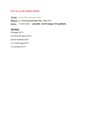 Prof. zw. dr hab. Marian Wesoły Temat: Arystoteles poprzez wieki. Miejsce: ul. Szamarzewskiego 89c, Sala 215 Godz.: 11.30-13.00 – czwartki od 23 lutego (15 spotkań) Terminy: 23 lutego 2017r. 2,9,16,23,30 marca 2017r. 6,20,27 kwietnia 2017r. 4,11,18,25 maja 2017r. 1,8 czerwca 2017r.