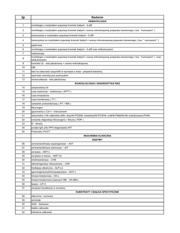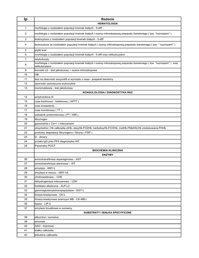 lp Badanie HEMATOLOGIA 1 morfologia z rozdziałem populacji krwinek białych - 5-diff 2 morfologia z rozdziałem populacji krwinek białych i oceną mikroskopową preparatu barwionego ( tzw. "rozmazem" ) 3 leukocytoza z rozdziałem populacji krwinek białych - 5-diff 4 leukocytoza ze rozdziałem populacji krwinek białych i oceną mikroskopową preparatu barwionego ( tzw. " rozmazem" ) 5 płytki krwi 6 morfologia z rozdziałem populacji krwinek białych - 5-diff oraz retikulocytami 7 retykulocyty 8 morfologia z rozdziałem populacji krwinek białych i oceną mikroskopową preparatu barwionego ( tzw. "rozmazem" ) oraz retikulocytami 9 komórki LE - test jakościowy + ocena mikroskopowa 10 OB. 11 test na obecność eozynofili w wymazie z nosa - preparat barwiony 12 oporność osmotyczna erytrocytów 13 mononukleoza - test jakościowy 14 antytrombina III 15 czas kaolinowo - kefalinowy ( APTT ) 16 czas krwawienia 17 czas trombinowy ( TT ) 18 wskaźnik protrombinowy ( PT / INR ) 19 fibrynogen 20 gazometria z Ca++ i mleczanami 21 oksymetria ( Hb całkowita-ctHb; oksyHb-FO2Hb; karboksyHb-FCOHb; matHb-FMetHb;Hb zredukowana-FHHb 22 produkty degradacji fibrynogenu i fibryny ( FDP ) 23 D - dimery 24 p/ciała IgG p/ko PF4 diagnostyka HIT 25 Parametry POCT KOAGULOLOGIA I DIAGNOSTYKA RKZ BIOCHEMIA KLINICZNA ENZYMY 26 aminotransferaza asparaginowa – AST 27 aminotransferaza alaninowa – AlT 28 amylaza - AMY-L 29 amylaza w moczu - AMY-UL 30 cholinoesteraza – CHE 31 dehydrogenaza mleczanowa – LDH 32 fosfataza alkaliczna - ALP-L2 33 gammaglutamylotranspeptydaza - GGT-L 34 kinaza kreatynowa - CK-L 35 kinaza kreatynowa izoenzym MB - CK-MB-L 36 lipaza - LIP-C 37 amylaza trzustkowa w surowicy 38 albumina / surowica 39 amoniak 40 ASO - ilościowo 41 białko całkowite 42 bilirubina całkowita SUBSTRATY I BIAŁKA SPECYFICZNE 43 bilirubina bezpośrednia 44 cholesterol całkowity 45 cholesterol - HDL metoda bezpośrednia 46 cholesterol - LDL metoda bezpośrednia 47 CRP - ilościowo 48 czynnik reumatoidalny RF 49 ferrytyna 50 fosforany nieorganiczne : surowica/mocz 51 glukoza - hemolizat krwi pełnej 52 glukoza : surowica/mocz/pmr 53 glukoza po obciążeniu 54 Hb-glikowana ( HbA1C ) 55 IgA 56 IgG 57 IgM 58 "jonogram" ( Na+;K+;Cl- ) 59 kreatynina : surowica/mocz 60 kwas moczowy : surowica/mocz 61 magnez : surowica/mocz 62 mocznik : surowica/mocz 63 odczyn lateksowy R 64 proteinogram 65 "profil lipidowy" = CH całk. + HDL + LDL oznacz.+ TG 66 immunofiksacja surowica 67 trójglicerydy - TG 68 utajona zdolność wiązania żelaza - UIBC 69 całkowita zdolność wiązania żelaza - TIBC 70 wapń całkowity : surowica/mocz 71 WWT - wskaźnik wysycenia transferyny 72 żelazo 73 fruktozamina 74 transferyna 75 barbiturany w surowicy/moczu półilościowo 76 benzodiazepiny w surowicy/moczu półilościowo 77 digoksyna w surowicy LEKI I TRUCIZNY ANALITYKA OGÓLNA 78 albumina w moczu 79 badanie ogólne kału 80 badanie ogólne moczu ( z mikroskopową oceną osadu ) 81 białko w moczu - ilościowo 82 glukoza w moczu - ilościowo 83 glukoza w pmr - ilościowo 84 glukoza + związki ketonowe w moczu (test paskowy) 85 H.pylori p/ciała w surowicy - test jakościowy 86 H.pylori antygen w kale - test jakościowy 87 kał na obecność pasożytów 88 krew utajona w kale 89 lamblie w kale - test jakościowy 90 liczba Addisa 91 ocena eozynofilii w preparacie z plwociny 92 płyny z jam ciała 93 płyn stawowy 94 popłuczyny z drzewa oskrzelowego 95 próba ciążowa surowica / mocz 96 wymaz na obecność plemników 97 Białko Bence-Jonesa 98 Kalprotektyna w kale IMMUNOCHEMIA diagnostyka tarczycy : 99 TSH 100 FT4 101 FT3 102 anti - TPO - p/ciała antyperoksydazowe 103 anti - TG - p/ciała p/ko tyreoglobulinie diagnostyka hormonalna : 104 PTH - parathormon 105 ACTH 106 DHEA-S 107 Estradiol 108 FSH 109 Kortyzol 110 LH 111 Prolaktyna 112 Testosteron II markery nowotworowe : 113 AFP - alfa-fetoproteina 114 B-HCG 115 CEA - antygen karcinoembrionalny 116 CA 125 - antygen nowotworowy 125 117 HE4 - ludzkie białko komórek nabłonkowych najądrza 4 118 wskaźnik ROMA ( CA 125 + HE4 ) 119 PSA całk. 120 PSA wolne 121 CA19-9 122 Troponina - T 123 CK-MB mass. 124 mioglobina 125 NT-pro BNP 126 HBsAg 127 HBsAg - test potwierdznia 128 anti - HBs - p/ciała p/ko antygenowi powierzchniowemu B 129 anti - HBc ( core ) - p/ciała p/ko antygenowi rdzenia wirusa B 130 anti - HCV - p/ciała przeciwko WZW typu C 131 CMV IgG - p/ciała IgG p/ko wirusowi cytomegalii 132 CMV IgM - p/ciała IgM p/ko wirusowi cytomegalii 133 CMV IgG - awidność 134 Toxo IgG - p/ciała IgG p/ko T. gondii markery kardiologiczne : markery chorób zakaźnych : 135 Toxo IgM - p/ciała IgM p/ko T. gondii 136 Toxo IgG - awidność inne : 137 IgE całkowita 138 vit. B-12 139 PCT - prokalcytonina 140 25- (OH) vit. D3 141 Kwas foliowy 142 Wolne lekkie łańcuchy kappa 143 Wolne lekkie łańcuchy lambda IMMUNOGLOBULINY