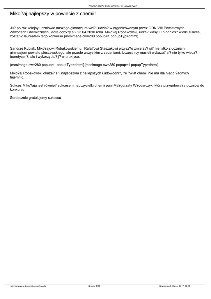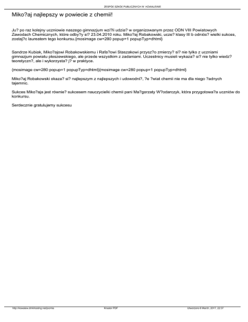 Zawodach Chemicznych, które odby?y si? 23.04.2010 roku. Miko?aj Robakowski, ucze? klasy III b odniós? wielki sukces,
