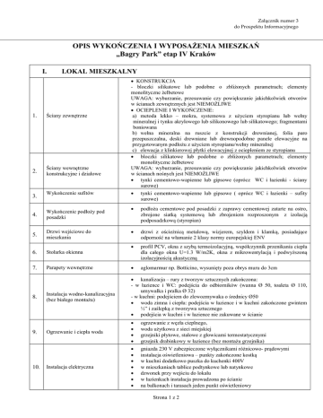 Załącznik numer 3 do Prospektu Informacyjnego OPIS WYKOŃCZENIA I WYPOSAŻENIA MIESZKAŃ „Bagry Park” etap IV Kraków I. LOKAL MIESZKALNY 1. Ściany zewnętrzne 2. Ściany wewnętrzne konstrukcyjne i działowe 3. Wykończenie sufitów KONSTRUKCJA - bloczki silikatowe lub podobne o zbliżonych parametrach; elementy monolityczne żelbetowe UWAGA: wyburzanie, przesuwanie czy powiększanie jakichkolwiek otworów w ścianach zewnętrznych jest NIEMOŻLIWE OCIEPLENIE I WYKOŃCZENIE: a) metoda lekko – mokra, systemowa z użyciem styropianu lub wełny mineralnej i tynku akrylowego lub silikonowego lub silikatowego; fragmentami boniowana b) wełna mineralna na ruszcie z konstrukcji drewnianej, folia paro przepuszczalna, deski drewniane lub drewnopodobne panele elewacyjne na przygotowanym podłożu z użyciem styropianu/wełny mineralnej c) elewacja z klinkierowej płytki elewacyjnej z ociepleniem ze styropianu bloczki silikatowe lub podobne o zbliżonych parametrach; elementy monolityczne żelbetowe UWAGA: wyburzanie, przesuwanie czy powiększanie jakichkolwiek otworów w ścianach nośnych jest NIEMOŻLIWE tynki cementowo-wapienne lub gipsowe (oprócz WC i łazienki - ściany surowe) tynki cementowo-wapienne lub gipsowe ( oprócz WC i łazienki – sufity surowe) podłoża cementowe pod posadzki z zaprawy cementowej zatarte na ostro, zbrojone siatką systemową lub zbrojeniem rozproszonym z izolacją podposadzkową (styropian) drzwi z ościeżnicą metalową, wizjerem, szyldem i klamką, posiadające odporność na włamanie 2 klasy normy europejskiej ENV profil PCV, okna z szybą termoizolacyjną, współczynnik przenikania ciepła dla całego okna U=1.3 W/m2K, okna z mikrowentylacją i podwyższoną izolacyjnością akustyczną aglomarmur np. Botticino, wysunięty poza obrys muru do 3cm 4. Wykończenie podłoży pod posadzki 5. Drzwi wejściowe do mieszkania 6. Stolarka okienna 7. Parapety wewnętrzne Instalacja wodno-kanalizacyjna (bez białego montażu) kanalizacja – rury z tworzyw sztucznych zakończona: - w łazience i WC: podejścia do odbiorników (wanna Ø 50, toaleta Ø 110, umywalka i pralka Ø 32) - w kuchni: podejściem do zlewozmywaka o średnicy Ø50 woda zimna i ciepła: podejścia w łazience i w kuchni zakończone gwintem ½” i zaślepką z tworzywa sztucznego podejścia w kuchni i w łazience nie zakuwane w ścianie Ogrzewanie i ciepła woda ogrzewanie z węzła cieplnego, woda użytkowa z sieci miejskiej grzejniki płytowe, stalowe z głowicami termostatycznymi grzejnik drabinkowy w łazience (bez montażu grzejnika) Instalacja elektryczna gniazda 230 V zabezpieczone wyłącznikami różnicowo- prądowymi instalacja oświetleniowa – punkty zakończone kostką w kuchni dodatkowo puszka do kuchenki 400V w mieszkaniach tablice podtynkowe lub natynkowe dzwonek przy wejściu do lokalu w łazienkach instalacja prowadzona po ścianie na balkonach i tarasach jeden punkt oświetleniowy 8. 9. 10. Strona 1 z 2 Załącznik numer 3 do Prospektu Informacyjnego 11. Instalacja internetowa 12. Instalacja telefoniczna okablowanie z jednym punktem na mieszkanie, bez osprzętu (świadczenie usług internetowych na podstawie odrębnej umowy z operatorem), okablowanie z jednym punktem na mieszkanie, z osprzętem (świadczenie usług telefonicznych na podstawie odrębnej umowy z operatorem), okablowanie z jednym punktem na mieszkanie dla telewizji satelitarnej, z osprzętem (świadczenie usług telewizyjnych na podstawie odrębnej umowy z operatorem), okablowanie z jednym punktem na mieszkanie dla telewizji kablowej, bez osprzętu (świadczenie usług telewizyjnych na podstawie odrębnej umowy z operatorem), okablowanie z jednym punktem na mieszkanie dla telewizji cyfrowej naziemnej wraz z osprzętem 13. Instalacja telewizyjna 14. 15. Instalacja domofonowa Tarasy nad garażami aparat naścienny z możliwością podłączenia wideodomofonu posadzka z kostki lub płyt betonowych lub posadzka z desek i legarów impregnowanych balustrady stalowe lub aluminiowe malowane proszkowo z wypełnieniem szkłem bezpiecznym lub metalowymi tralkami płytki i cokoliki gresowe, mrozoodporne lub posadzka z desek i legarów impregnowanych balustrady stalowe lub aluminiowe malowane proszkowo z wypełnieniem szkłem bezpiecznym lub metalowymi tralkami. 16. Balkony II. GARAŻ/ SCHOWKI/KOMÓRKI LOKATORSKIE 1. Ściany zewnętrzne żelbetowe monolityczne 2. Ściany wewnętrzne żelbetowe monolityczne lub silikatowe 3. Płyta posadzkowa posadzka betonowa przemysłowa utwardzona powierzchniowo 4. Strop nad garażem żelbetowy monolityczny, docieplony na parterze w obrębie pomieszczeń ogrzewanych 1 piętra 5. Pomieszczenia techniczne posadzka betonowa przemysłowa utwardzona powierzchniowo lub płytki gresowe mrozoodporne lub wylewka cementowa zatarta na ostro drzwi do pomieszczeń technicznych systemowe 6. Komórki lokatorskie/ schowki/ zaplecza postojowe w garażu 7 Instalacje wydzielone ściankami działowymi nietynkowane, z drzwiami lub rozwiązanie systemowe modułowe posadzka betonowa przemysłowa utwardzona powierzchniowo lub płytki gresowe mrozoodporne lub wylewka cementowa zatarta na ostro wentylacja mechaniczna w garażu instalacja oświetlenia podstawowego, awaryjnego i ewakuacyjnego wentylacja mechaniczna instalacja kanalizacji wraz z odwodnieniem system detekcji CO i LPG III. KOMUNIKACJA WEWNĘTRZNA - KLATKI SCHODOWE 1. Ściany wewnętrzne i sufity tynk ciepłochronny lub metoda lekka-mokra z użyciem wełny malowanie farbą 2. Spoczniki, schody płytki gresowe 3. Instalacja oświetleniowa oświetlenie i osprzęt dostosowany do wymogów oświetlenia schodowego W przypadku trudności w nabyciu danego rodzaju materiału, może być zastosowany materiał zastępczy o porównywalnej jakości. Strona 2 z 2