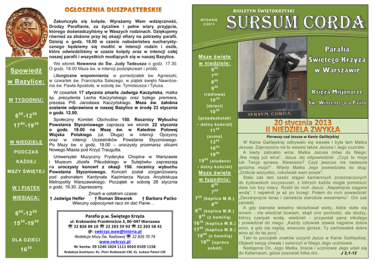 BIULETYN ŚWIĘTOKRZYSKI Zakończyła się kolęda. Wyrażamy Wam wdzięczność, Drodzy Parafianie, za życzliwe i pełne wiary przyjęcie, którego doświadczyliśmy w Waszych rodzinach. Dziękujemy również za złożone przy tej okazji ofiary na potrzeby parafii. Dzisiaj o godz. 18.00 w czasie nabożeństwa eucharystycznego będziemy się modlić w intencji rodzin i osób, które odwiedziliśmy w czasie kolędy oraz w intencji całej naszej parafii i wszystkich modlących się w naszej Bazylice. Spowiedź w Bazylice: W TYGODNIU : 00 6 -12 00 17 00 -19 30 W NIEDZIELĘ PODCZAS We wtorek Nowenna do Św. Judy Tadeusza o godz. 17.30. O godz. 18.00 Msza św. w intencji podziękowań i próśb. Liturgiczne wspomnienia: w poniedziałek św. Agnieszki, w czwartek św. Franciszka Salezego, w piątek święto Nawrócenia św. Pawła Apostoła, w sobotę św. Tymoteusza i Tytusa. W czwartek 17 stycznia zmarła Jadwiga Kaczyńska, matka śp. prezydenta Lecha Kaczyńskiego oraz byłego premiera, prezesa PiS Jarosława Kaczyńskiego. Msza św. żałobna zostanie odprawiona w naszej Bazylice w środę 23 stycznia o godz. 12.00. Społeczny Komitet Obchodów 150. Rocznicy Wybuchu Powstania Styczniowego zaprasza we wtorek 22 stycznia o godz. 18.00 na Mszę św. w Katedrze Polowej Wojska Polskiego (ul. Długa) w intencji Ojczyzny oraz w intencji Uczestników Powstania Styczniowego. Po Mszy św. o godz. 19.00 – uroczysty przemarsz ulicami Nowego Miasta pod Krzyż Traugutta. Uniwersytet Muzyczny Fryderyka Chopina w Warszawie KAŻDEJ i Muzeum Józefa Piłsudskiego w Sulejówku zapraszają na uroczysty koncert z okazji 150. rocznicy wybuchu MSZY ŚWIĘTEJ Powstania Styczniowego. Koncert został zorganizowany pod patronatem Kardynała Kazimierza Nycza Arcybiskupa Metropolity Warszawskiego. Początek w sobotę 26 stycznia o godz. 19.30. Zapraszamy. W I PIĄTEK Zmarli w ostatnim czasie: MIESIĄCA : † Jadwiga Helfer † Roman Skwarek † Barbara Paćko Wieczny odpoczynek racz im dać Panie… 6 00 -12 00 30 15 -19 30 DLA DZIECI 16 30 Parafia p.w. Świętego Krzyża ul. Krakowskie Przedmieście 3, 00–047 Warszawa 22 826 89 10 22 203 59 93 22 203 58 41 @: [email protected] Redakcja Mszy Św. Radiowej 22 826 70 74 www.swkrzyz.pl Nr konta: 59 1240 1024 1111 0010 0109 1158 Redakcja biuletynu: Ks. Piotr Rutkowski CM, Ks. Łukasz Patoń CM W Y D AN I E 3/ 2 01 3 Msze święte w niedziele: 600 700 800 900 (radiowa) 10 3 0 (dzieci) 10 3 0 ( przedszkolaki - dolny kościół) 11 4 5 (suma) Pierwszy cud Jezusa w Kanie Galilejskiej W Kanie Galilejskiej odbywało się wesele i była tam Matka 13 00 Jezusa. Zaproszono na to wesele także Jezusa i Jego uczniów. 16 A kiedy zabrakło wina, Matka Jezusa mówi do Niego: 19 0 0 „Nie mają już wina”. Jezus Jej odpowiedział: „Czyż to moja 19 0 0 (studenci lub Twoja sprawa, Niewiasto? Czyż jeszcze nie nadeszła - dolny kościół) godzina moja?”. Wtedy Matka Jego powiedziała do sług: „Zróbcie wszystko, cokolwiek wam powie”. Msze święte Stało zaś tam sześć stągwi kamiennych przeznaczonych w tygodniu: do żydowskich oczyszczeń, z których każda mogła pomieścić 600 dwie lub trzy miary. Rzekł do nich Jezus: „Napełnijcie stągwie 700 wodą”. I napełnili je aż po brzegi. Potem do nich powiedział: 30 7 (kaplica M.B.) „Zaczerpnijcie teraz i zanieście staroście weselnemu”. Oni zaś zanieśli. 800 A gdy starosta weselny skosztował wody, która stała się 8 3 0 (kaplica M.B.) winem - nie wiedział bowiem, skąd ono pochodzi, ale słudzy, 9 0 0 (z homilią) którzy czerpali wodę, wiedzieli - przywołał pana młodego 30 16 (kaplica M.B.) i powiedział do niego: „Każdy człowiek stawia najpierw dobre 17 0 0 (kaplica M.B.) wino, a gdy się napiją, wówczas gorsze. Ty zachowałeś dobre wino aż do tej pory”. 18 0 0 (z homilią) Taki to początek znaków uczynił Jezus w Kanie Galilejskiej. 19 0 0 ( oprócz Objawił swoją chwałę i uwierzyli w Niego Jego uczniowie. sobót) Następnie On, Jego Matka, bracia i uczniowie Jego udali się do Kafarnaum, gdzie pozostali kilka dni. J 2,1-12 00 Kancelaria Posłuszeństwo Chrystusowi jest zbawcze! Jest rzeczą znamienną, że Pan Jezus zapoczątkowuje parafialna: cudowne znaki, które mają prowadzić do wiary w Niego i objawić Jego chwałę, na weselu w Kanie Galilejskiej. w dni powszednie Swoją obecnością Chrystus chce uświęcić związek mężczyzny i kobiety, który utworzył Bóg na samym w godzinach. początku. Dzisiaj Pan Jezus tego dzieła uświęcenia 1000 - 1200 małżeństwa dokonuje w sakramencie małżeństwa, aby życie małżonków, dzięki otrzymanej łasce Bożej, oraz stawało się drogą ich uświęcenia, prowadziło do zbawienia. 1600 - 1800 Maryja, obecna także w Kanie Galilejskiej, uczy nas dostrzegania ludzkich trosk i kłopotów oraz tego, abyśmy w soboty zwracali się z ufnością, z prośbą o pomoc, do Jej boskiego Syna. Ona sama też, jako pierwsza prosi Jezusa za nas – w godzinach jest naszą Orędowniczką, ale przede wszystkim prosi nas, 1000 - 1200 abyśmy czynili wszystko, cokolwiek mówi nam Jej Syn (por. J 2, 5). Ks. Proboszcz 25 stycznia Nabożeństwa Święto nawrócenia św. Pała Apostoła Tego dnia, w 1617 roku, św. Wincenty a Paulo wygłosił i Nowenny: Niedziela w Folleville kazanie o spowiedzi generalnej. On sam traktował godz. 1800 to wydarzenie, jako początek misji parafialnych oraz jako Nabożeństwo początek Zgromadzenia Misji. Eucharystyczne Księża Misjonarze (pracujący także w naszej Bazylice św. Krzyża) obecnie przeżywają ten dzień, jako święto Poniedziałek godz. 1830 rocznicy założenia swojego Zgromadzenia. Nabożeństwo do św. Wincentego a Paulo Wtorek godz. 1730 Nowenna do św. Judy Tadeusza (po nabożeństwie Zygmunt Robert Msza św. w intencji Berdychowski CM próśb i podziękowań) Środa przyjmuje w środy godz. 1830 Anioł Pański 18-25 stycznia – Tydzień modlitw o jedność chrześcijan Gromadzimy się w ty