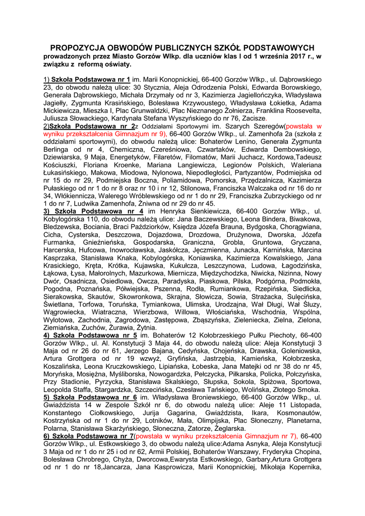 PROPOZYCJA OBWODÓW PUBLICZNYCH SZKÓŁ PODSTAWOWYCH prowadzonych przez Miasto Gorzów Wlkp. dla uczniów klas I od 1 września 2017 r., w związku z reformą oświaty. 1) Szkoła Podstawowa nr 1 im. Marii Konopnickiej, 66-400 Gorzów Wlkp., ul. Dąbrowskiego 23, do obwodu należą ulice: 30 Stycznia, Aleja Odrodzenia Polski, Edwarda Borowskiego, Generała Dąbrowskiego, Michała Drzymały od nr 3, Kazimierza Jagiellończyka, Władysława Jagiełły, Zygmunta Krasińskiego, Bolesława Krzywoustego, Władysława Łokietka, Adama Mickiewicza, Mieszka I, Plac Grunwaldzki, Plac Nieznanego Żołnierza, Franklina Roosevelta, Juliusza Słowackiego, Kardynała Stefana Wyszyńskiego do nr 76, Zacisze. 2)Szkoła Podstawowa nr 2z Oddziałami Sportowymi im. Szarych Szeregów(powstała w wyniku przekształcenia Gimnazjum nr 9), 66-400 Gorzów Wlkp., ul. Zamenhofa 2a (szkoła z oddziałami sportowymi), do obwodu należą ulice: Bohaterów Lenino, Generała Zygmunta Berlinga od nr 4, Chemiczna, Czereśniowa, Czwartaków, Edwarda Dembowskiego, Dziewiarska, 9 Maja, Energetyków, Filaretów, Filomatów, Marii Juchacz, Kordowa,Tadeusz Kościuszki, Floriana Kroenke, Mariana Langiewicza, Legionów Polskich, Waleriana Łukasińskiego, Makowa, Miodowa, Nylonowa, Niepodległości, Partyzantów, Podmiejska od nr 15 do nr 29, Podmiejska Boczna, Poliamidowa, Pomorska, Przędzalnicza, Kazimierza Pułaskiego od nr 1 do nr 8 oraz nr 10 i nr 12, Stilonowa, Franciszka Walczaka od nr 16 do nr 34, Włókiennicza, Walerego Wróblewskiego od nr 1 do nr 29, Franciszka Zubrzyckiego od nr 1 do nr 7, Ludwika Zamenhofa, Żniwna od nr 29 do nr 45. 3) Szkoła Podstawowa nr 4 im Henryka Sienkiewicza, 66-400 Gorzów Wlkp., ul. Kobylogórska 110, do obwodu należą ulice: Jana Baczewskiego, Leona Bindera, Biwakowa, Bledzewska, Bociania, Braci Paździorków, Księdza Józefa Brauna, Bydgoska, Chorągwiana, Cicha, Cysterska, Deszczowa, Dojazdowa, Drozdowa, Drużynowa, Dworska, Józefa Furmanka, Gnieźnieńska, Gospodarska, Graniczna, Grobla, Gruntowa, Gryczana, Harcerska, Hufcowa, Inowrocławska, Jaskółcza, Jęczmienna, Junacka, Karnińska, Marcina Kasprzaka, Stanisława Knaka, Kobylogórska, Koniawska, Kazimierza Kowalskiego, Jana Krasickiego, Kręta, Krótka, Kujawska, Kukułcza, Leszczynowa, Ludowa, Łagodzińska, Łąkowa, Łysa, Małorolnych, Mazurkowa, Miernicza, Międzychodzka, Niwicka, Nizinna, Nowy Dwór, Osadnicza, Osiedlowa, Owcza, Paradyska, Piaskowa, Pilska, Podgórna, Podmokła, Pogodna, Poznańska, Półwiejska, Pszenna, Rodła, Rumiankowa, Rzepińska, Siedlicka, Sierakowska, Skautów, Skowronkowa, Skrajna, Słowicza, Sowia, Strażacka, Sulęcińska, Świetlana, Torfowa, Toruńska, Tymiankowa, Ulimska, Urodzajna, Wał Długi, Wał Śluzy, Wągrowiecka, Wiatraczna, Wierzbowa, Willowa, Włościańska, Wschodnia, Wspólna, Wylotowa, Zachodnia, Zagrodowa, Zastępowa, Zbąszyńska, Zieleniecka, Zielna, Zielona, Ziemiańska, Zuchów, Żurawia, Żytnia. 4) Szkoła Podstawowa nr 5 im. Bohaterów 12 Kołobrzeskiego Pułku Piechoty, 66-400 Gorzów Wlkp., ul. Al. Konstytucji 3 Maja 44, do obwodu należą ulice: Aleja Konstytucji 3 Maja od nr 26 do nr 61, Jerzego Bajana, Cedyńska, Chojeńska, Drawska, Goleniowska, Artura Grottgera od nr 19 wzwyż, Gryfińska, Jastrzębia, Kamieńska, Kołobrzeska, Koszalińska, Leona Kruczkowskiego, Lipiańska, Łobeska, Jana Matejki od nr 38 do nr 45, Moryńska, Mosiężna, Myśliborska, Nowogardzka, Pełczycka, Piłkarska, Policka, Połczyńska, Przy Stadionie, Pyrzycka, Stanisława Skalskiego, Słupska, Sokola, Spiżowa, Sportowa, Leopolda Staffa, Stargardzka, Szczecińska, Czesława Tańskiego, Wolińska, Złotego Smoka. 5) Szkoła Podstawowa nr 6 im. Władysława Broniewskiego, 66-400 Gorzów Wlkp., ul. Gwiaździsta 14 w Zespole Szkół nr 6, do obwodu należą ulice: Aleje 11 Listopada, Konstantego Ciołkowskiego, Jurija Gagarina, Gwiaździsta, Ikara, Kosmonautów, Kostrzyńska od nr 1 do nr 29, Lotników, Mała, Olimpijska, Plac Słoneczny, Planetarna, Polarna, Stanisława Skarżyńskiego, Słoneczna, Zatorze, Żeglarska. 6) Szkoła Podstawowa nr 7(powstała w wyniku przekształcenia Gimnazjum nr 7), 66-400 Gorzów Wlkp., ul. Estkowskiego 3, do obwodu należą ulice:Adama Asnyka, Aleja Konstytucji 3 Maja od nr 1 do nr 25 i od nr 62, Armii Polskiej, Bohaterów Warszawy, Fryderyka Chopina, Bolesława Chrobrego, Chyża, Dworcowa,Ewarysta Estkowskiego, Garbary,Artura Grottgera od nr 1 do nr 18,Jancarza, Jana Kasprowicza, Marii Konopnickiej, Mikołaja Kopernika, Juliusza Kossaka, Kosynierów Gdyńskich, Łazienki, Łużycka, Młyńska, Stanisława Moniuszki, Nadbrzeżna, Cypriana Kamila Norwida, Orla, Orląt Lwowskich, Plac Młyński, Pocztowa, Bolesława Prusa, Władysława Reymonta, Rzeźnicka, Henryka Sienkiewicza, Generała Sikorskiego od nr 10 do nr 125, Składowa, Spichrzowa od nr 7, Stara, Marii Skłodowskiej-Curie, Strzelecka, Karola Szymanowskiego, Juliana Tuwima, Wodna, Józefa Wybickiego, Stanisława Wyspiańskiego, Zaułek, Żelazna, Stefana Żeromskiego. 7) Szkoła Podstawowa nr 9 im. Jana Kochanowskiego, 66-400 Gorzów Wlkp., ul. Nowa 7, do obwodu należą ulice: Al. Ruchu Młodzieży Niezależnej, Generała Józefa Bema, Generała Zygmunta Berlinga od nr 1 do nr 3, Chmielna, Wojciecha Głowackiego, Nowa, Okólna, Marszałka Józefa Piłsudskiego, Księcia Józefa Poniatowskiego, Skromna, Józefa Sułkowskiego, Romualda Traugutta, Franciszka Walczaka od nr 13 do nr 15, Widok, Franciszka Zubrzyckiego od nr 8. 8) Szkoła Podstawowanr 10z Oddziałami Integracyjnymiim. Tadeusza Kościuszki, 66-400 Gorzów Wlkp., ul. Towarowa 21, do obwodu należą ulice: Akacjowa, Bracka, Brzozowa, Budowlanych, Fabryczna, Grabowa, Karola Hermy, Jasna, Jaśminowa, Jaworowa, Świętego Jerzego, Jutowa, Klonowa, Kolejowa, Kwiatowa, Lipowa, Malinowa, Małopolska, Mazowiecka, Mechaniczna, Morelowa, Orzechowa, Polna, Portowa, Prosta, Przemysłowa, Różana, Sielska, Spokojna, Spółdzielców, Księdza Augu