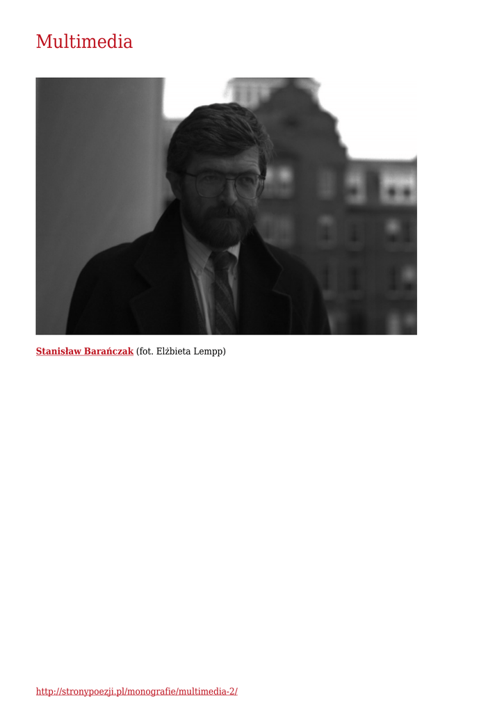 Multimedia Stanisław Barańczak (fot. Elżbieta Lempp) http://stronypoezji.pl/monografie/multimedia-2/ okładki książek poetyckich, eseistycznych, antologii i tomów poezji humorystycznej Stanisława Barańczaka Stanisław Barańczak film dokumentalny z cyklu Wybitne postacie Uniwersytetu (źródło: Uniwersytet im. Adama Mickiewicza w Poznaniu) Hymn poranny http://stronypoezji.pl/monografie/multimedia-2/ wiersz czyta Marek Kondrat (źródło: Wydawnictwo a5) Piosenka znad sufitu wiersz czyta Marek Kondrat (źródło: Wydawnictwo a5) Hymn wieczorny wiersz czyta Marek Kondrat (źródło: Wydawnictwo a5) Podróż zimowa: IX [Wyłączany telewizor…] wiersz czyta Marek Kondrat (źródło: Wydawnictwo a5) Podróż zimowa: XIX [Tablico moja hojnie rozdzielcza…] wiersz czyta Marek Kondrat (źródło: Wydawnictwo a5) Podróż zimowa: XX [Stając na czerwonym świetle…] wiersz czyta Marek Kondrat (źródło: Wydawnictwo a5) Podróż zimowa: XXI [Cmentarze samochodów…] wiersz czyta Marek Kondrat http://stronypoezji.pl/monografie/multimedia-2/ (źródło: Wydawnictwo a5) Płakała w nocy, ale nie jej płacz go zbudził wiersz czyta Marek Kondrat (źródło: Wydawnictwo a5) http://stronypoezji.pl/monografie/multimedia-2/