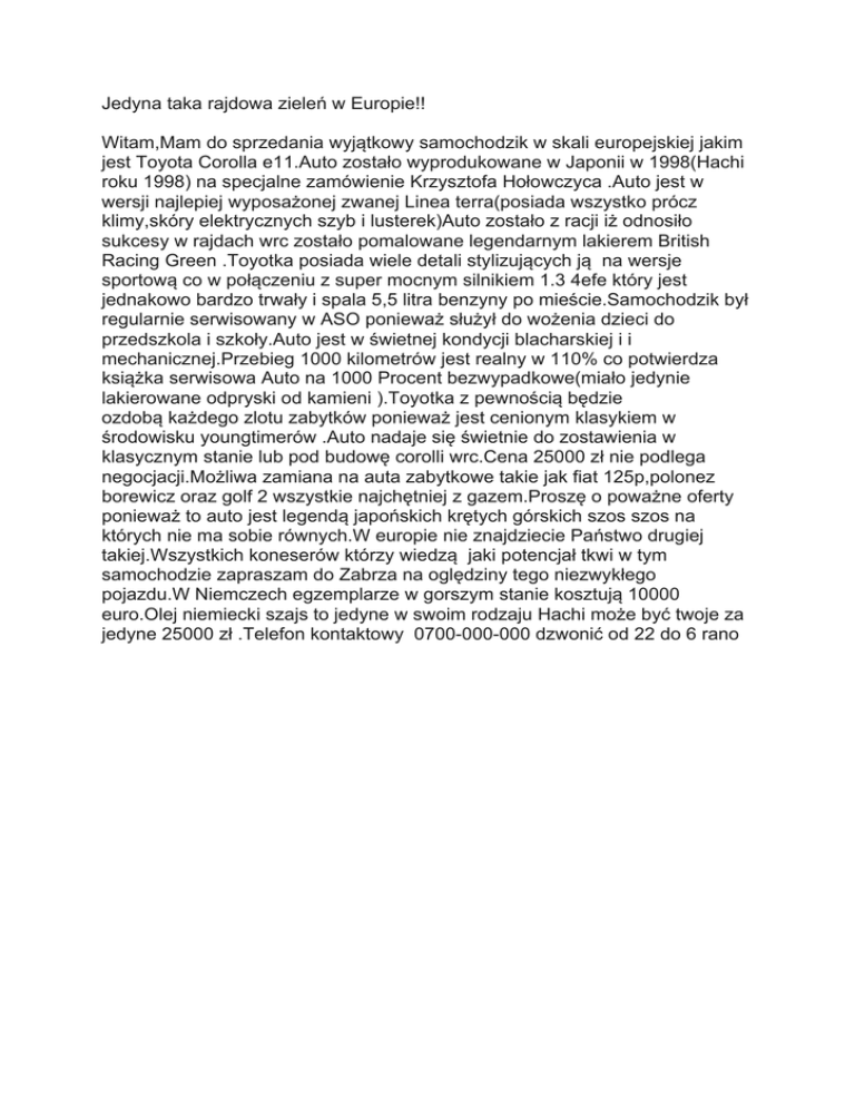 Jedyna taka rajdowa zieleń w Europie!! Witam,Mam do sprzedania wyjątkowy samochodzik w skali europejskiej jakim jest Toyota Corolla e11.Auto zostało wyprodukowane w Japonii w 1998(Hachi roku 1998) na specjalne zamówienie Krzysztofa Hołowczyca .Auto jest w wersji najlepiej wyposażonej zwanej Linea terra(posiada wszystko prócz klimy,skóry elektrycznych szyb i lusterek)Auto zostało z racji iż odnosiło sukcesy w rajdach wrc zostało pomalowane legendarnym lakierem British Racing Green .Toyotka posiada wiele detali stylizujących ją na wersje sportową co w połączeniu z super mocnym silnikiem 1.3 4efe który jest jednakowo bardzo trwały i spala 5,5 litra benzyny po mieście.Samochodzik był regularnie serwisowany w ASO ponieważ służył do wożenia dzieci do przedszkola i szkoły.Auto jest w świetnej kondycji blacharskiej i i mechanicznej.Przebieg 1000 kilometrów jest realny w 110% co potwierdza książka serwisowa Auto na 1000 Procent bezwypadkowe(miało jedynie lakierowane odpryski od kamieni ).Toyotka z pewnością będzie ozdobą każdego zlotu zabytków ponieważ jest cenionym klasykiem w środowisku youngtimerów .Auto nadaje się świetnie do zostawienia w klasycznym stanie lub pod budowę corolli wrc.Cena 25000 zł nie podlega negocjacji.Możliwa zamiana na auta zabytkowe takie jak fiat 125p,polonez borewicz oraz golf 2 wszystkie najchętniej z gazem.Proszę o poważne oferty ponieważ to auto jest legendą japońskich krętych górskich szos szos na których nie ma sobie równych.W europie nie znajdziecie Państwo drugiej takiej.Wszystkich koneserów którzy wiedzą jaki potencjał tkwi w tym samochodzie zapraszam do Zabrza na oględziny tego niezwykłego pojazdu.W Niemczech egzemplarze w gorszym stanie kosztują 10000 euro.Olej niemiecki szajs to jedyne w swoim rodzaju Hachi może być twoje za jedyne 25000 zł .Telefon kontaktowy 0700-000-000 dzwonić od 22 do 6 rano
