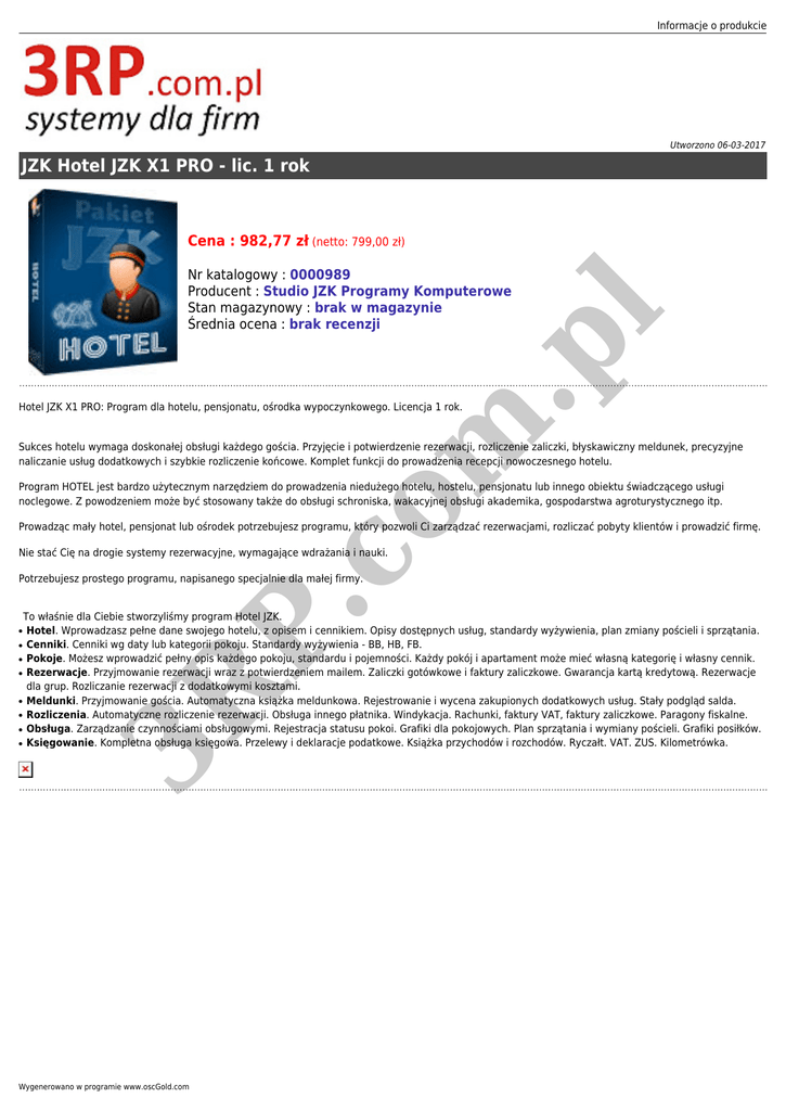Informacje o produkcie Utworzono 06-03-2017 JZK Hotel JZK X1 PRO - lic. 1 rok Cena : 982,77 zł (netto: 799,00 zł) .p l Nr katalogowy : 0000989 Producent : Studio JZK Programy Komputerowe Stan magazynowy : brak w magazynie Średnia ocena : brak recenzji co m Hotel JZK X1 PRO: Program dla hotelu, pensjonatu, ośrodka wypoczynkowego. Licencja 1 rok. Sukces hotelu wymaga doskonałej obsługi każdego gościa. Przyjęcie i potwierdzenie rezerwacji, rozliczenie zaliczki, błyskawiczny meldunek, precyzyjne naliczanie usług dodatkowych i szybkie rozliczenie końcowe. Komplet funkcji do prowadzenia recepcji nowoczesnego hotelu. Program HOTEL jest bardzo użytecznym narzędziem do prowadzenia niedużego hotelu, hostelu, pensjonatu lub innego obiektu świadczącego usługi noclegowe. Z powodzeniem może być stosowany także do obsługi schroniska, wakacyjnej obsługi akademika, gospodarstwa agroturystycznego itp. Prowadząc mały hotel, pensjonat lub ośrodek potrzebujesz programu, który pozwoli Ci zarządzać rezerwacjami, rozliczać pobyty klientów i prowadzić firmę. Nie stać Cię na drogie systemy rezerwacyjne, wymagające wdrażania i nauki. ● ● ● ● ● ● ● To właśnie dla Ciebie stworzyliśmy program Hotel JZK. Hotel. Wprowadzasz pełne dane swojego hotelu, z opisem i cennikiem. Opisy dostępnych usług, standardy wyżywienia, plan zmiany pościeli i sprzątania. Cenniki. Cenniki wg daty lub kategorii pokoju. Standardy wyżywienia - BB, HB, FB. Pokoje. Możesz wprowadzić pełny opis każdego pokoju, standardu i pojemności. Każdy pokój i apartament może mieć własną kategorię i własny cennik. Rezerwacje. Przyjmowanie rezerwacji wraz z potwierdzeniem mailem. Zaliczki gotówkowe i faktury zaliczkowe. Gwarancja kartą kredytową. Rezerwacje dla grup. Rozliczanie rezerwacji z dodatkowymi kosztami. Meldunki. Przyjmowanie gościa. Automatyczna książka meldunkowa. Rejestrowanie i wycena zakupionych dodatkowych usług. Stały podgląd salda. Rozliczenia. Automatyczne rozliczenie rezerwacji. Obsługa innego płatnika. Windykacja. Rachunki, faktury VAT, faktury zaliczkowe. Paragony fiskalne. Obsługa. Zarządzanie czynnościami obsługowymi. Rejestracja statusu pokoi. Grafiki dla pokojowych. Plan sprzątania i wymiany pościeli. Grafiki posiłków. Księgowanie. Kompletna obsługa księgowa. Przelewy i deklaracje podatkowe. Książka przychodów i rozchodów. Ryczałt. VAT. ZUS. Kilometrówka. 3R ● P. Potrzebujesz prostego programu, napisanego specjalnie dla małej firmy. Wygenerowano w programie www.oscGold.com