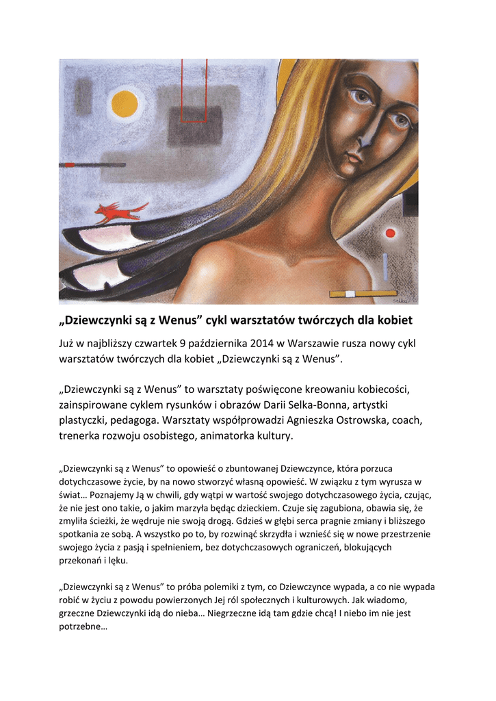 „Dziewczynki są z Wenus” cykl warsztatów twórczych dla kobiet Już w najbliższy czwartek 9 października 2014 w Warszawie rusza nowy cykl warsztatów twórczych dla kobiet „Dziewczynki są z Wenus”. „Dziewczynki są z Wenus” to warsztaty poświęcone kreowaniu kobiecości, zainspirowane cyklem rysunków i obrazów Darii Selka-Bonna, artystki plastyczki, pedagoga. Warsztaty współprowadzi Agnieszka Ostrowska, coach, trenerka rozwoju osobistego, animatorka kultury. „Dziewczynki są z Wenus” to opowieść o zbuntowanej Dziewczynce, która porzuca dotychczasowe życie, by na nowo stworzyć własną opowieść. W związku z tym wyrusza w świat… Poznajemy Ją w chwili, gdy wątpi w wartość swojego dotychczasowego życia, czując, że nie jest ono takie, o jakim marzyła będąc dzieckiem. Czuje się zagubiona, obawia się, że zmyliła ścieżki, że wędruje nie swoją drogą. Gdzieś w głębi serca pragnie zmiany i bliższego spotkania ze sobą. A wszystko po to, by rozwinąć skrzydła i wznieść się w nowe przestrzenie swojego życia z pasją i spełnieniem, bez dotychczasowych ograniczeń, blokujących przekonań i lęku. „Dziewczynki są z Wenus” to próba polemiki z tym, co Dziewczynce wypada, a co nie wypada robić w życiu z powodu powierzonych Jej ról społecznych i kulturowych. Jak wiadomo, grzeczne Dziewczynki idą do nieba… Niegrzeczne idą tam gdzie chcą! I niebo im nie jest potrzebne… Krocząc swoją drogą, Tytułowa Dziewczynka sama znajdzie w sobie swoje niebo. Odnajdujesz pewne elementy swojej historii w tej opowieści? Ty też pragniesz iść swoją drogą i znaleźć w sobie własne niebo, na przekór skostniałym stereotypom i schematom? Chcesz za pomocą środków plastycznych i aktywnych metod warsztatowych wykreować osobistą opowieść o potędze kobiecości w przyjaznej, kameralnej grupie kobiet? Spotkasz się ze swoją kreatywnością, odkryjesz zapomniane marzenia o twórczości, przecież możesz więcej niż sądzisz, że możesz. Weźmiesz kartkę papieru i farby do ręki, wymalujesz swoje emocje, opowiesz o swoich myślach i uczuciach, a wszystko po to, by zajrzeć w głąb siebie i doświadczyć radości tworzenia siebie na nowo. NIE MUSISZ POSIADAĆ ŻADNYCH ZDOLNOŚCI PLASTYCZNYCH, ABY UCZESTNICZYĆ W WARSZTACIE "DZIEWCZYNKI SĄ Z WENUS". TU LICZY SIĘ TWOJE ZAANGAŻOWANIE I PASJA. Czas 9 października 2014 godz. 18.00 – 20.00 Kolejne spotkania raz w tygodniu: pt 17.10, czw 23.10, czw 30.10. Cykl „Dziewczynki są z Wenus” potrwa do czerwca 2015 r. Miejsce Warszawa, ul. Chocimska 12 lok. 4, w sercu górnego Mokotowa, siedziba Drama Way Opłaty 50 zł - pierwsze spotkanie 9.10 Jeśli zdecydujesz się na udział we wszystkich zajęciach w październiku, za wszystkie zapłacisz 150 złotych. Abonament miesięczny od listopada – 300 zł Pojedynczy warsztat od 17.10. – 100 zł Tematy i obszary kolejnych warsztatów z cyklu „Dziewczynki są z Wenus”              Dzieciństwo Grzeczna czy niegrzeczna? Przestrzeń Marzenia Relacje Związki Bariery Wybory Finanse Złość Asertywność Samoakceptacja Kobiecość        Miłość Pasja Przyszłość Dojrzałość Przemijanie Drzewo afirmacji Portret Wenus Informacje i zapisy Agnieszka Ostrowska – kom. 517 145 119, [email protected] Daria Selka-Bonna – kom. 696 743 503, [email protected] Prowadzące Daria Selka-Bonna artystka plastyk, pedagog Twórczością plastyczną zajmuję się zawodowo od 1997 roku. Należę do Związku Polskich Artystów Plastyków i Stowarzyszenia Pastelistów Polskich. Malarstwo to dla mnie forma wyrażenia siebie i narzędzie, które pomaga mi nawiązać relację ze światem i z ludźmi. Każda zmiana we mnie i każda przeżyta emocja odnajdują swoje odbicie w mojej sztuce, podążam drogą „w głąb siebie”. Dzięki malarstwu albo przy jego pomocy pogłębiam samoświadomość. To rodzaj kontemplacji i przestrzeń, w której jestem sama ze sobą. Uważam, że dzięki twórczości zachowuję równowagę w życiu. Interesują mnie funkcje komunikacyjna i terapeutyczna sztuk plastycznych i zastosowanie ich w pracy pedagogicznej i terapeutycznej. Prowadziłam kursy dla nauczycieli z przedmiotu „Terapia plastyką”, pracowałam jako arteterapeutka, prowadziłam warsztaty dla kobiet. Prywatnie jestem mamą Ignacego, Olgi i Jasia. Okresowo opiekuję się ptakami. Wychowałam dziewięć ptaków: srokę, sójkę, kawkę, kosa, samiczkę kapturki, sierpówkę i trzy gołębie grzywacze. www.selka-bonna.com Agnieszka Ostrowska life coach & trenerka rozwoju osobistego Wspieram kobiety w procesach zmiany, w sytuacjach niełatwych wyborów, wątpliwości i obaw co do dalszej drogi osobistej i zawodowej. Z empatią i uważnością, korzystając z wiedzy i bogactwa własnych doświadczeń, towarzyszę kobietom w drodze kreowania osobistej marki, inspiruję w odkrywaniu talentów, rozwijaniu mocnych stron i czerpaniu z ich potencjału. W efekcie pracy ze mną kobiety wypracowują życiową misję oraz osobistą i zawodową markę, aby kreować swoje życie i aktywność zawodową w zgodzie ze swoimi marzeniami i pasjami. Pracuję wyłącznie z prywatnymi klientkami, na miarę ich indywidualnych potrzeb i oczekiwań. Nie współpracuję z korporacjami, gdzie coaching i konsulting odbywa się zazwyczaj pod dyktando szefa. Sama porzuciłam korporację, by realizować siebie, żyć w zgodzie ze sobą, swoim rytmem i naturalnym tempem. Dlatego dla mnie szefem jestem tylko ja. A klientkami indywidualne kobiety, każda wyjątkowa i niepowtarzalna, a wraz z nią jej rozwój, praca nad zmianą i satysfakcja z osobistego bądź biznesowego sukcesu, jaki czeka na nią na końcu naszej wspólnej drogi. Podczas pracy z grupą wykorzystuję aktywne metody warsztatowe, coaching, fotografię, dramę, relaks i wizualizację. Kocham stan bycia w drodze – wewnętrznej i fizycznej, rozwijając siebie i wpierając rozwój innych, a także odbywając codzienne pod