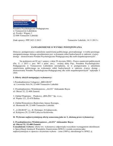 Poradnia Psychologiczno-Pedagogiczna w Tomaszowie Lubelskim ul. Żwirki i Wigury 2 22-600 Tomaszów Lubelski Znak sprawy: PPP.3421.2.2013 Tomaszów Lubelski, 14.11.2013 r. ZAWIADOMIENIE O WYNIKU POSTĘPOWANIA Dotyczy: postępowania o udzielenie zamówienia publicznego, prowadzonego w trybie przetargu nieograniczonego, którego przedmiotem jest: wykonanie robot budowlanych w zakresie „Łatwy dostęp – dostosowanie Poradni Psychologiczno-Pedagogicznej dla osób niepełnosprawnych”. Na podstawie art.92 ust 1 ustawy z dnia 29 stycznia 2004 r. Prawo zamówień publicznych (Dz. U. z 2013 r. poz. 907 z późn. zm.), zwanej dalej Pzp., Poradnia PsychologicznoPedagogiczna w Tomaszowie Lubelskim zawiadamia, że w postępowaniu o udzielenie zamówienia publicznego na wykonanie robót budowlanych w zakresie „Łatwy dostęp – dostosowanie Poradni Psychologiczno-Pedagogicznej dla osób niepełnosprawnych” wpłynęło 5 ofert. I. Oferty złożyli następujący wykonawcy: 1.Przedsiębiorstwo Usługowe „BRO-BUD” ul. Lwowska 56A/34, 22-600 Tomaszów Lubelski 2. Przedsiębiorstwo Wielobranżowe „ALEX” Aleksander Rayss ul. Okrzei 32, 22-400 Zamość 3. Zakład Wapienno – Piaskowy „BEŁŻEC” Sp. z o.o., ul. Wąska 121, 22-670 Bełżec 4. Zakład Remontowo-Budowlany Janusz Kurzępa, ul. Moniuszki 99, 22-600 Tomaszów Lubelski 5. „LUB-BUD” s.c., B. Dytmajer, D.Gębarowski, ul. Kolejowa 29, 22-680 Lubycza Królewska II. Wybrano najkorzystniejszą ofertę oznaczoną jako nr 2, złożoną przez wykonawcę: 2. Przedsiębiorstwo Wielobranżowe „ALEX” Aleksander Rayss ul. Okrzei 32, 22-400 Zamość Uzasadnienie wyboru: oferta ww. wykonawcy odpowiada wszystkim wymaganiom określonym w Specyfikacji Istotnych Warunków Zamówienia (SIWZ) i została oceniona jako najkorzystniejsza w oparciu o kryterium wyboru – cena (100%), określonego w SIWZ, tj. zawierała najniższą cenę. Oferta nie podlega odrzuceniu. W związku z powyższym uzyskała najwyższą ilość punktów – 100,00 w wyniku oceny ofert przeprowadzonej przez zamawiającego. Łączna ilość punktów, którą uzyskała oferta Nr 2 wynosi –100,00 pkt. Streszczenie oceny i porównania złożonych ofert: Oferta nr 1 - Przedsiębiorstwo Usługowe „BRO-BUD” ul. Lwowska 56A/34, 22-600 Tomaszów Lubelski – ilość punktów w kryterium cena – 99,99 pkt, razem 99,99 pkt.; Oferta nr 2 - 2. Przedsiębiorstwo Wielobranżowe „ALEX” Aleksander Rayss ul. Okrzei 32, 22-400 Zamość – ilość punktów w kryterium cena 100,00 pkt, razem 100,00 pkt.; Oferta nr 3 - Zakład Wapienno – Piaskowy „BEŁŻEC” Sp. z o.o., ul. Wąska 121, 22-670 Bełżec - ilość punktów w kryterium cena - 93,31 pkt., razem 93,31 pkt.; Oferta nr 4 - Zakład Remontowo-Budowlany Janusz Kurzępa, ul. Moniuszki 99, 22-600 Tomaszów Lubelski – ilość punktów w kryterium cena – 95,63 pkt., razem 95,63 pkt.; Oferta nr 5 - „LUB-BUD” s.c., B. Dytmajer, D.Gębarowski, ul. Kolejowa 29, 22-680 Lubycza Królewska – ilość punktów w kryterium cena – 85,73 pkt., razem 85,73 pkt. III. Z postępowania przetargowego nie wykluczono żadnego wykonawcy, ani nie odrzucono ofert. IV. Zamawiający informuje zgodnie z art. 92 ust. 1 ustawy Prawo zamówień publicznych, że umowa w sprawie zamówienia publicznego zostanie zawarta w terminie określonym w art. 94 ustawy Pzp. Zatwierdzam /-/ Anna Jarczak Otrzymują: 1.Przedsiębiorstwo Usługowe „BRO-BUD” ul. Lwowska 56A/34, 22-600 Tomaszów Lubelski 2. Przedsiębiorstwo Wielobranżowe „ALEX” Aleksander Rayss ul. Okrzei 32, 22-400 Zamość 3. Zakład Wapienno – Piaskowy „BEŁŻEC” Sp. z o.o., ul. Wąska 121, 22-670 Bełżec 4. Zakład Remontowo-Budowlany Janusz Kurzępa, ul. Moniuszki 99, 22-600 Tomaszów Lubelski 5. „LUB-BUD” s.c., B. Dytmajer, D.Gębarowski, ul. Kolejowa 29, 22-680 Lubycza Królewska 2 3