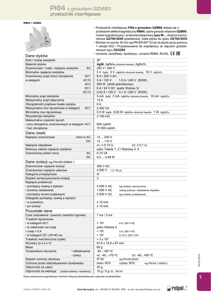 PI84 z gniazdem GZM80 przekaźniki interfejsowe RM84 + GZM80 •Przekaźnik interfejsowy PI84 z gniazdem GZM80 składa się z: przekaźnik elektromagnetyczny RM84, szare gniazdo wtykowe GZM80, moduł sygnalizacyjny / przeciwprzepięciowy typu M..., obejma wyrzutnikowa GZT80-0040 (plastikowa), biała płytka do opisu GZT80-0035 •Montaż na szynie 35 mm wg PN-EN 60715 lub na płycie (przy pomocy 1 wkręta M3) • Przystosowane do współpracy ze złączem grzebie niowym typu ZGGZ80 •Uznania, certyfikaty, dyrektywy: uznania RM84, RoHS, Dane styków Ilość i rodzaj zestyków Materiał styków Znamionowe / maks. napięcie zestyków AC Minimalne napięcie zestyków Znamionowy prąd (moc) obciążenia AC1 w kategorii AC15 AC3 DC1 DC13 Minimalny prąd zestyków Maksymalny prąd załączania Obciążalność prądowa trwała zestyku Maksymalna moc łączeniowa w kategorii AC1 Minimalna moc łączeniowa Rezystancja zestyków Maksymalna częstość łączeń • przy obciążeniu znamionowym w kategorii AC1 • bez obciążenia Napięcie znamionowe Napięcie odpadowe Roboczy zakres napięcia zasilania Znamionowy pobór mocy Dane izolacji wg PN-EN 60664-1 50/60 Hz AC DC AC DC 600 cykli/h 72 000 cykli/h 12 ... 240 V 12 ... 110 V AC: ≥ 0,15 Un DC: ≥ 0,1 Un patrz Tabele 1, 2 i Wykresy 4, 5 0,75 VA 0,4 ... 0,48 W Znamionowe napięcie izolacji Znamionowe napięcie udarowe Kategoria przepięciowa Stopień zanieczyszczenia izolacji Napięcie probiercze • pomiędzy cewką a stykami • przerwy zestykowej • pomiędzy torami prądowymi Odległość pomiędzy cewką a stykami • w powietrzu • po izolacji 300 V AC 4 000 V 1,2 / 50 µs III 3 Czas zadziałania / powrotu (wartości typowe) Trwałość łączeniowa • w kategorii AC1 • w zależności od cosφ • cosφ = 0,4 • w kategorii DC L/R=40 ms Trwałość mechaniczna (cykle) Wymiary (a x b x h) Masa Temperatura otoczenia • składowania • pracy Stopień ochrony obudowy Ochrona przed oddziaływaniem środowiska Odporność na udary Odporność na wibracje (zestyk zwierny / rozwierny) 7 ms / 3 ms Pozostałe dane 5 000 V AC 1 000 V AC 2 500 V AC typ izolacji: wzmocniona rodzaj przerwy: oddzielenie niepełne typ izolacji: podstawowa ≥ 10 mm ≥ 10 mm > 105 8 A, 250 V AC patrz Wykres 2 > 105 3 A, 250 V AC > 105 0,12 A, 220 V DC > 3 x 107 81,6 x 15,9 x 67 mm 60 g -40...+85 oC AC: -40...+70 oC DC: -40...+85 oC IP 20 wg PN-EN 60529 RM84: RTII GZM80: RT0 wg PN-EN 116000-3 20 g 10 g / 5 g 10...150 Hz Dane zaznaczone pogrubionym drukiem dotyczą standardowych wykonań przekaźników. www.relpol.com.pl Dzia³ Sprzeda¿y tel. +48 68 47 90 822, 850 • e-mail: [email protected] 19.04.2016 Dane cewki 2P AgNi, AgNi/Au złocenie twarde, AgSnO2 250 V / 440 V 5 V AgNi, 5 V AgNi/Au złocenie twarde, 10 V AgSnO2 8 A / 250 V AC 3 A / 120 V 1,5 A / 240 V (B300) 550 W (silnik jednofazowy) 8 A / 24 V DC (patrz Wykres 3) 0,22 A / 120 V 0,1 A / 250 V (R300) 5 mA AgNi, 2 mA AgNi/Au złocenie twarde, 10 mA AgSnO2 15 A 8A 2 000 VA 0,3 W AgNi, 0,05 W AgNi/Au złocenie twarde, 1 W AgSnO2 ≤ 100 mΩ 1 PI84 z gniazdem GZM80 przekaźniki interfejsowe Schematy połączeń (widok od strony zacisków śrubowych) Wymiary Płytka do opisu GZT80-0035 Gniazdo GZM80 Przekaźnik RM84 Obejma wyrzutnikowa GZT80-0040 COM Moduł typu M... NO 24 24 67 61-0,2 42,5 NC 21,5 COIL 35,3 78,1 81,6-0,2 Wersja DC 15,9-0,2 7 Wersja AC Sposób podłączenia obciążenia - gniazdo GZM80 8 A, 300 V AC 21 24 -A2 11 22 14 12 +A1 Złącze grzebieniowe typu ZGGZ80 Montaż Przekaźniki PI84 z gniazdem GZM80 ❶ przeznaczone są do bezpośredniego montażu na szynie 35 mm wg PN-EN 60715 lub na płycie (przy pomocy 1 wkręta M3). Połączenia: maks. przekrój przewodów (linka): 2 x 2,5 mm2 (2 x 14 AWG), długość odizolowania przewodów: 6,5 mm, maks. moment dokręcenia zacisku: 0,7 Nm. ❶ Gniazda wtykowe GZM80 przystosowane są do współpracy ze złączem grzebieniowym typu ZGGZ80. Złącze ZGGZ80 mostkuje wspólne sygnały wejść, maks. dopuszczalny prąd wynosi 10 A / 250 V AC. Możliwość połączenia 8 gniazd. Kolory złącz: ZGGZ80-1 szary, ZGGZ80-2 czarny (patrz str. 5). ZGGZ80 ŚRODKI OSTROŻNOŚCI: 1. Należy upewnić się, że parametry produktu opisane w jego specyfikacji zapewniają margines bezpieczeństwa dla prawidłowej pracy urządzenia lub systemu oraz bezwzględnie unikać użytkowania, które przekracza parametry produktu. 2. Nigdy nie dotykać części urządzenia produktu znajdującego się pod napięciem. 3. Należy upewnić się, że produkt podłączony jest prawidłowo. Nieprawidłowe podłączenie może spowodować złe działanie, nadmierne przegrzewanie oraz ryzyko powstania ognia. 4. Jeśli istnieje ryzyko, że wadliwa praca produktu mogłaby spowodować dotkliwe straty materialne lub zagrażać zdrowiu i życiu ludzi lub zwierząt, należy konstruować urządzenia lub systemy tak, aby wyposażone były w podwójny system bezpieczeństwa, gwarantujący niezawodną pracę. 19.04.2016 Złącze grzebieniowe ZGGZ80: mostkowanie wspólnych sygnałów wejść. 2 www.relpol.com.pl Dzia³ Sprzeda¿y tel. +48 68 47 90 822, 850 • e-mail: [email protected] PI84 z gniazdem GZM80 przekaźniki interfejsowe Trwałość łączeniowa w funkcji mocy obciążenia. Częstość łączeń: 600 cykli/h Współczynnik redukcji trwałości łączeniowej dla indukcyjnych obciążeń prądu przemiennego Wykres 2 Współczynnik redukcji Liczba łączeń N Wykres 1 Moc łączeniowa [kVA] Maksymalna zdolność łączeniowa dla prądu stałego. Obciążenie rezystancyjne Dopuszczalny zakres napięcia pracy cewki - napięcie stałe Wykres 4 U / Un Dopuszczalny zakres napięcia Wykres 5 pracy cewki - napięcie przemienne 50 Hz Temperatura otoczenia [°C] Temperatura otoczenia [°C] Opis do wykresów 4 i 5 A - zależność napięcia zadziałania od temperatury otoczenia przy braku obciążenia na stykach. Temperatura cewki i otoczenia są takie same przed zadziałaniem przekaźnika. Napięcie z