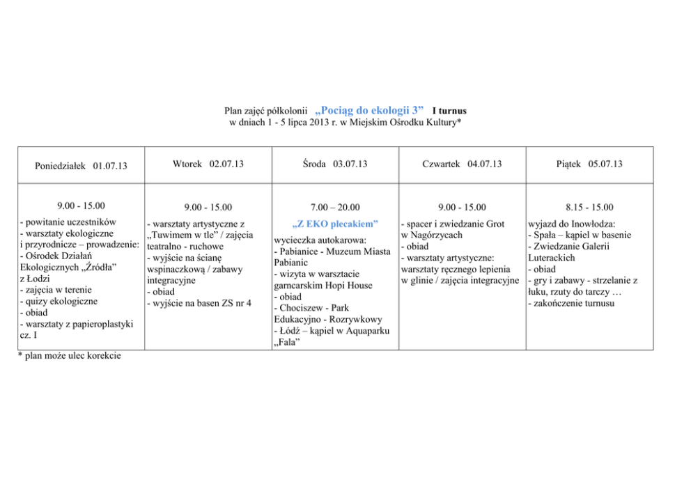 Plan zajęć półkolonii „Pociąg do ekologii 3” I turnus w dniach 1 - 5 lipca 2013 r. w Miejskim Ośrodku Kultury* Poniedziałek 01.07.13 Wtorek 02.07.13 Środa 03.07.13 Czwartek 04.07.13 Piątek 05.07.13 9.00 - 15.00 9.00 - 15.00 7.00 – 20.00 9.00 - 15.00 8.15 - 15.00 „Z EKO plecakiem” - spacer i zwiedzanie Grot w Nagórzycach - obiad - warsztaty artystyczne: warsztaty ręcznego lepienia w glinie / zajęcia integracyjne - powitanie uczestników - warsztaty ekologiczne i przyrodnicze – prowadzenie: - Ośrodek Działań Ekologicznych „Źródła” z Łodzi - zajęcia w terenie - quizy ekologiczne - obiad - warsztaty z papieroplastyki cz. I * plan może ulec korekcie - warsztaty artystyczne z „Tuwimem w tle” / zajęcia teatralno - ruchowe - wyjście na ścianę wspinaczkową / zabawy integracyjne - obiad - wyjście na basen ZS nr 4 wycieczka autokarowa: - Pabianice - Muzeum Miasta Pabianic - wizyta w warsztacie garncarskim Hopi House - obiad - Chociszew - Park Edukacyjno - Rozrywkowy - Łódź – kąpiel w Aquaparku „Fala” wyjazd do Inowłodza: - Spała – kąpiel w basenie - Zwiedzanie Galerii Luterackich - obiad - gry i zabawy - strzelanie z łuku, rzuty do tarczy … - zakończenie turnusu Plan zajęć półkolonii „Pociąg do ekologii 3” II turnus w dniach 8 – 12 lipca 2013 r. w Miejskim Ośrodku Kultury* Poniedziałek 08.07.13 Wtorek 09.07.13 Środa 10.07.13 Czwartek 11.07.13 Piątek 12.07.13 9.00 – 15.00 9.00 – 15.00 7.45 – 19.30 9.00 – 15.00 9.00 – 15.00 - warsztaty artystyczne: ozdabianie przedmiotów użytkowych techniką decoupage - X Miejski Konkurs Piosenki Turystycznej i Ekologicznej NATURA-lnie piosenka - obiad - wyjście na basen ZS nr 4 wyjazd do Ujazdu: - zwiedzanie Mikrokosmosu – Parku Edukacyjno – Rozrywkowego - zwiedzanie XVI w. kościołu - obiad - gry i zabawy integracyjno ruchowe – Podwórko naszych rodziców - zakończenie turnusu - powitanie uczestników - warsztaty ekologiczne i przyrodnicze prowadzenie Ośrodek Działań Ekologicznych „Źródła” z Łodzi - zajęcia w terenie - quizy ekologiczne obiad - wyjście na kręgielnię * plan może ulec korekcie - gry i zabawy integracyjno ruchowe – podchody - obiad - spotkanie z żywą lekcją historii - wiek XVI „Z EKO plecakiem” wycieczka autokarowa do Łodzi: - Muzeum Rozproszone EKO - TUWIM - gra miejska - Politechnika łódzka – lekcja o zielonej energii - Warsztaty kulinarne – samodzielne przygotowanie obiadu przez uczestników - Muzeum Fabryki - kąpiel w Aquaparku „Fala” Plan zajęć półkolonii „Pociąg do ekologii 3” III turnus w dniach 15 - 19 lipca 2013 r. w Miejskim Ośrodku Kultury* Poniedziałek 15.07.13 Wtorek 16.07.13 Środa 17.07.13 Czwartek 18.07.13 Piątek 19.07.13 9.00 – 15.00 9.00 – 15.00 7.00 – 20.00 9.00 – 15.00 8.30 – 15.00 - powitanie uczestników - warsztaty ekologiczne i przyrodnicze - prowadzenie Ośrodek Działań Ekologicznych „Źródła” z Łodzi - zajęcia w terenie - quizy ekologiczne - obiad - warsztaty artystyczne: czerpanie papieru / zajęcia taneczno – terapeutyczne * plan może ulec korekcie - warsztaty artystyczne z ŁDK-iem: (np.: plecionkarstwo, wikliniarstwo, papieroplastyka) - obiad - wyjście na basen ZS nr 4 - Dzień sportowy - obiad wycieczka autokarowa: - warsztaty z papieroplastyki - Przysucha - Muzeum im. cz. II / zajęcia relaksacyjno – Oskara Kolberga - Chlewiska - Muzeum Techniki terapeutyczne oraz zwiedzanie Zespołu Pałacowo – Parkowego - obiad - Kielce - Muzeum Narodowe „Z EKO plecakiem” - kąpiel w basenie wyjazd do Opoczna: - warsztaty artystyczne p. Zofia Pacan - kąpiel w basenie - obiad - zakończenie turnusu