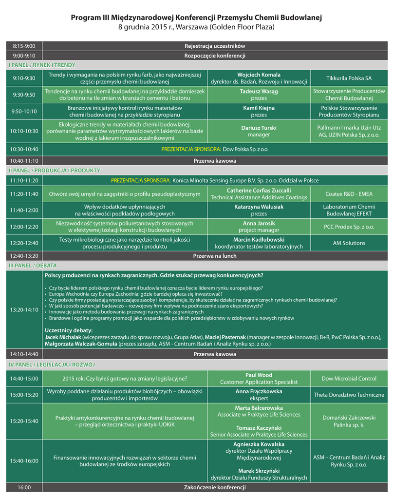 Program III Międzynarodowej Konferencji Przemysłu Chemii Budowlanej 8 grudnia 2015 r., Warszawa (Golden Floor Plaza) 8:15-9:00 Rejestracja uczestników 9:00-9:10 Rozpoczęcie konferencji I PANEL / RYNEK I TRENDY 9:10-9:30 Trendy i wymagania na polskim rynku farb, jako najważniejszej części przemysłu chemii budowlanej Wojciech Komala dyrektor ds. Badań, Rozwoju i Innowacji Tikkurila Polska SA 9:30-9:50 Tendencje na rynku chemii budowlanej na przykładzie domieszek do betonu na tle zmian w branżach cementu i betonu Tadeusz Wasąg prezes Stowarzyszenie Producentów Chemii Budowlanej 9:50-10:10 Branżowe inicjatywy kontroli rynku materiałów chemii budowlanej na przykładzie styropianu Kamil Kiejna prezes Polskie Stowarzyszenie Producentów Styropianu 10:10-10:30 Ekologiczne trendy w materiałach chemii budowlanej: porównanie parametrów wytrzymałościowych lakierów na bazie wodnej z lakierami rozpuszczalnikowymi Dariusz Turski manager Pallmann l marka Uzin Utz AG, UZIN Polska Sp. z o.o. 10:30-10:40 PREZENTACJA SPONSORA: Dow Polska Sp. z o.o. 10:40-11:10 Przerwa kawowa II PANEL / PRODUKCJA I PRODUKTY 11:10-11:20 PREZENTACJA SPONSORA: Konica Minolta Sensing Europe B.V. Sp. z o.o. Oddział w Polsce 11:20-11:40 Otwórz swój umysł na zagęstniki o profilu pseudoplastycznym Catherine Corfias Zuccalli Technical Assistance Additives Coatings Coatex R&D - EMEA 11:40-12:00 Wpływ dodatków upłynniających na właściwości podkładów podłogowych Katarzyna Walusiak prezes Laboratorium Chemii Budowlanej EFEKT 12:00-12:20 Niezawodność systemów poliuretanowych stosowanych w efektywnej izolacji konstrukcji budowlanych Anna Jarosik project manager PCC Prodex Sp. z o.o. 12:20-12:40 Testy mikrobiologiczne jako narzędzie kontroli jakości procesu produkcyjnego i produktu Marcin Kadłubowski koordynator testów laboratoryjnych AM Solutions Przerwa na lunch 12:40-13:20 III PANEL / DEBATA Polscy producenci na rynkach zagranicznych. Gdzie szukać przewag konkurencyjnych? 13:20-14:10 • • • • • • Czy bycie liderem polskiego rynku chemii budowlanej oznacza bycie liderem rynku europejskiego? Europa Wschodnia czy Europa Zachodnia: gdzie bardziej opłaca się inwestować? Czy polskie firmy posiadają wystarczające zasoby i kompetencje, by skutecznie działać na zagranicznych rynkach chemii budowlanej? W jaki sposób potencjał badawczo – rozwojowy firm wpływa na podnoszenie szans eksportowych? Innowacje jako metoda budowania przewagi na rynkach zagranicznych Branżowe i ogólne programy promocji jako wsparcie dla polskich przedsiębiorstw w zdobywaniu nowych rynków Uczestnicy debaty: Jacek Michalak (wiceprezes zarządu do spraw rozwoju, Grupa Atlas), Maciej Pasternak (manager w zespole Innowacji, B+R, PwC Polska Sp. z o.o.), Małgorzata Walczak-Gomuła (prezes zarządu, ASM - Centrum Badań i Analiz Rynku sp. z o.o.) Przerwa kawowa 14:10-14:40 IV PANEL / LEGISLACJA I ROZWÓJ 14:40-15:00 2015 rok: Czy byłeś gotowy na zmiany legislacyjne? Paul Wood Customer Application Specialist Dow Microbial Control 15:00-15:20 Wyroby poddane działaniu produktów biobójczych – obowiązki producentów i importerów Anna Frączkowska ekspert Theta Doradztwo Techniczne 15:20-15:40 15:40-16:00 16:00 Praktyki antykonkurencyjne na rynku chemii budowlanej – przegląd orzecznictwa i praktyki UOKiK Finansowanie innowacyjnych rozwiązań w sektorze chemii budowlanej ze środków europejskich Marta Balcerowska Associate w Praktyce Life Sciences Tomasz Kaczyński Senior Associate w Praktyce Life Sciences Agnieszka Kowalska dyrektor Działu Współpracy Międzynarodowej Marek Skrzyński dyrektor Działu Funduszy Strukturalnych Zakończenie konferencji Domański Zakrzewski Palinka sp. k. ASM – Centrum Badań i Analiz Rynku Sp. z o.o.